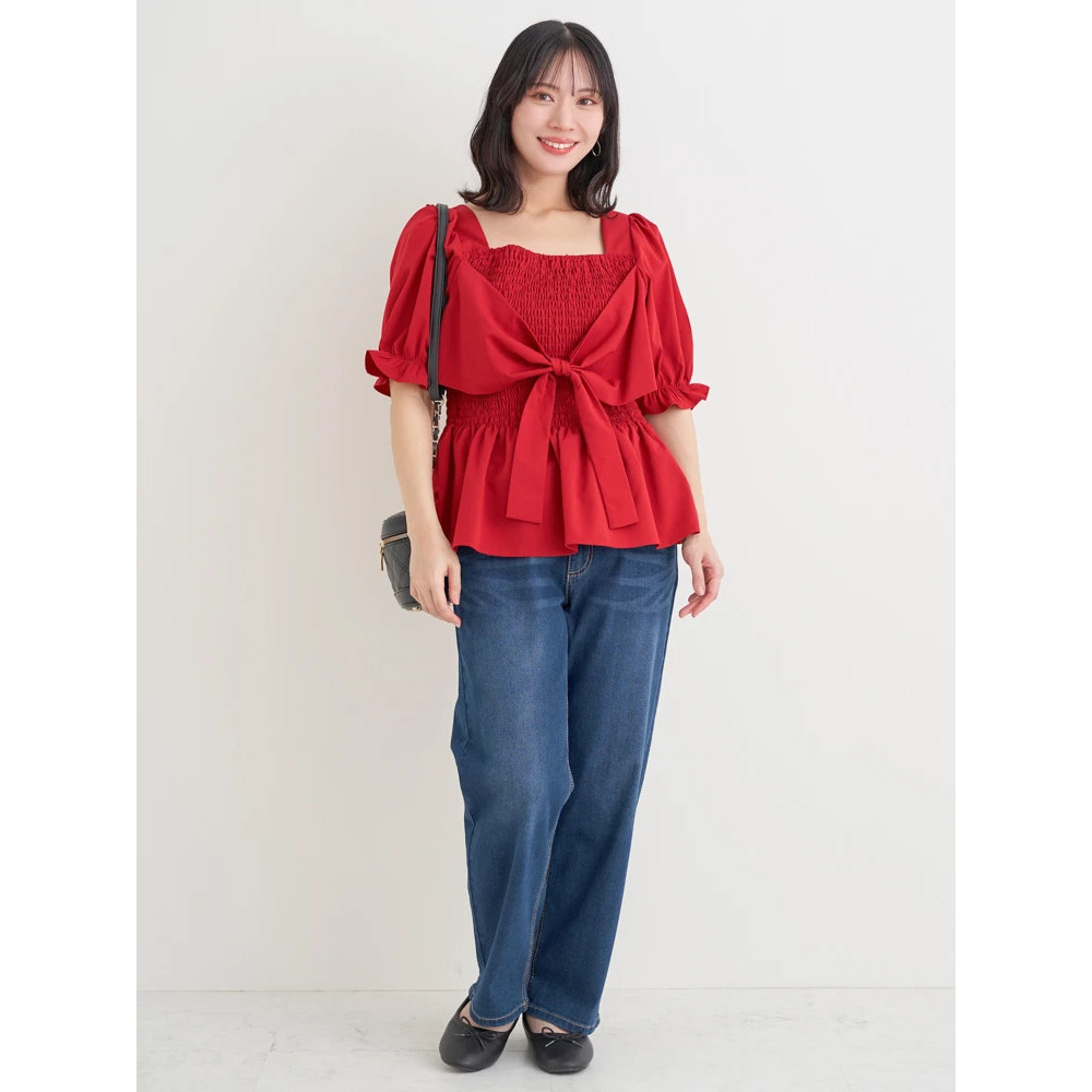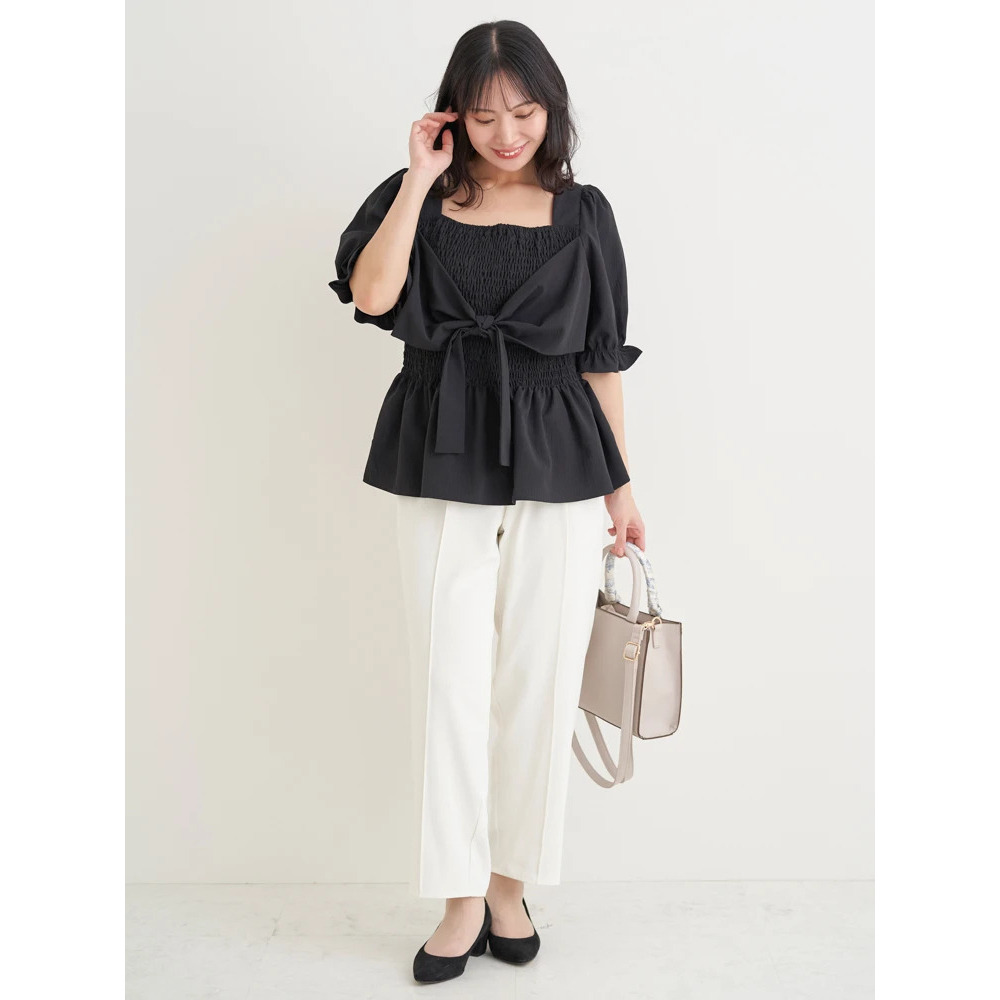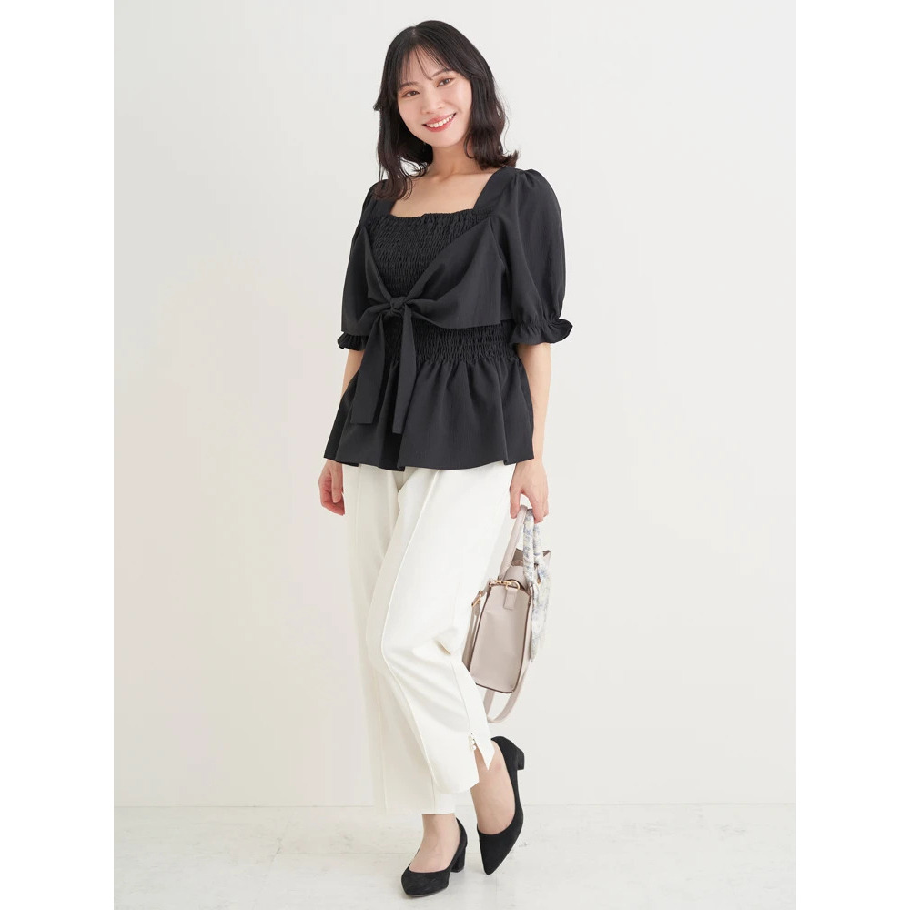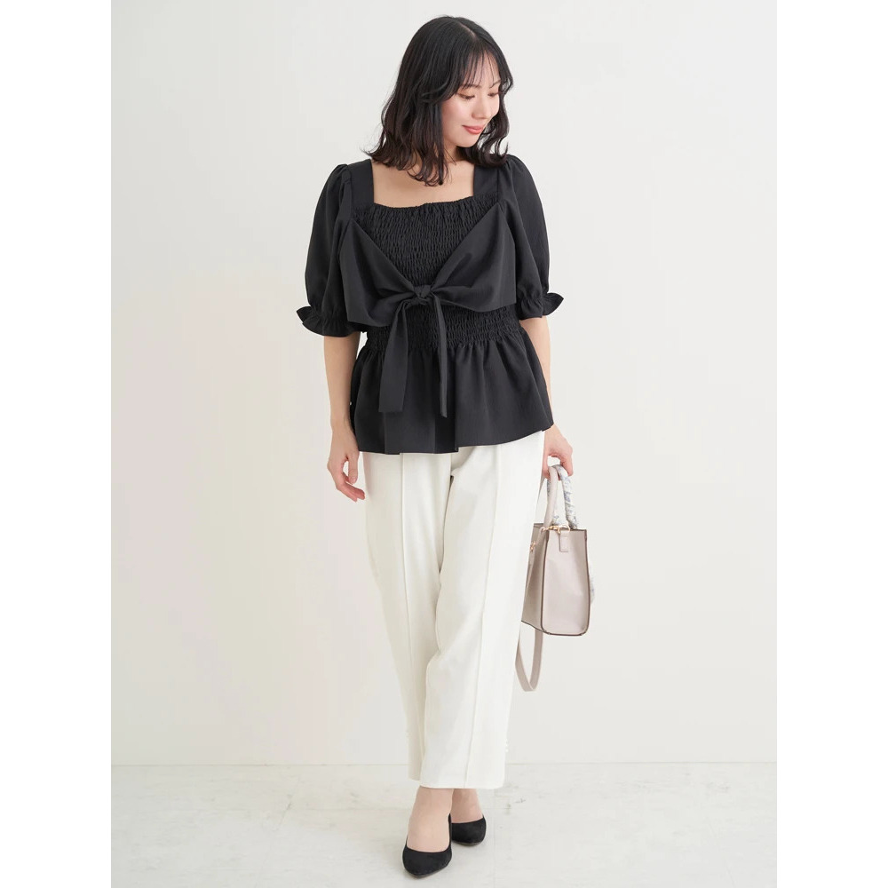 リボン使いのデザインが主役級ブラウスなので、シンプルなボトムスと合わせていただくだけでも華やぎスタイリングが完成♪