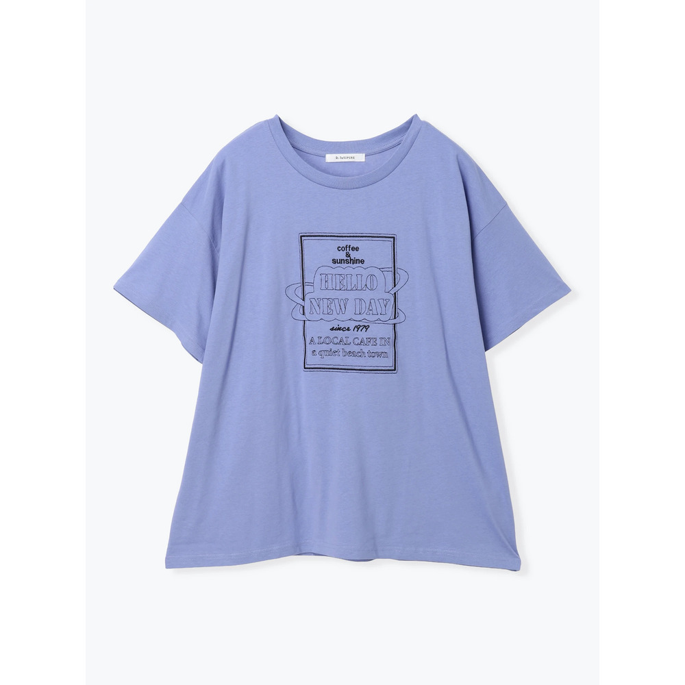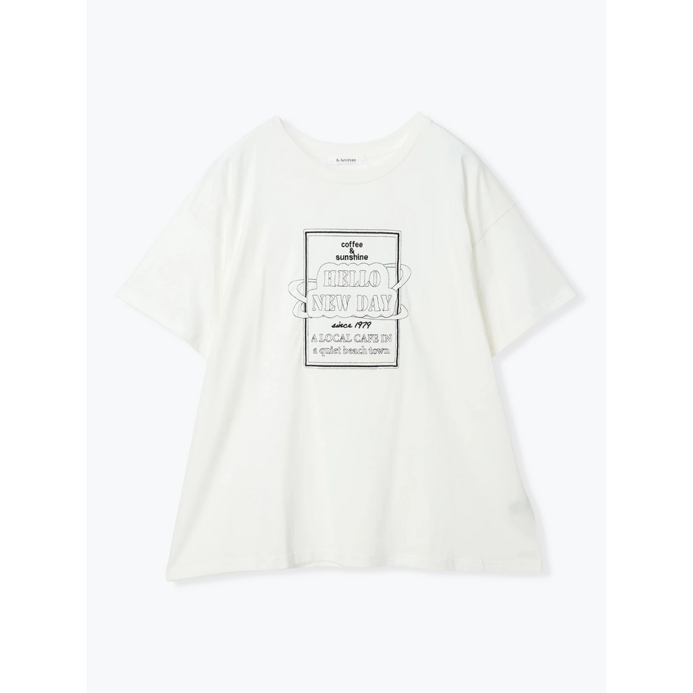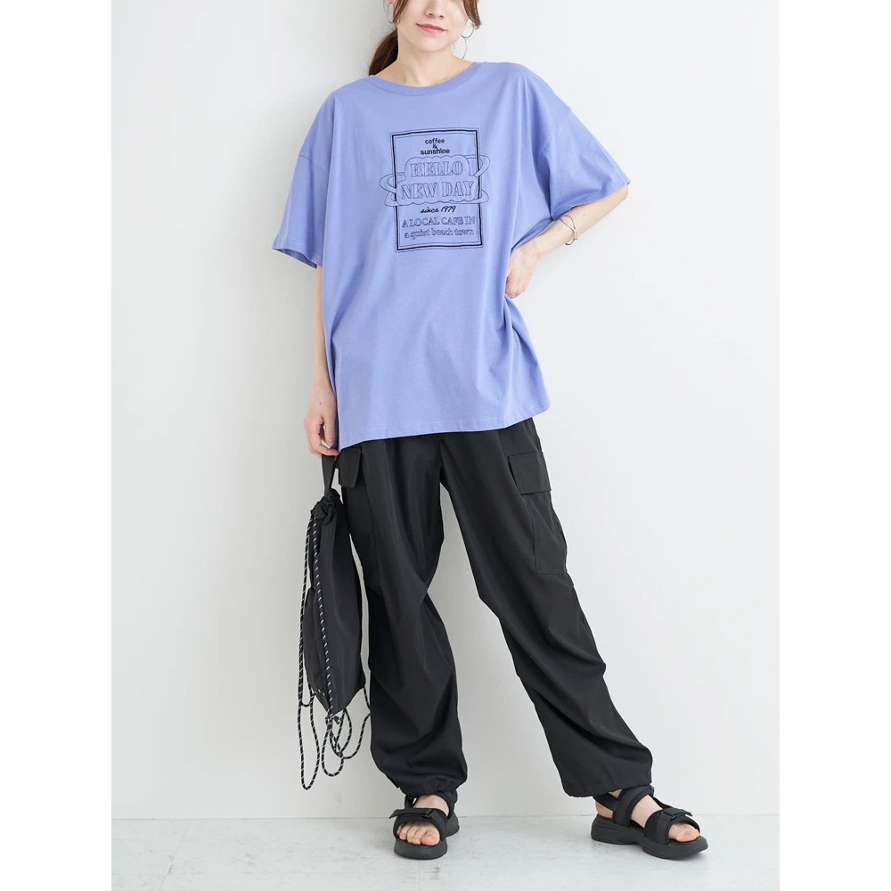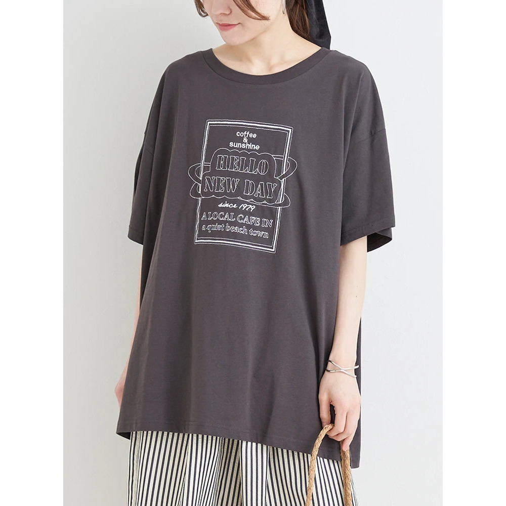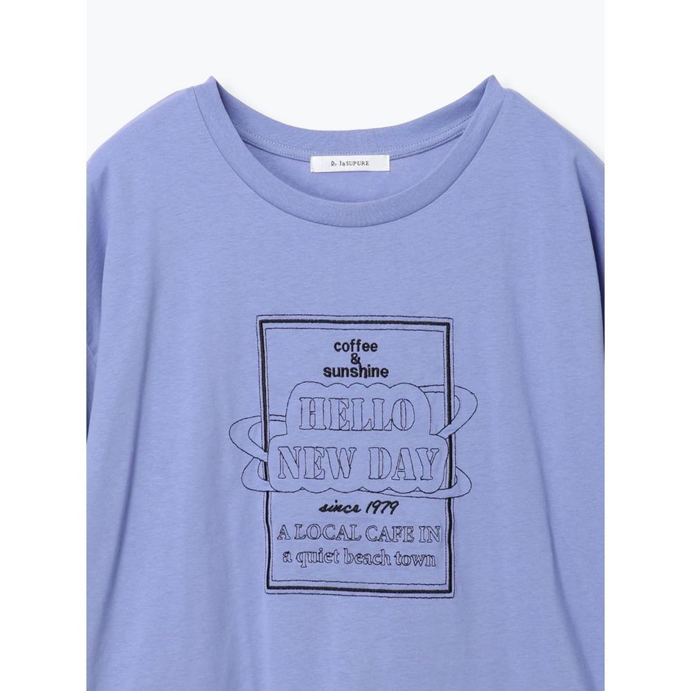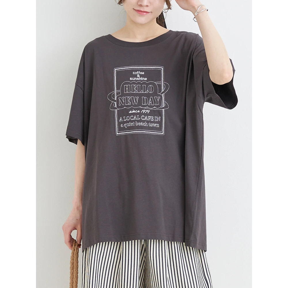 ・カフェのロゴのようなデザインの刺繍がコーディネートのアクセントに。