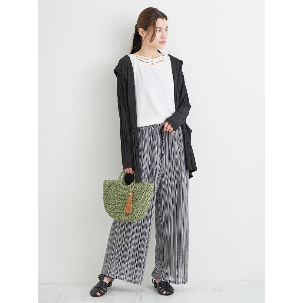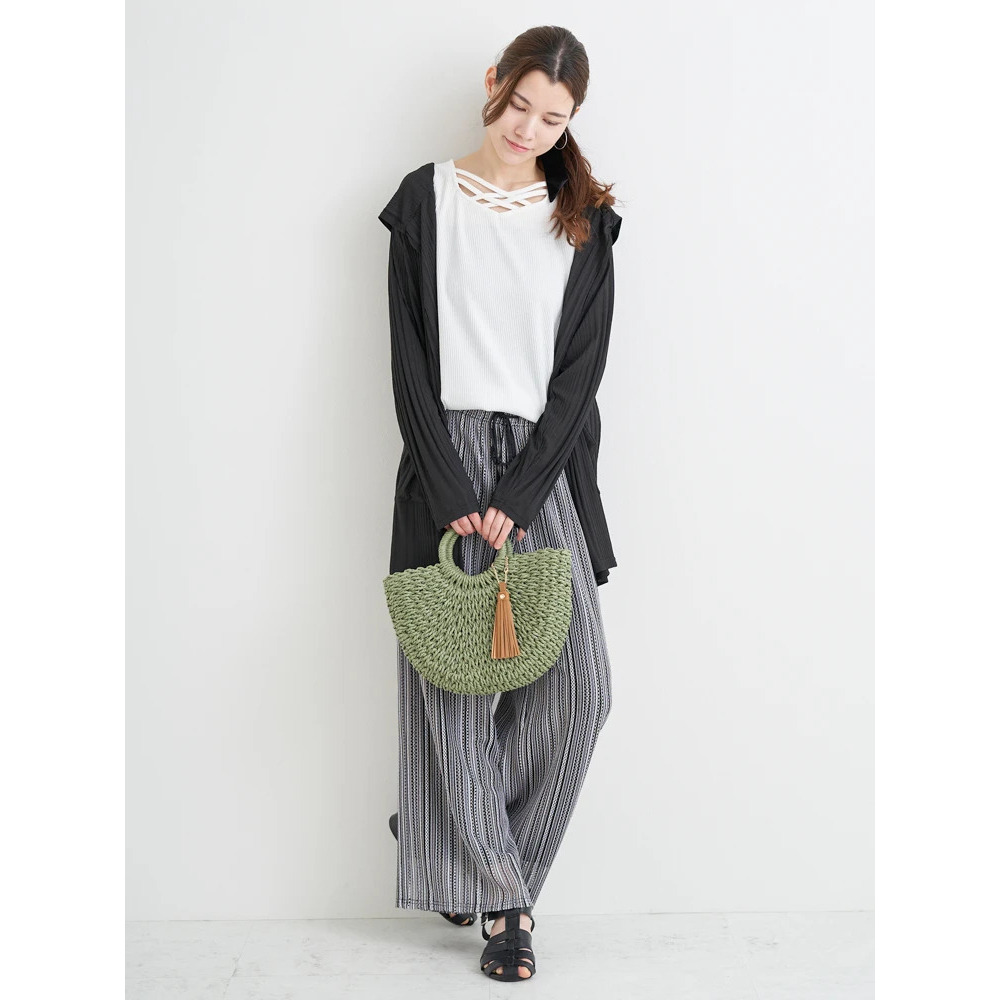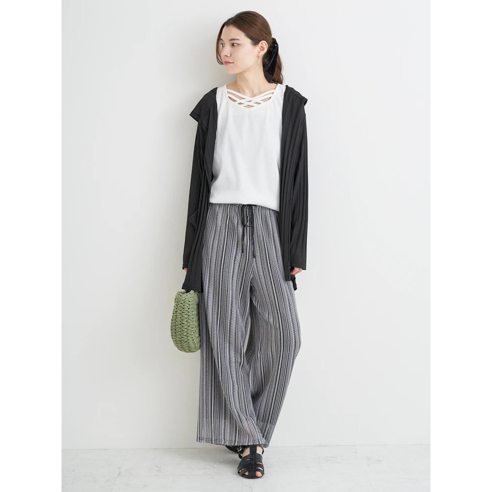 Vネックトップスやスキッパーネックのトップスとも合わせられ、胸元のクロスデザインで周りと差をつける大人の抜け感コーデを楽しめます。