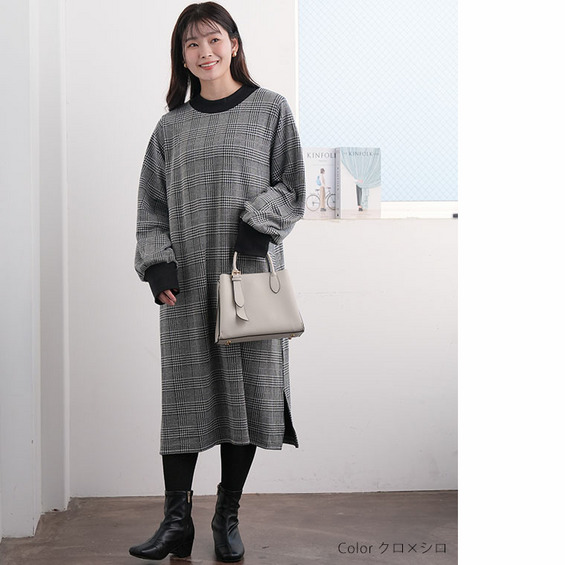 着ぶくれない 裏起毛 リブ使い ハイネック チェック ワンピース あったか