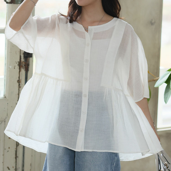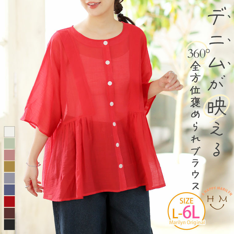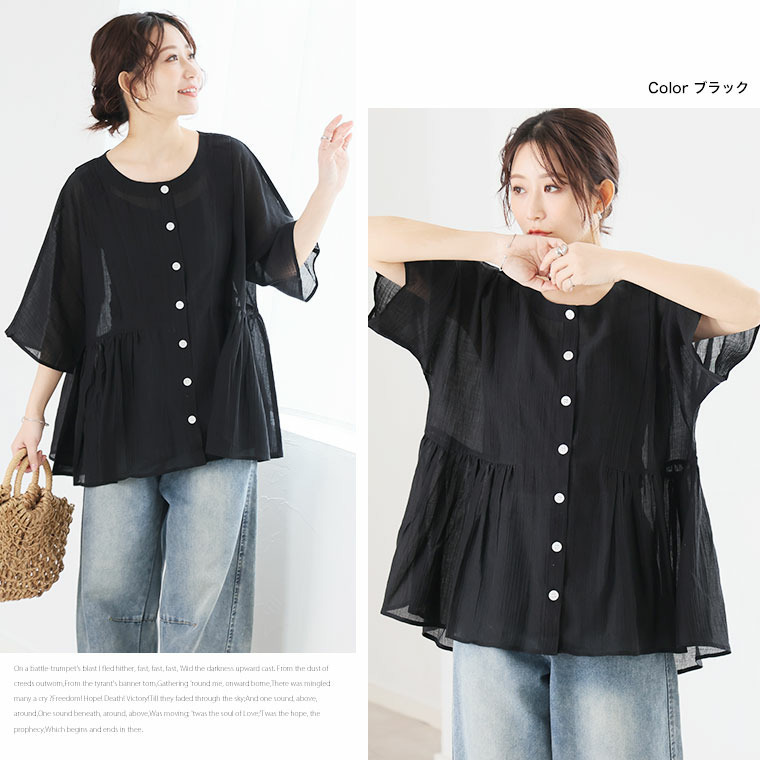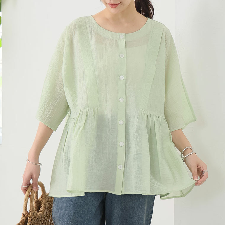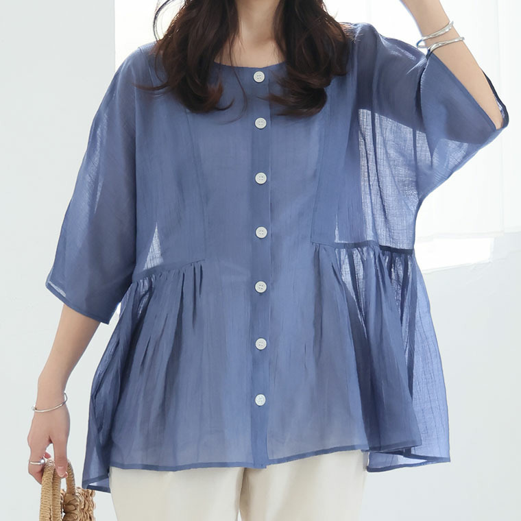 • さらり涼し気 デニムが映える 楊柳シアー 華奢魅せ タックギャザー シャツ ブラウス1
