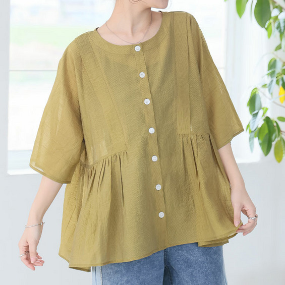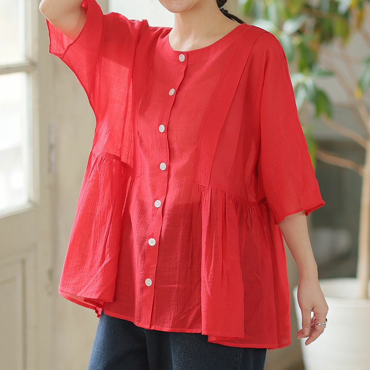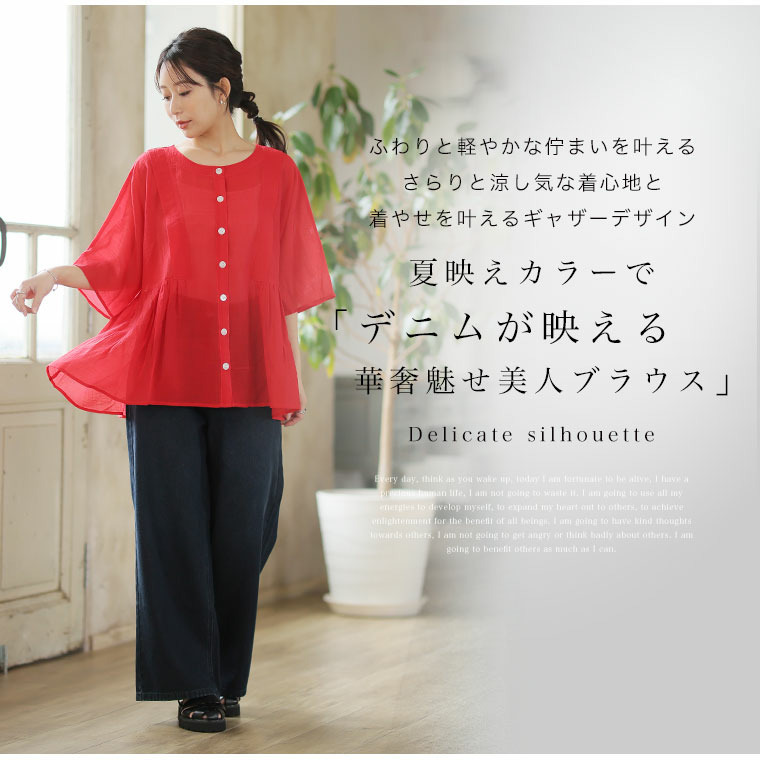 さらり涼し気 デニムが映える 楊柳シアー 華奢魅せ タックギャザー シャツ ブラウス
