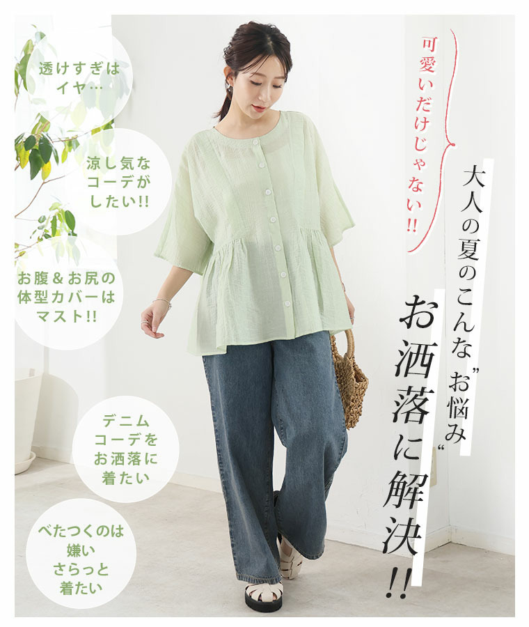 • さらり涼し気 デニムが映える 楊柳シアー 華奢魅せ タックギャザー シャツ ブラウス23