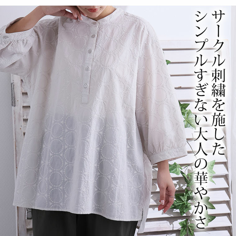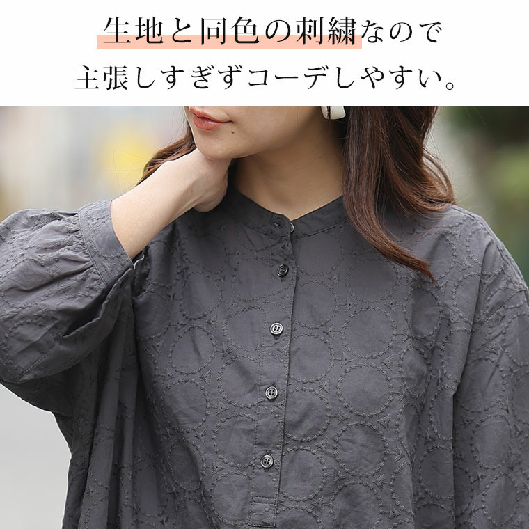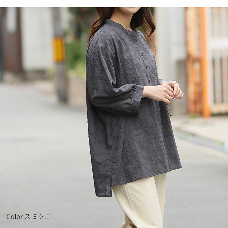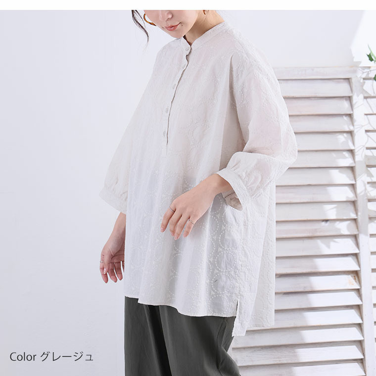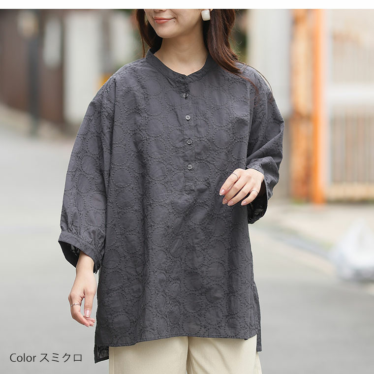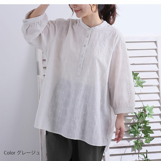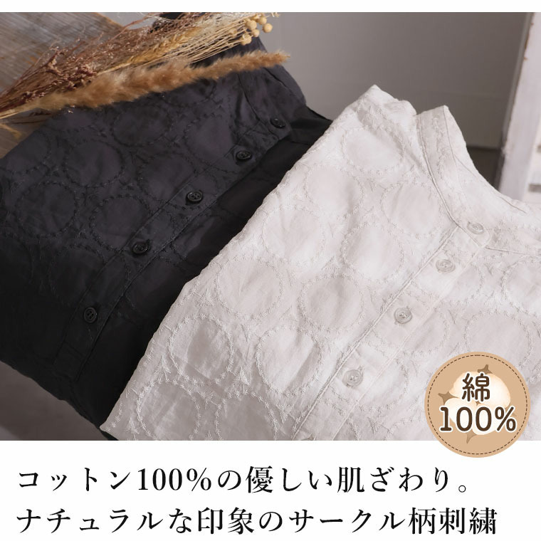 綿100% サークル刺しゅう 七分袖 バンドカラー コットン 半開 ブラウス