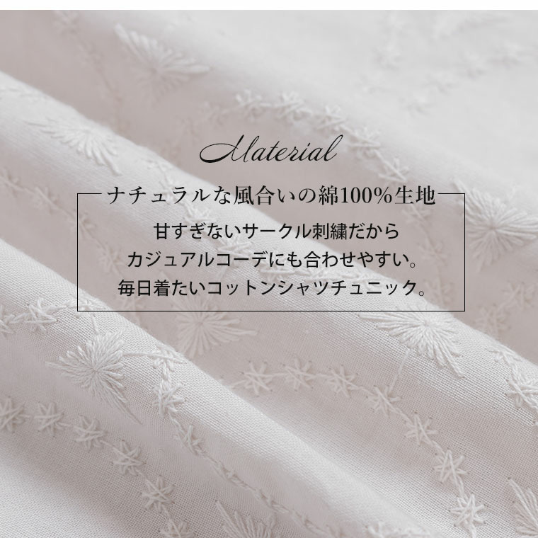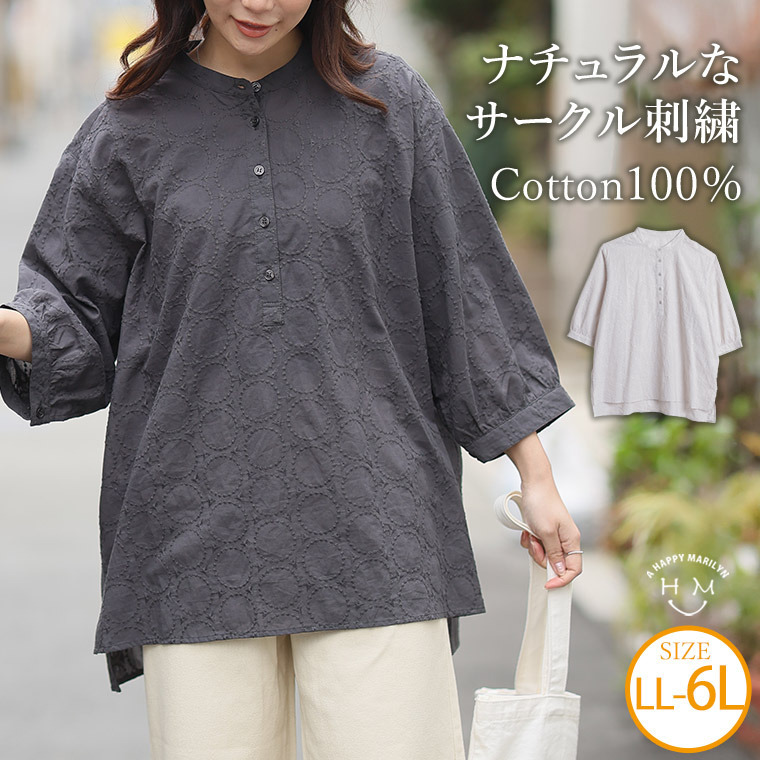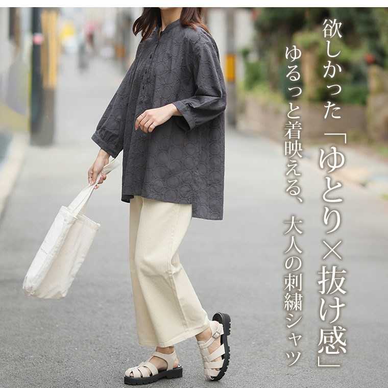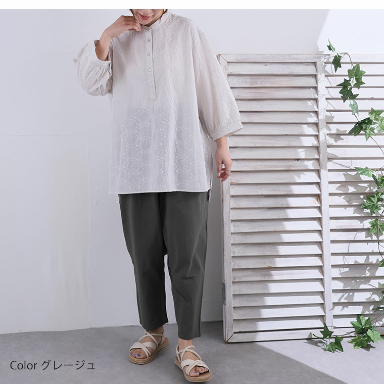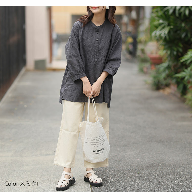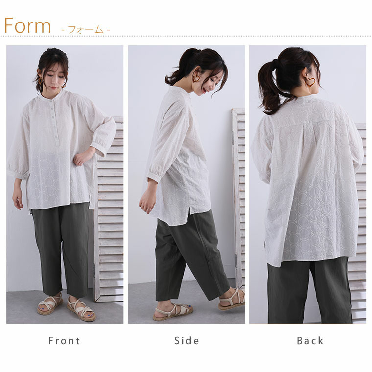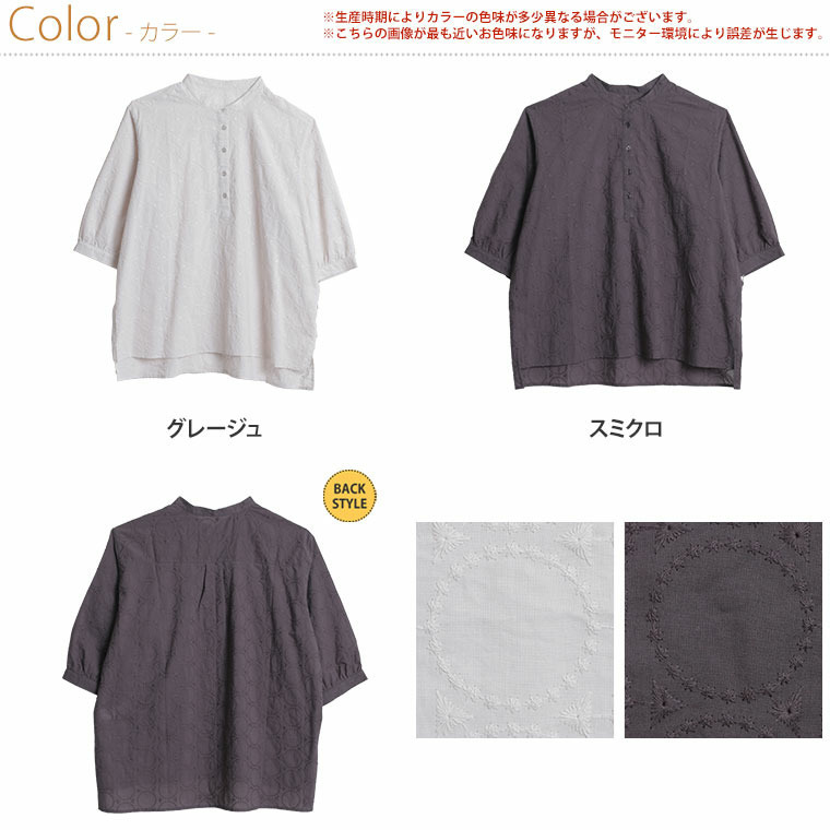 綿100% サークル刺しゅう 七分袖 バンドカラー コットン 半開 ブラウス