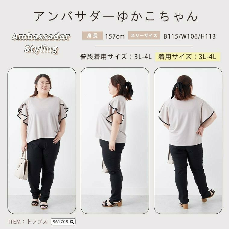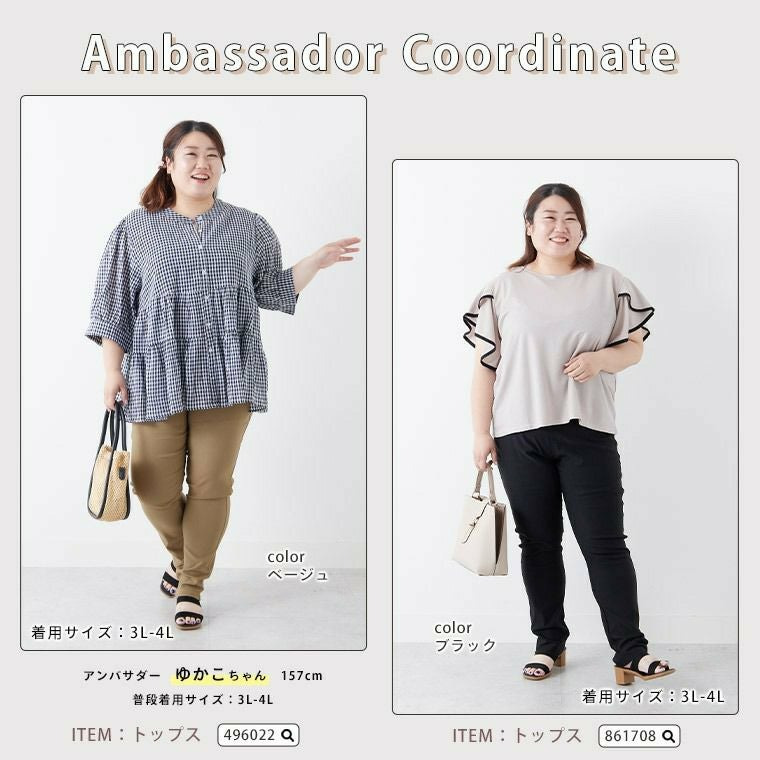 サイズ表記 M-LL(タグ1) 3L-4L(タグ2) 5L-6L(タグ3) 7L-8L(タグ5) 総丈 100.5cm 102cm 104cm 106cm ウエスト 68-88cm 74-94cm 84-104cm 96-116cm ヒップ 99-114cm 105-120cm 115-130cm 127-142cm 前股上 27.5cm 29cm 31cm 33.5cm 後股上 38.5cm 40cm 42cm 44.5cm 太腿周り 61-71cm 65-75cm 70-80cm 77-87cm 股下 75cm 75cm 75cm 75cm 膝周り45-55cm ふくらはぎ周り43-53cm 裾周り 29-35cm 31-37cm 33-39cm 36-42cm