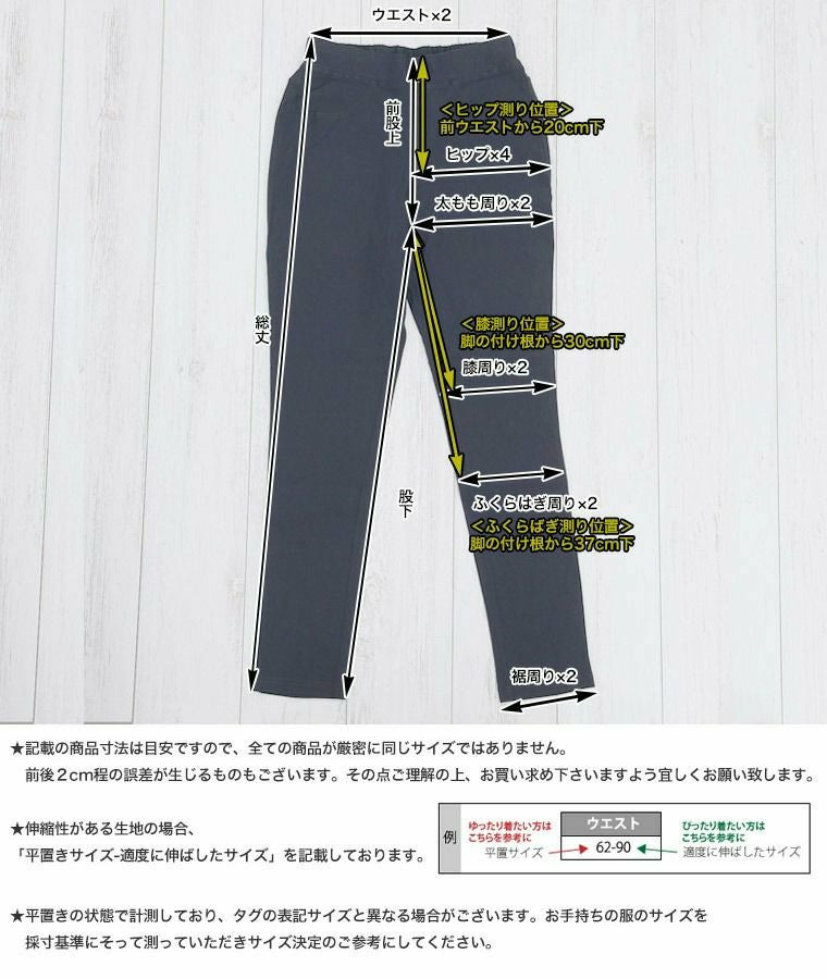 総丈100.5cmウエスト68-88cmヒップ99-114cm前股上27.5cm後股上38.5cm太腿周り61-71cm股下75cm膝周り38-48cmふくらはぎ周り36-46cm裾周り29-35cm