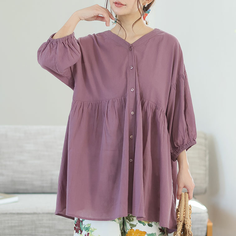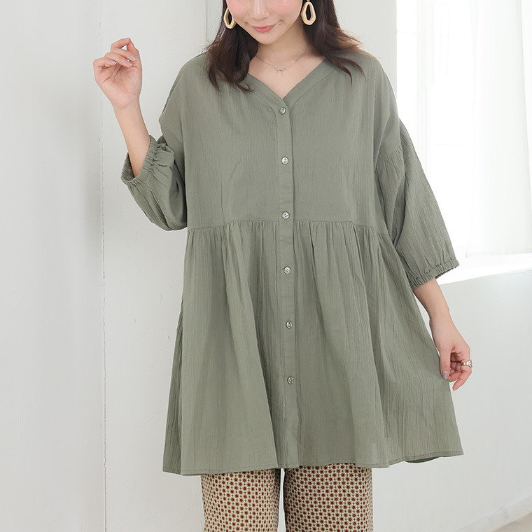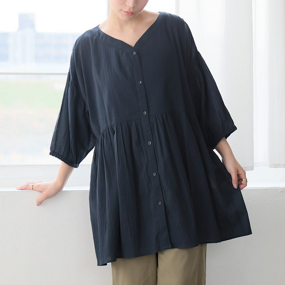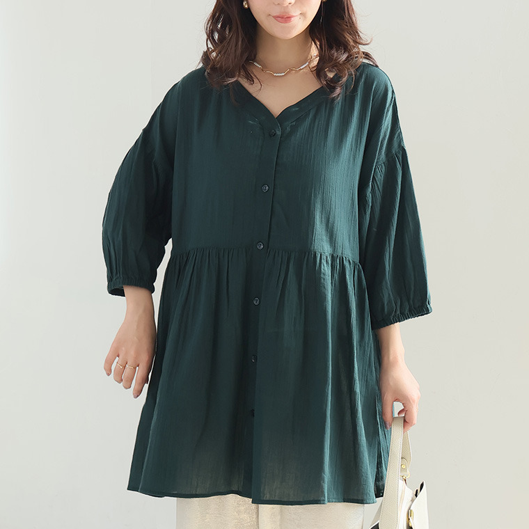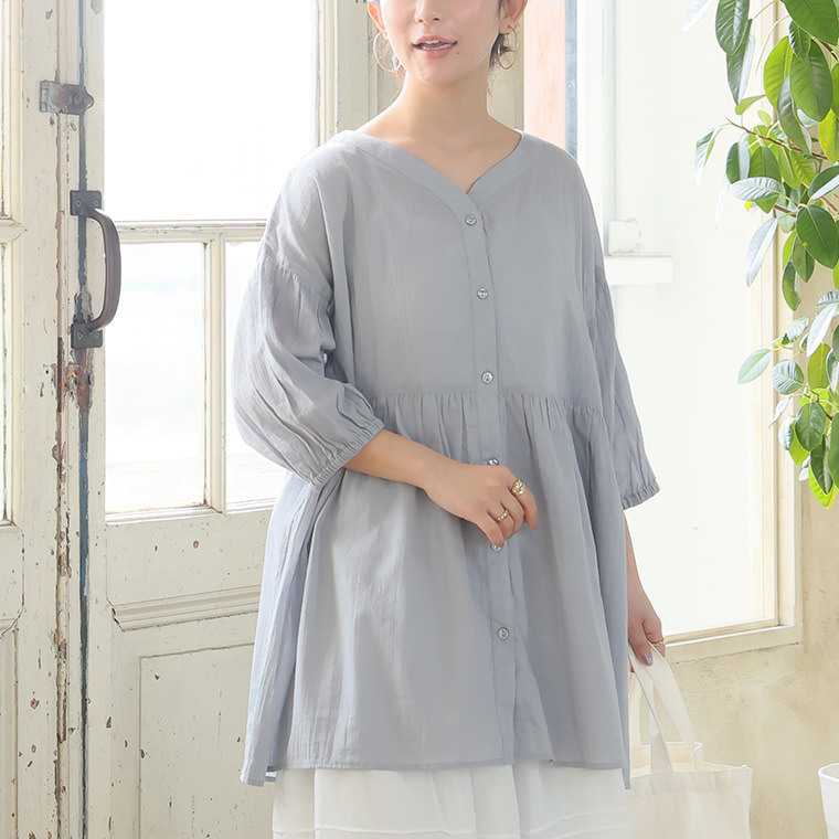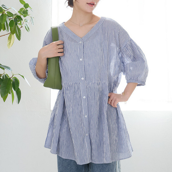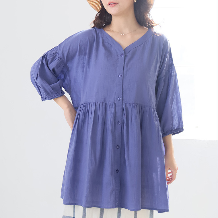 【風通るプレミアム】綿 楊柳 七分袖 ウエストギャザー ブラウス
