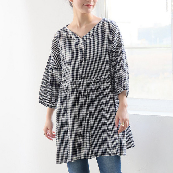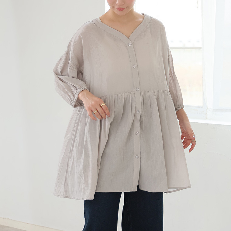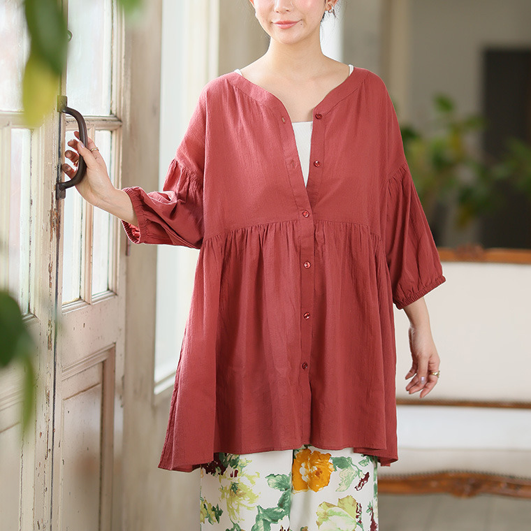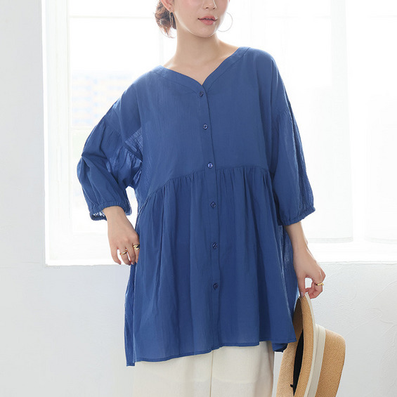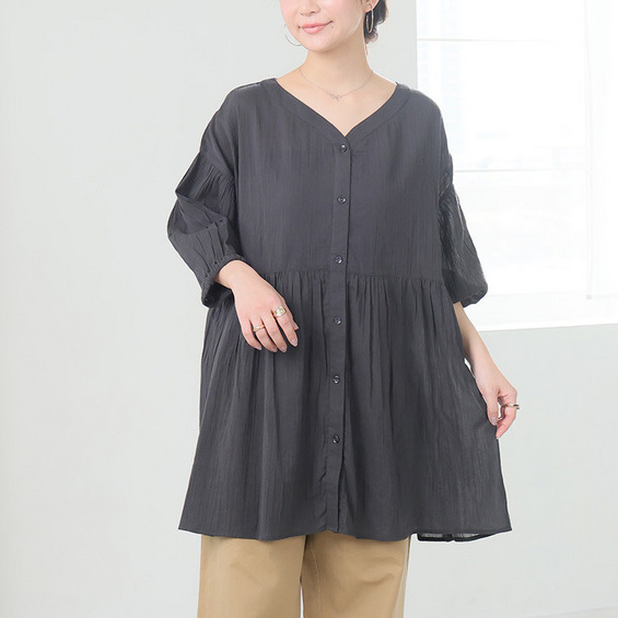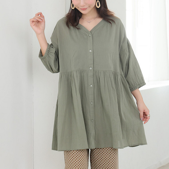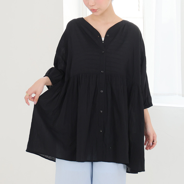 【風通るプレミアム】綿 楊柳 七分袖 ウエストギャザー ブラウス