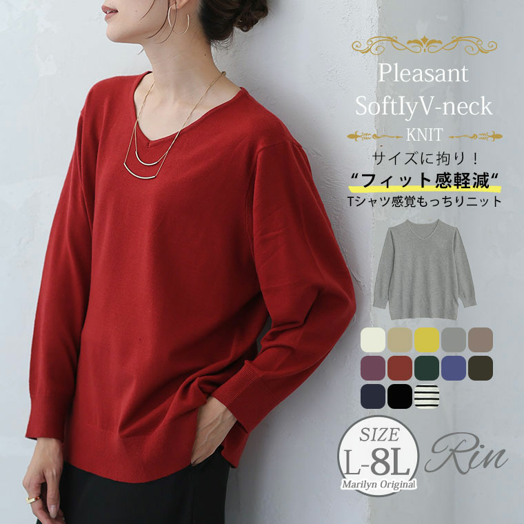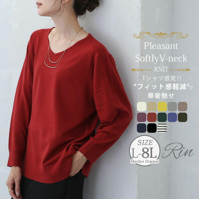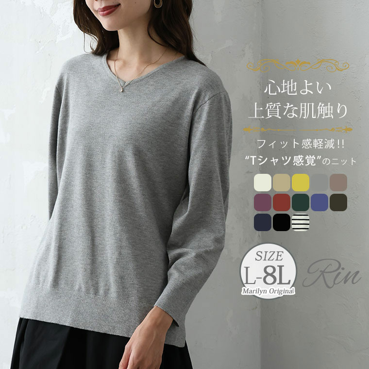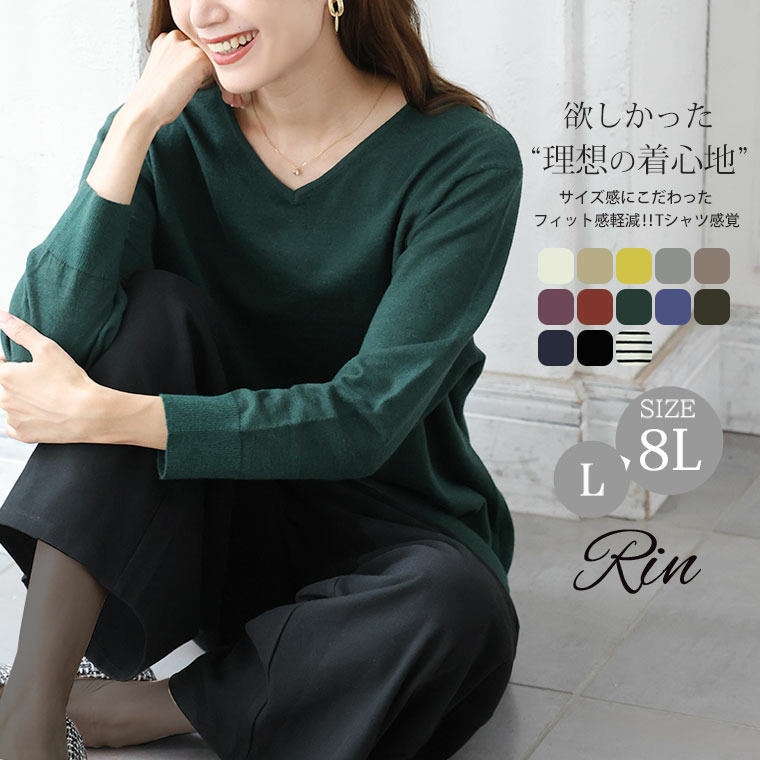 Rin フィット感軽減! Tシャツ感覚 もっちりやわらか Vネック ニット