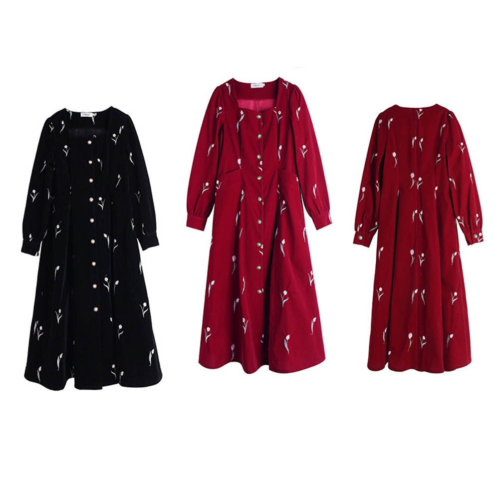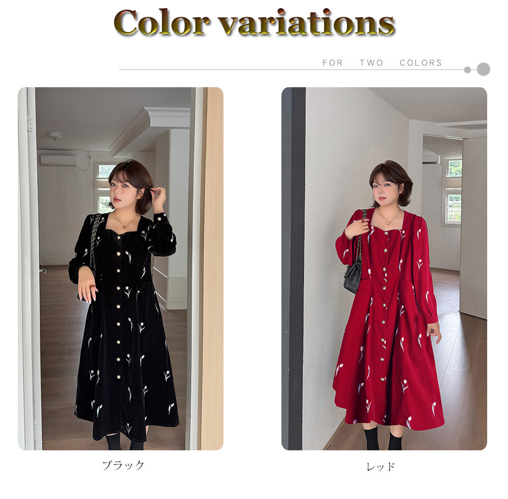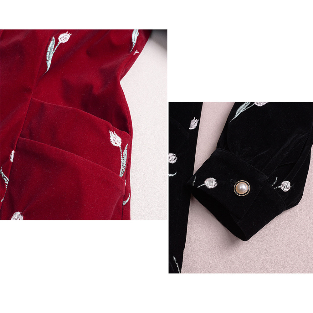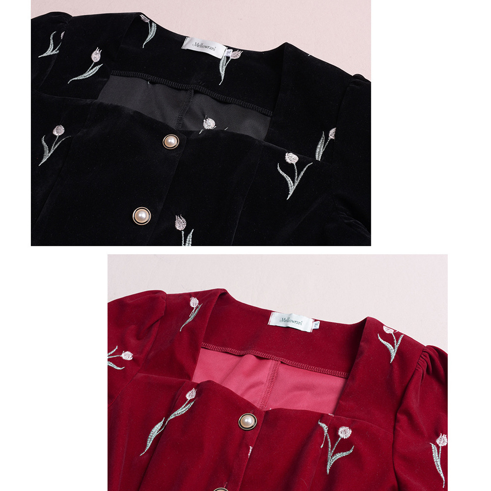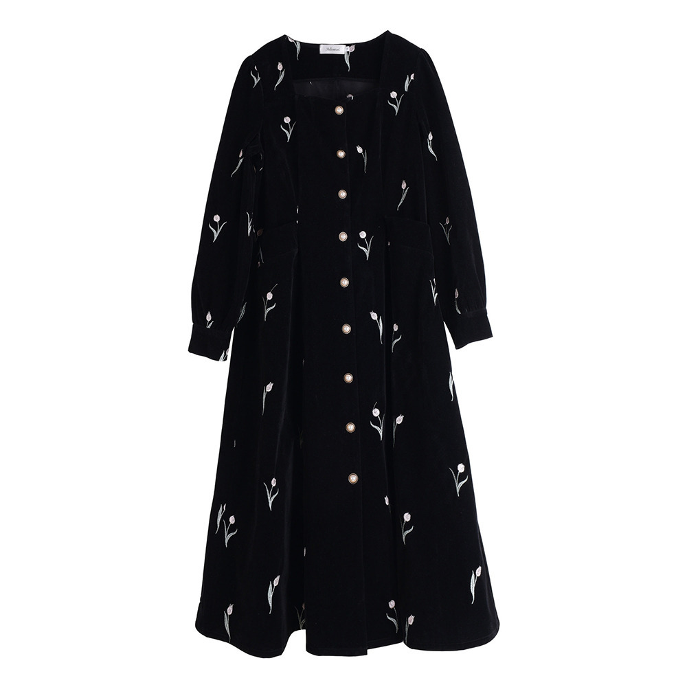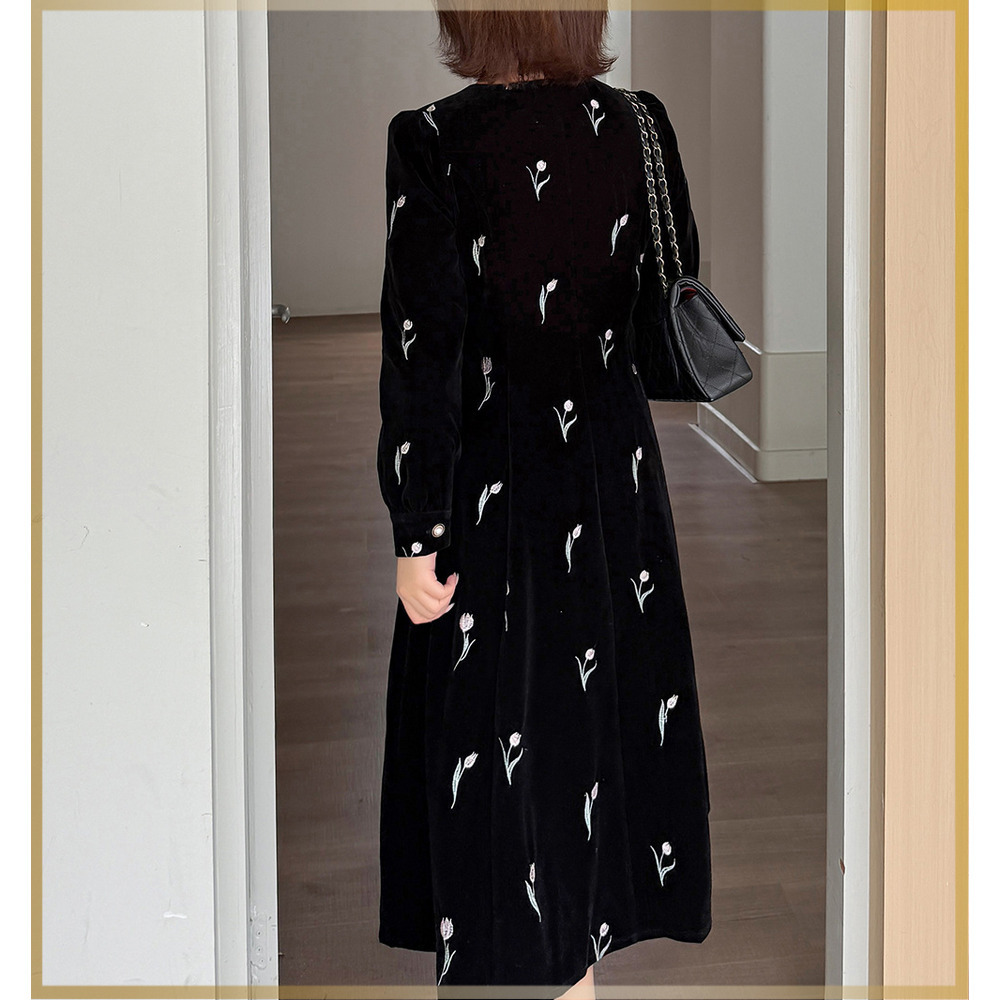 チューリップ刺繍ベルベット生地のタックフレアワンピース