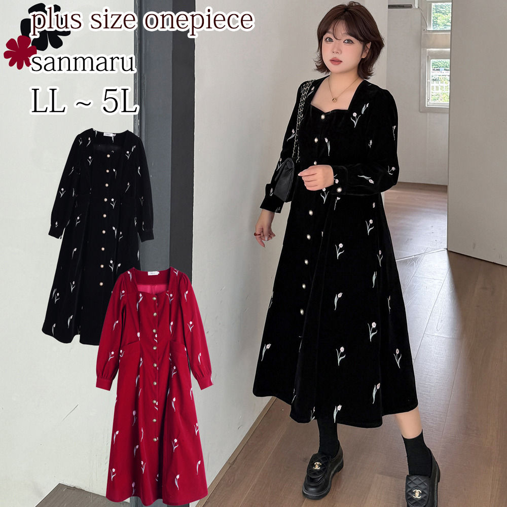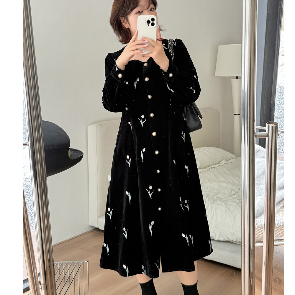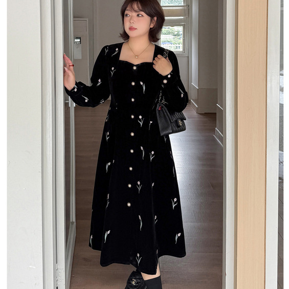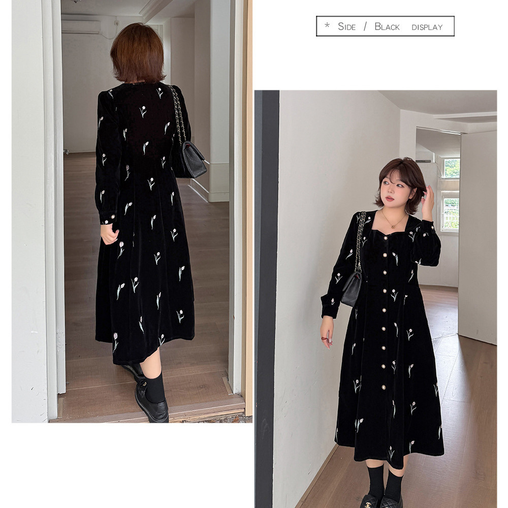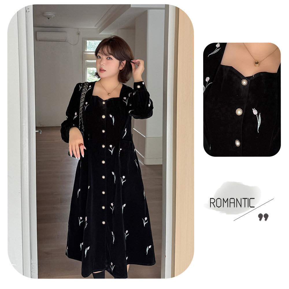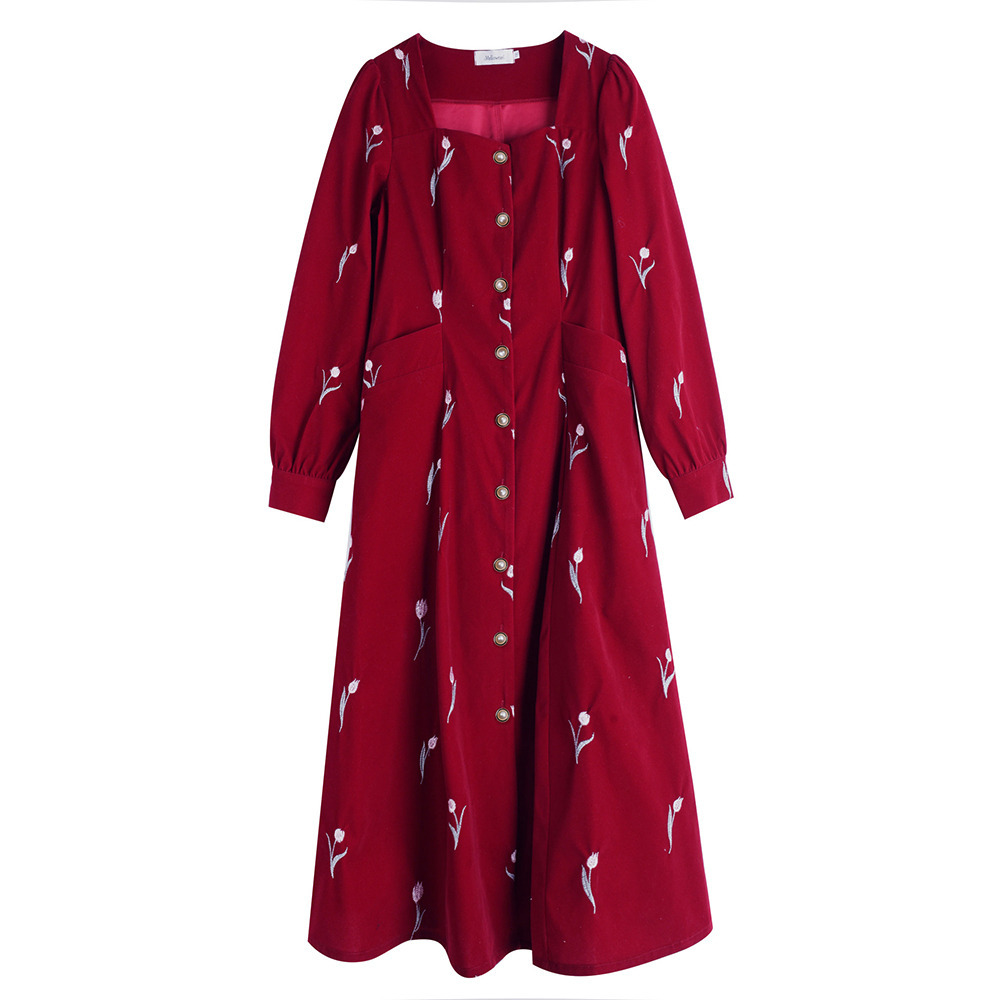 チューリップ刺繍ベルベット生地のタックフレアワンピース