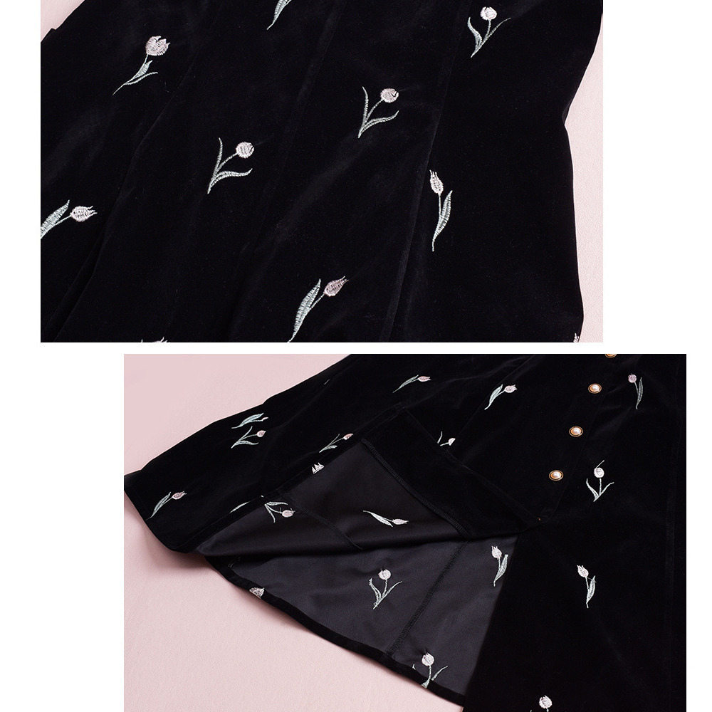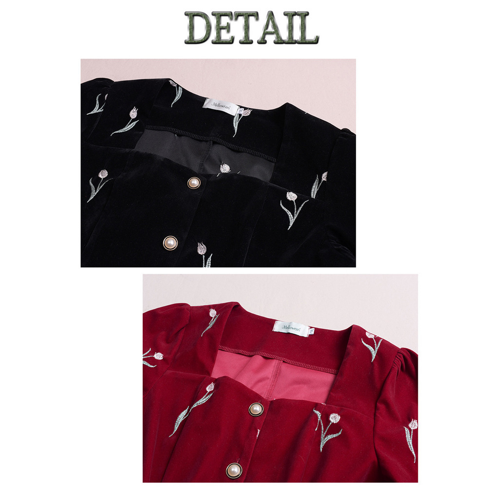 チューリップ刺繍入りベルベット、タックフレアワンピース。