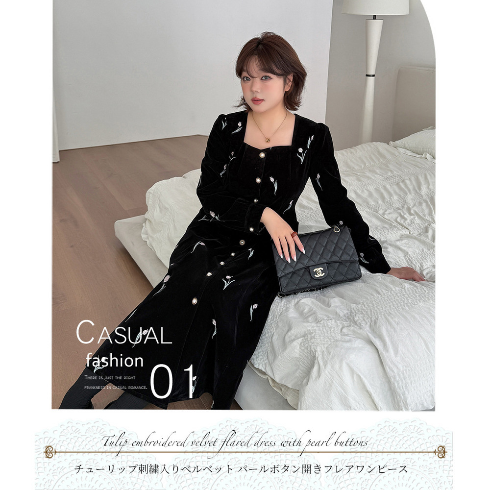 • チューリップ刺繍ベルベット生地のタックフレアワンピース1