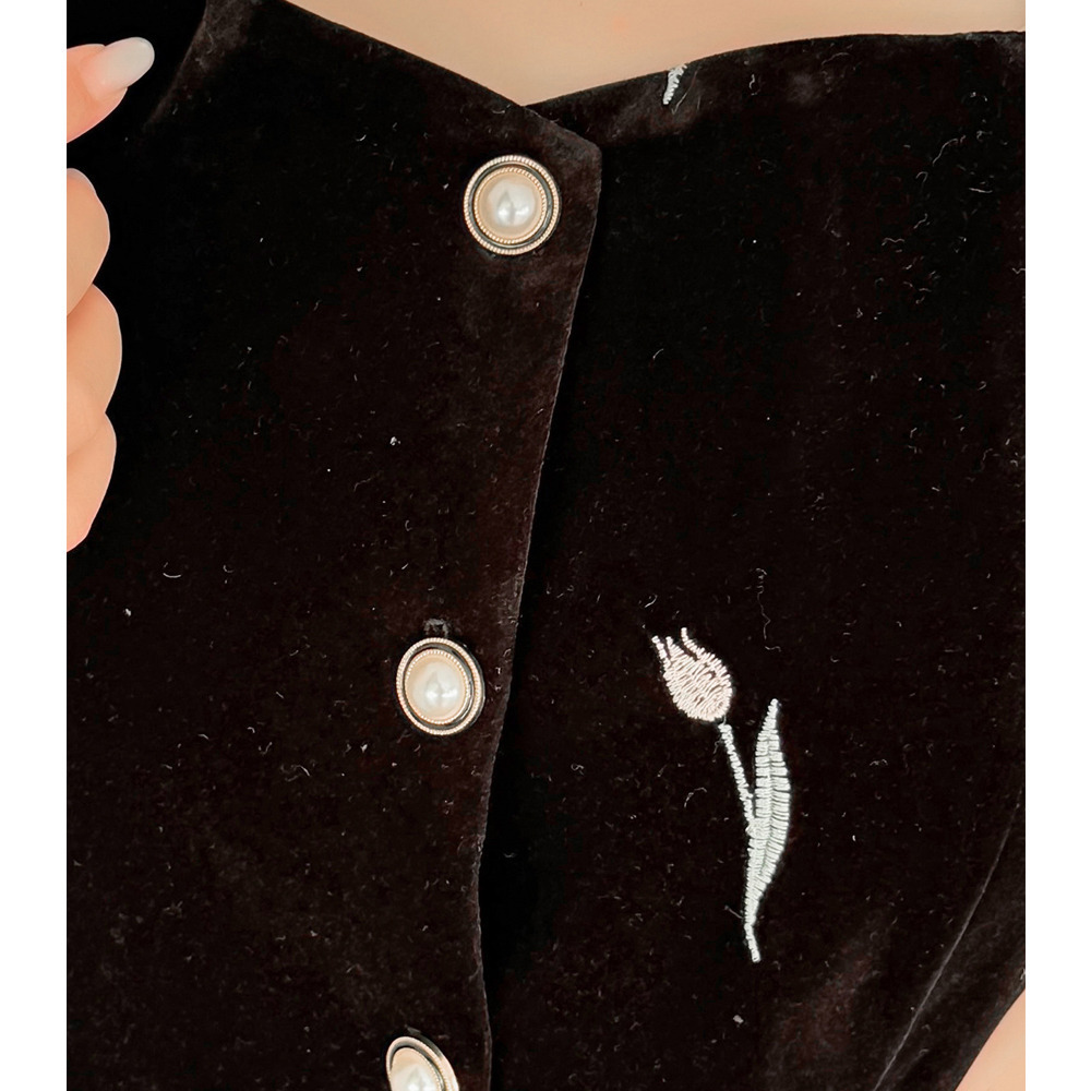 「チューリップ刺繍入りベルベット タックフレアワンピース」
