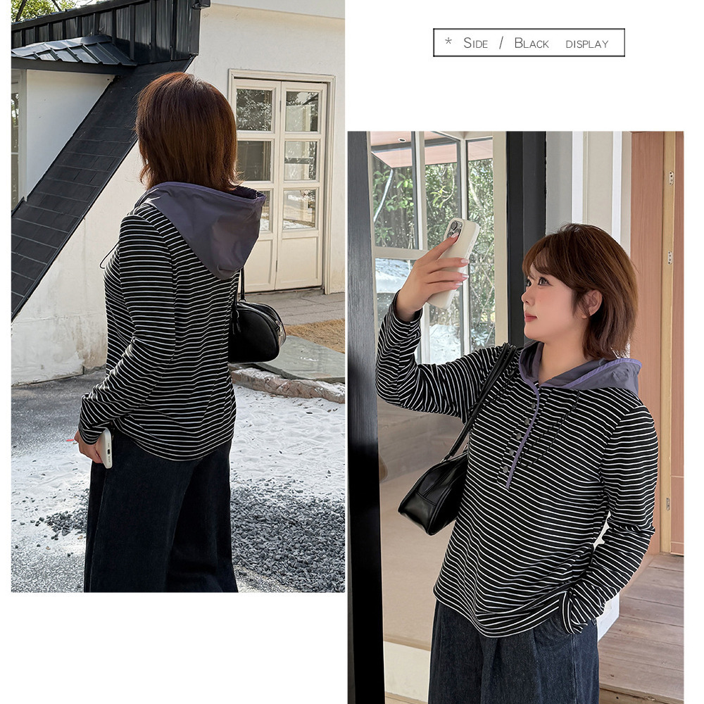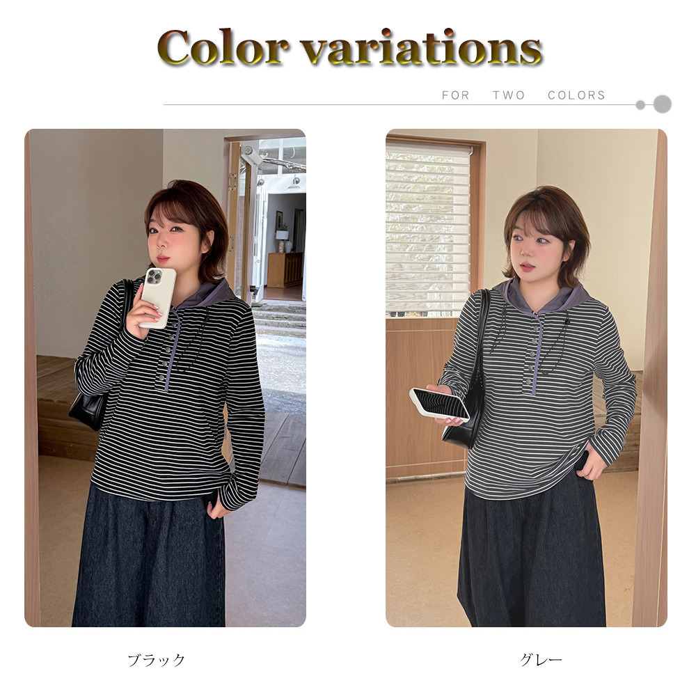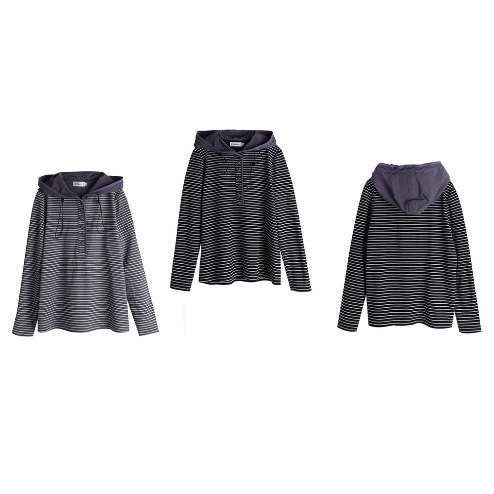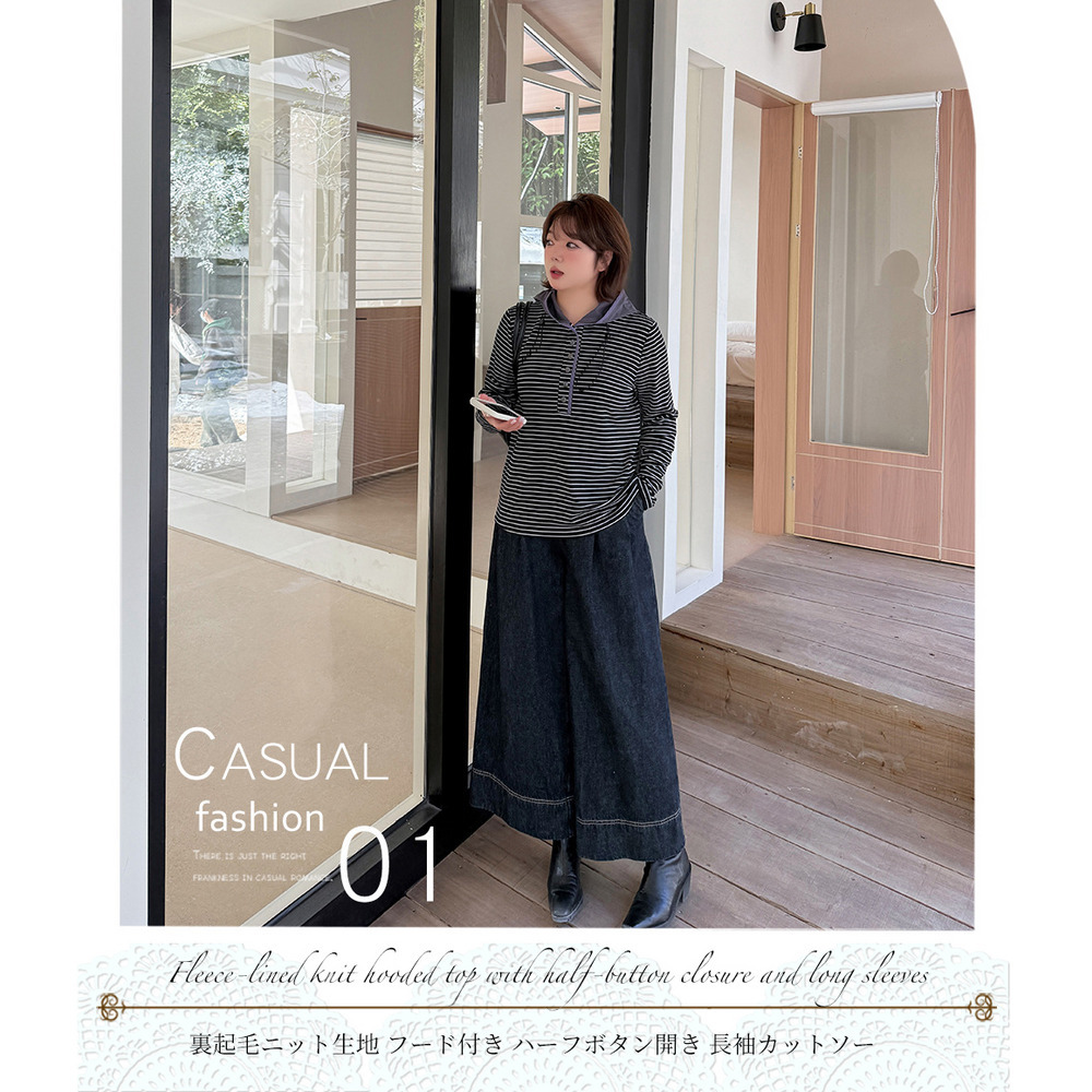 裏起毛でゆとりのあるサイジング 細ボーダー柄フード付きトップス