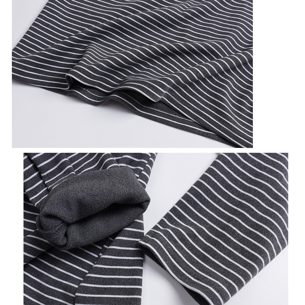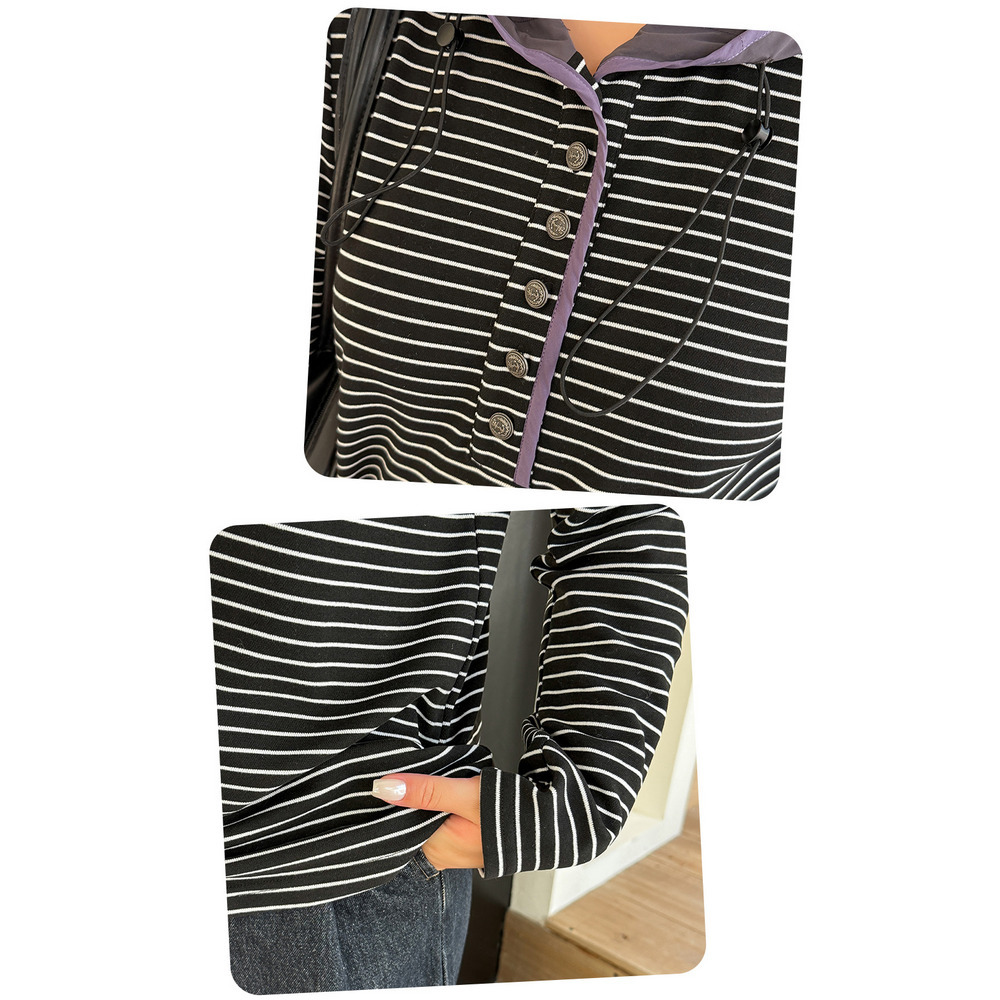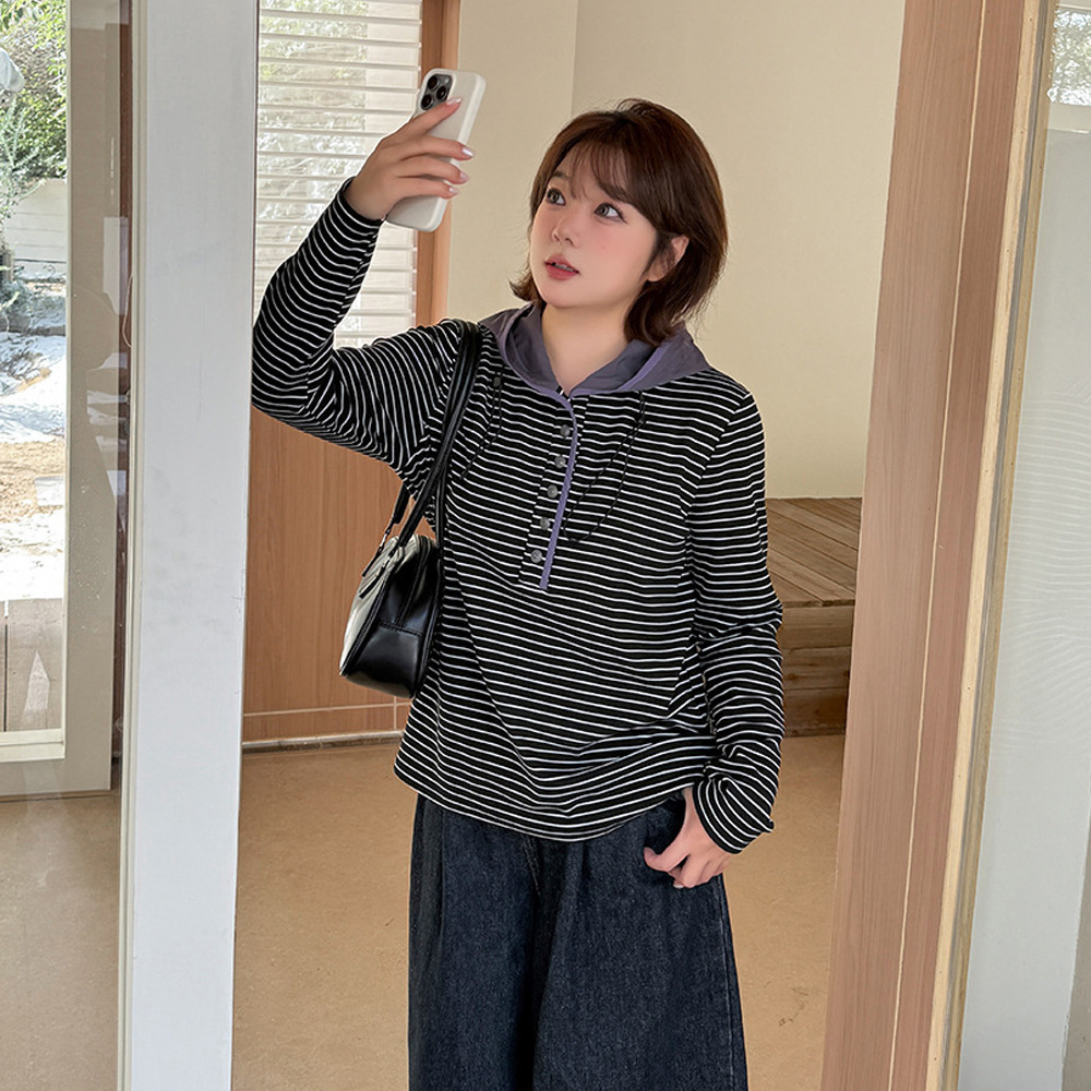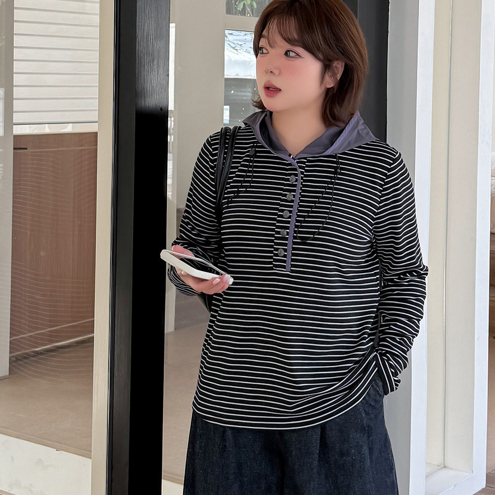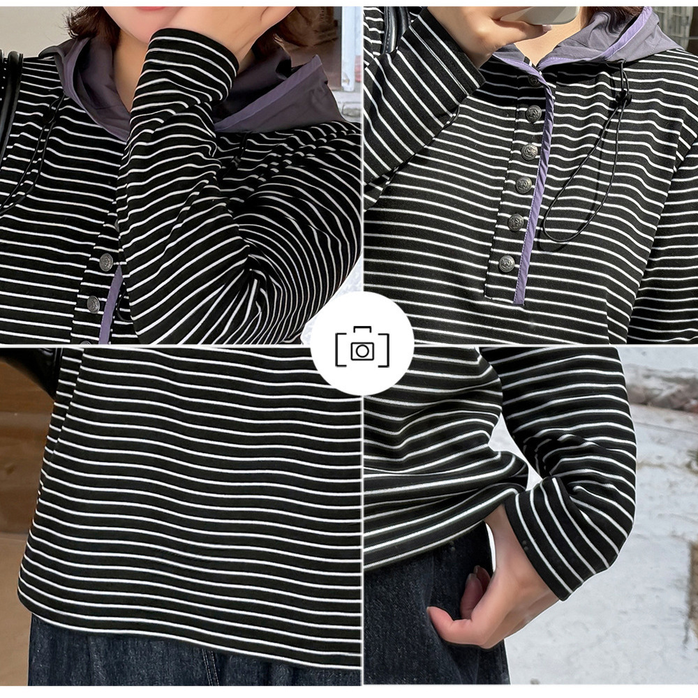 裏起毛でゆとりのあるサイジング 細ボーダー柄フード付きトップス