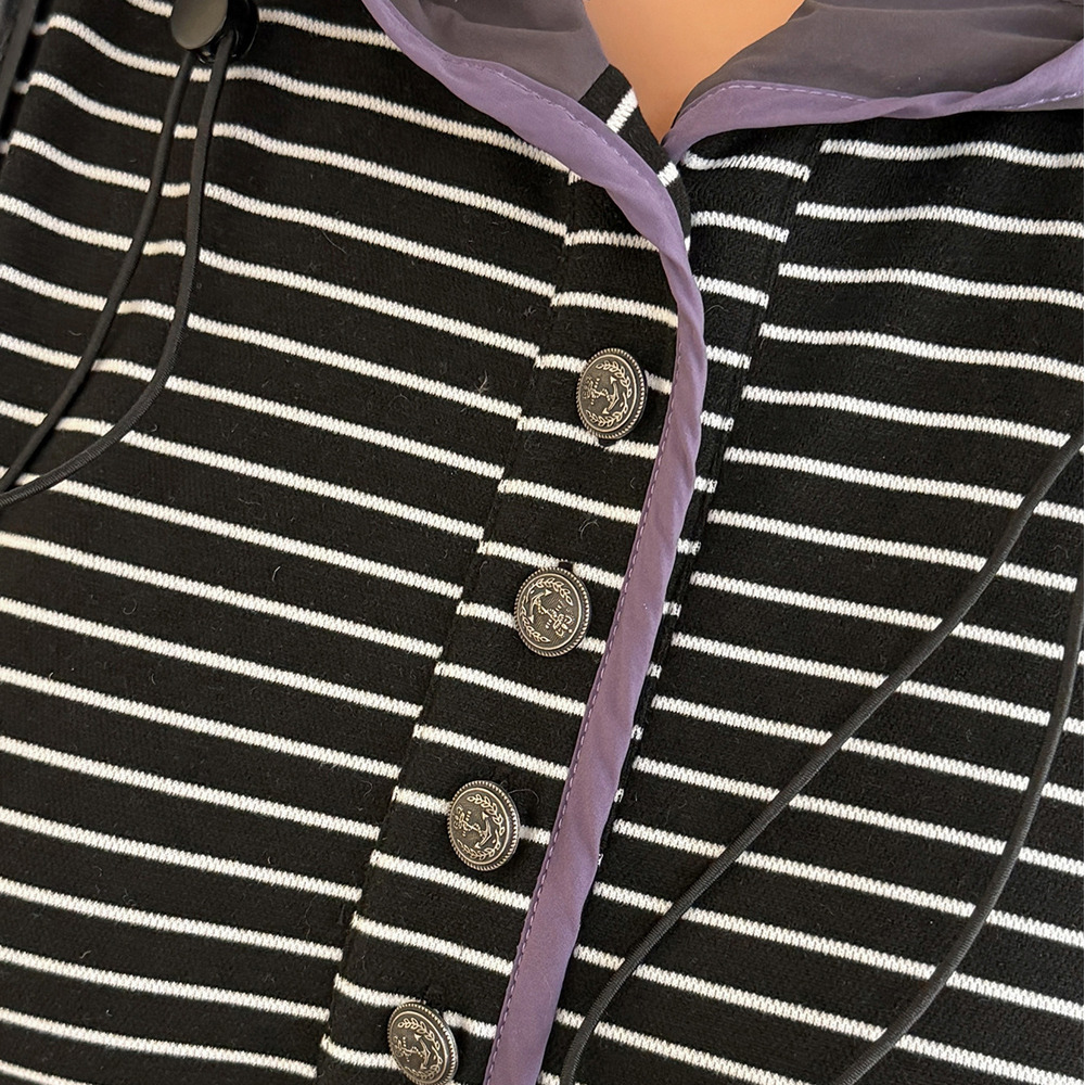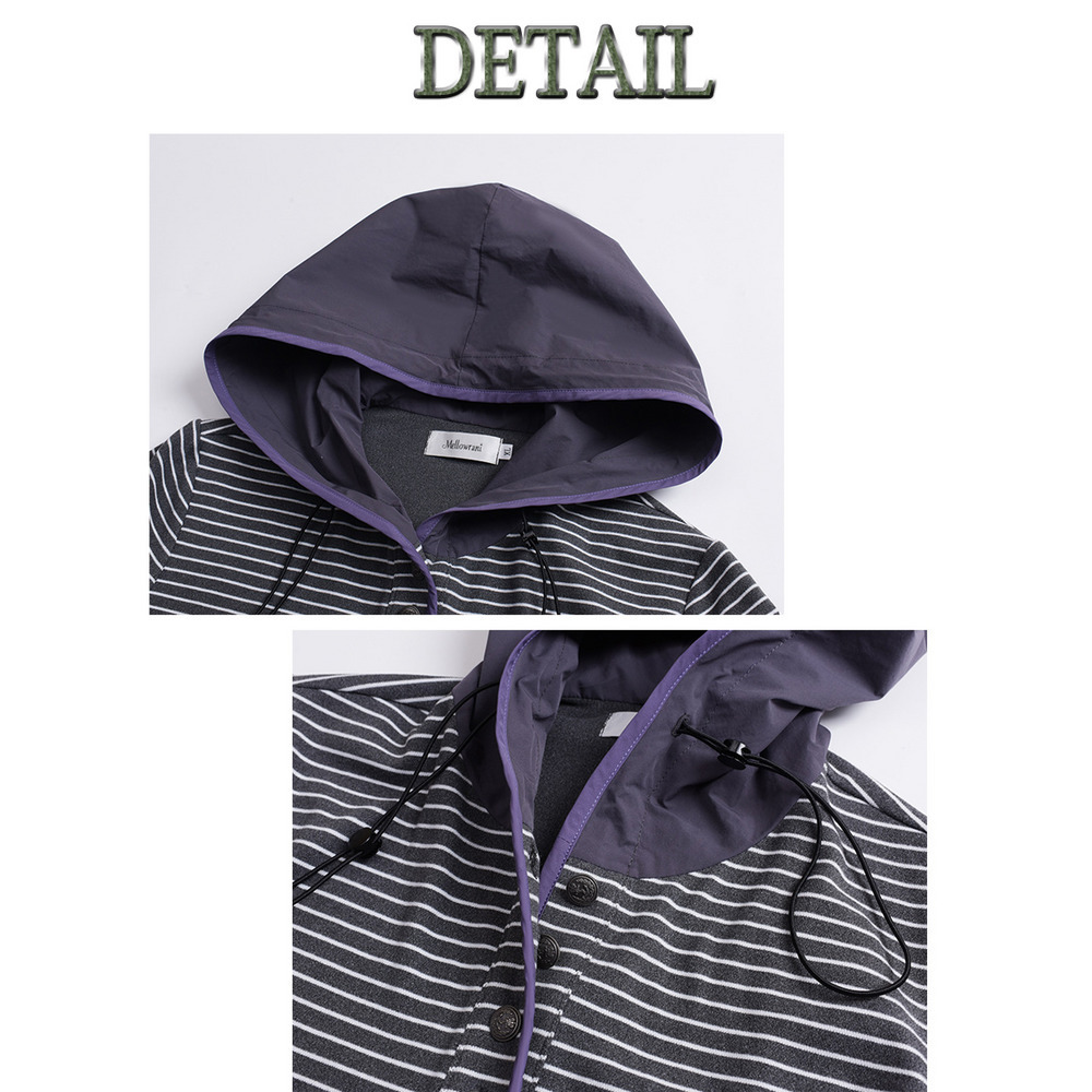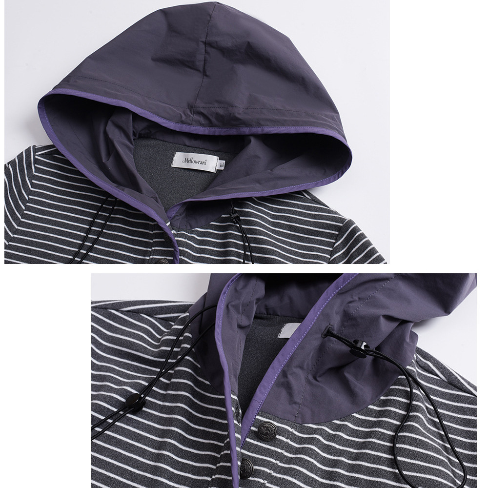 フードは無地でコードにスピンドル付き、ハーフボタン開きです。