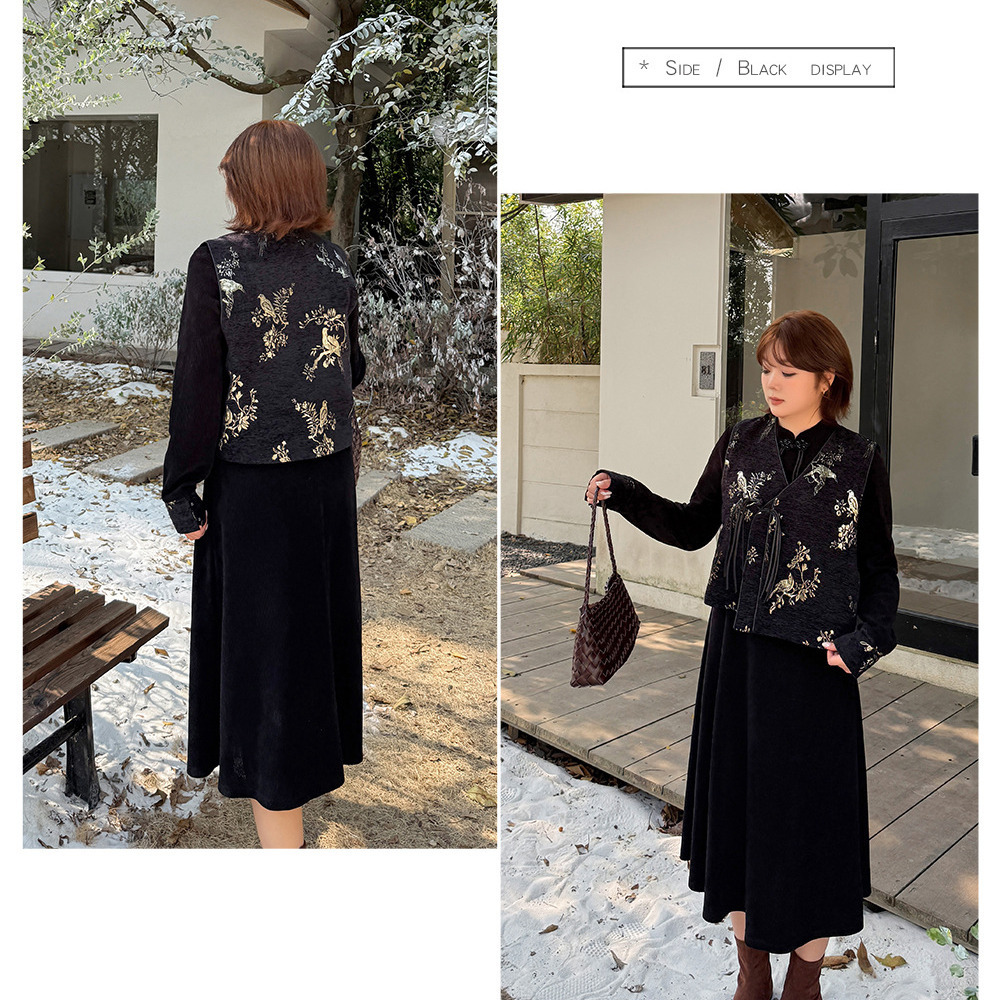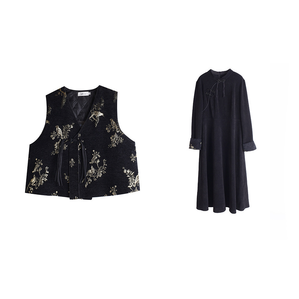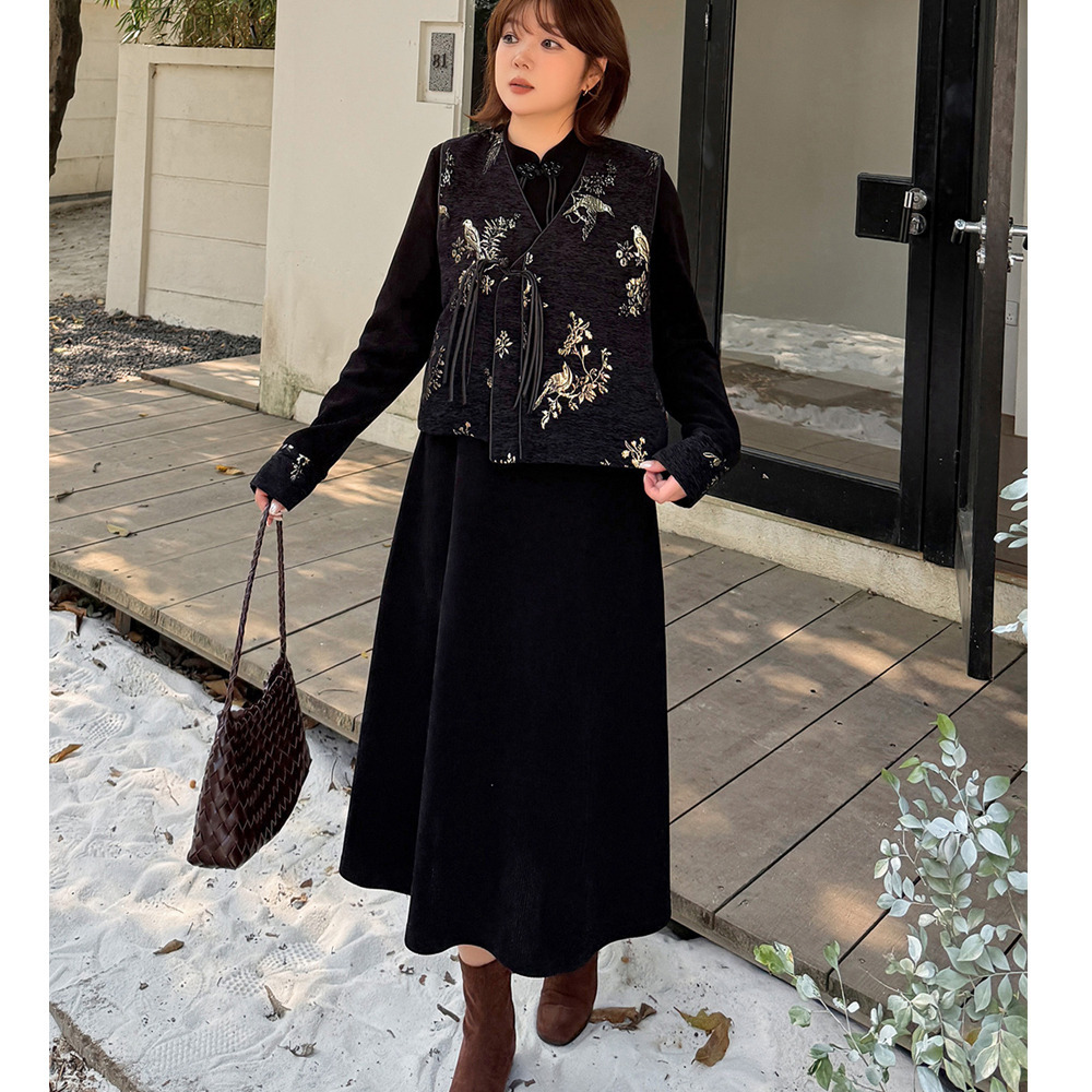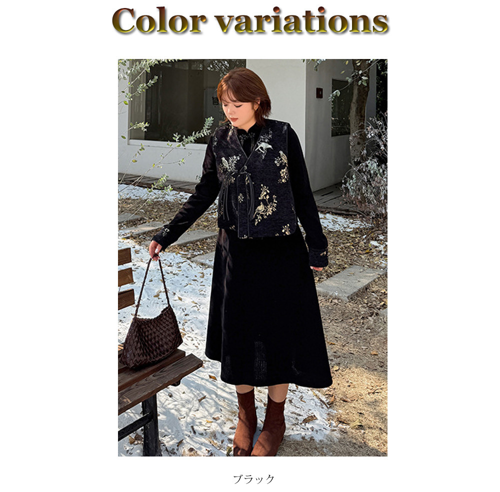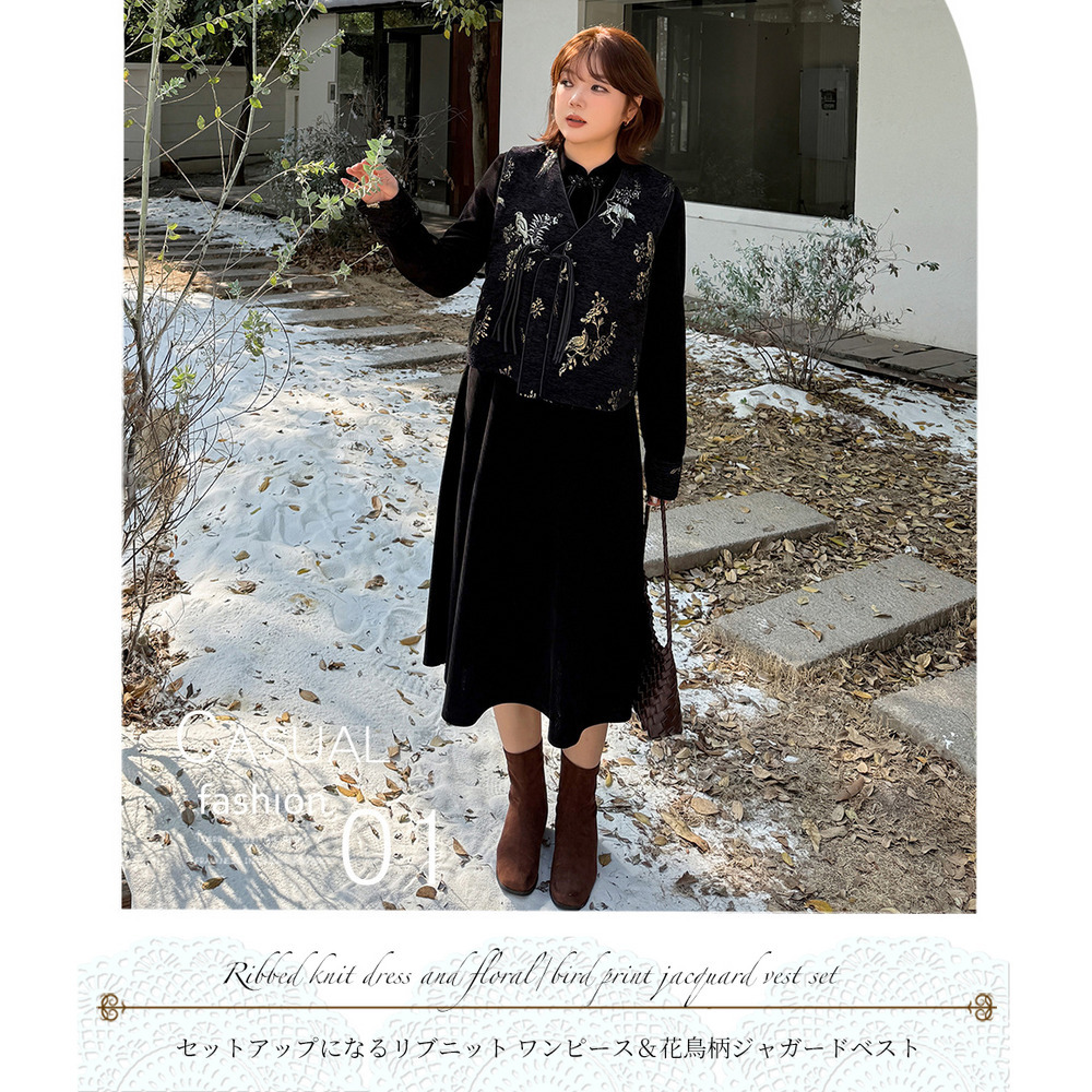 「チャイナカラーニットワンピース&花鳥柄ジャガードベスト」