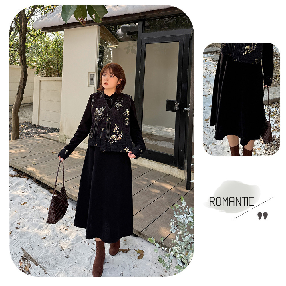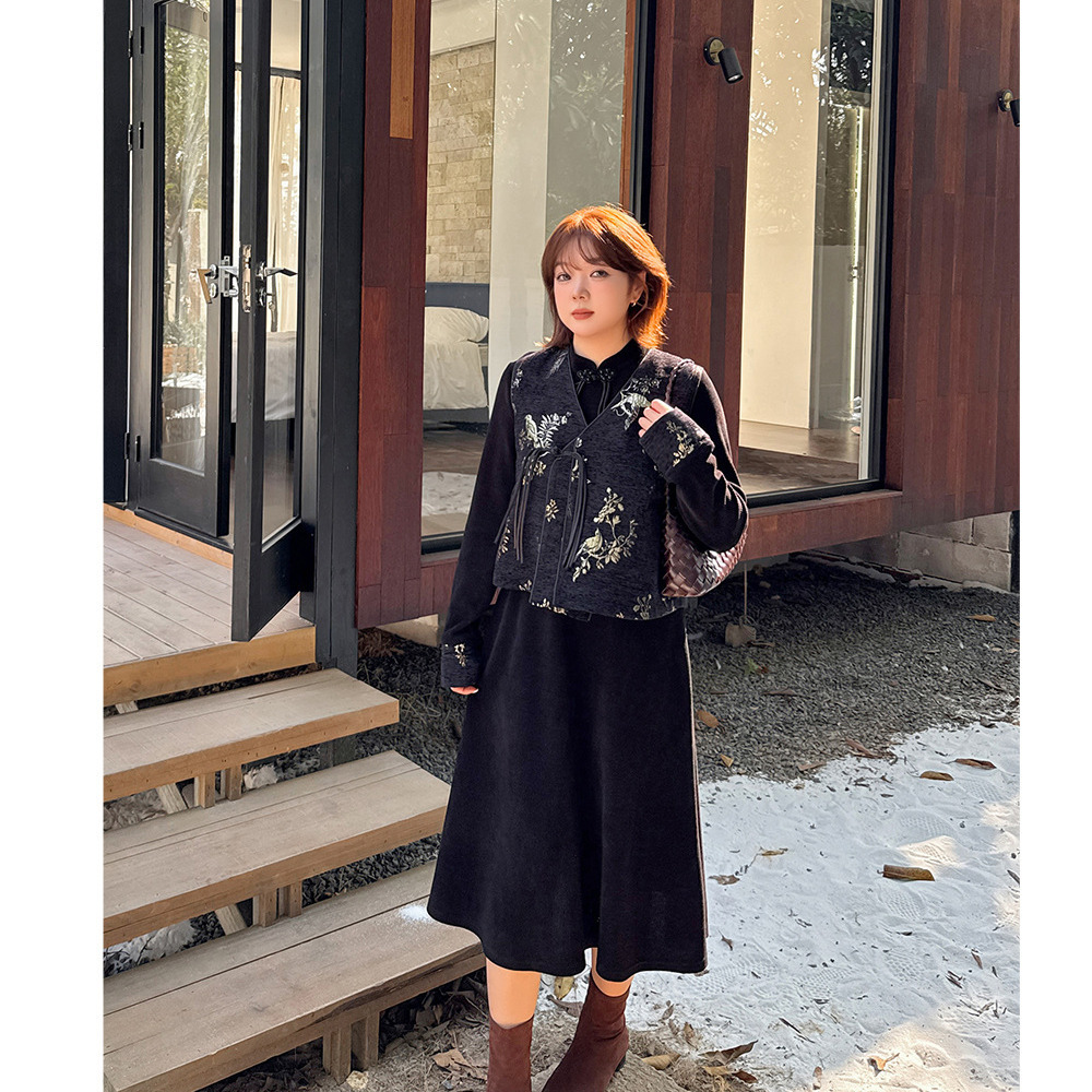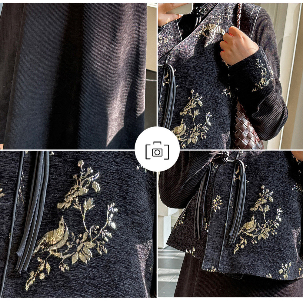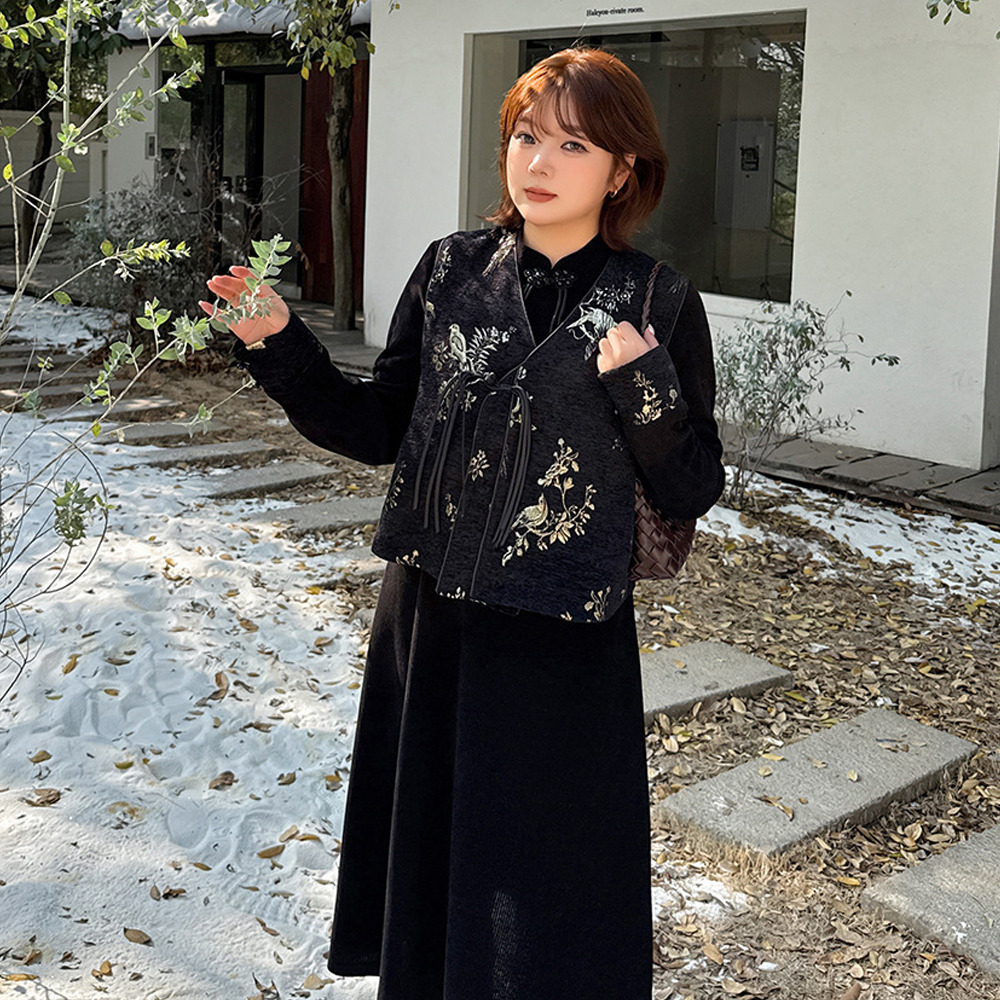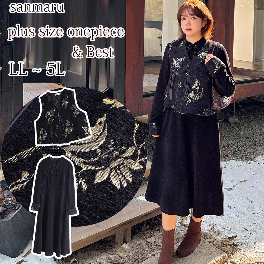 「チャイナカラーニットワンピース&花鳥柄ジャガードベスト」