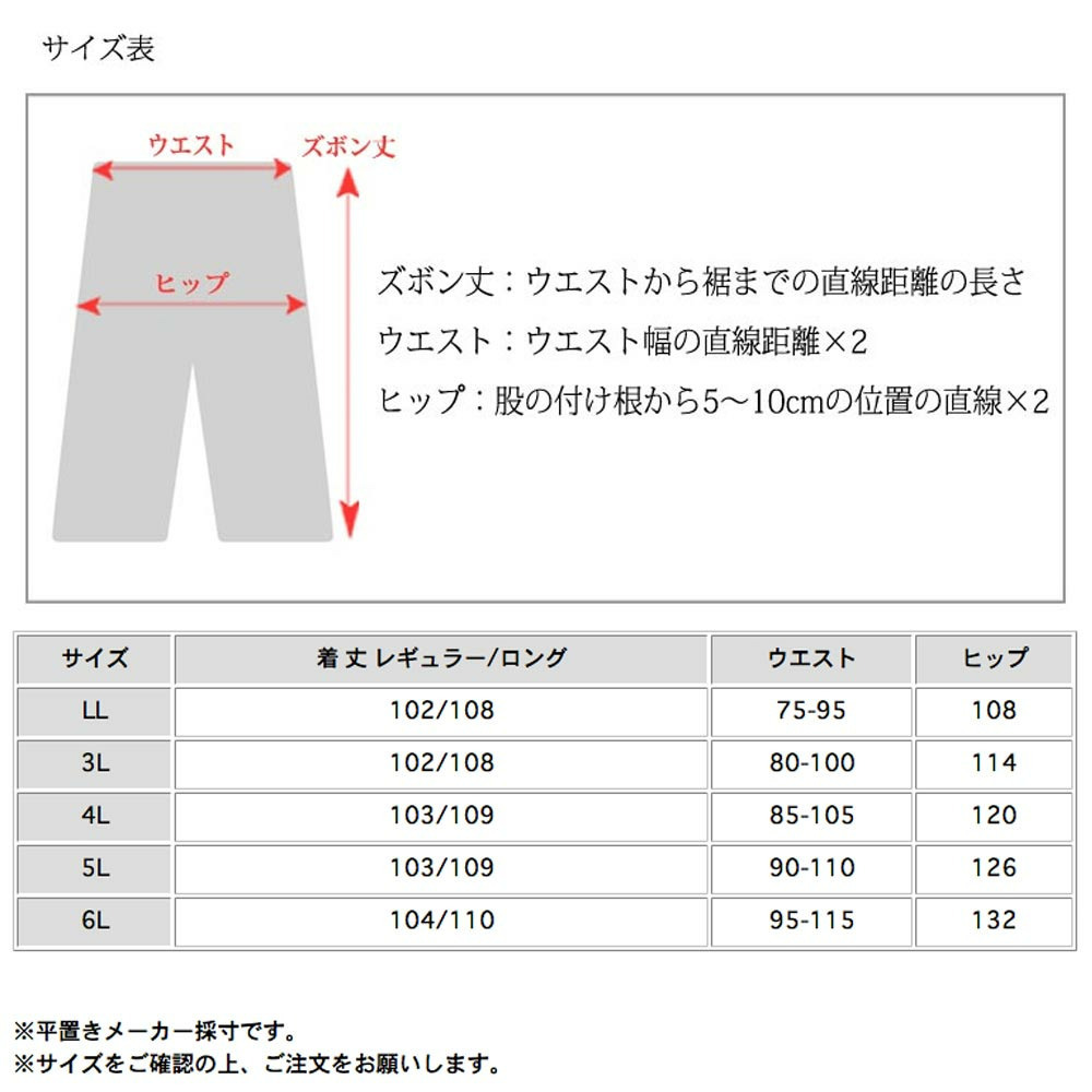 サイズ表記 LL 3L 4L 5L 6L 着丈 102cm 102cm 103cm 103cm 104cm ウエスト 75-95cm 80-100cm 85-105cm 90-110cm 95-115cm ヒップ 108cm 114cm 120cm 126cm 132cm
