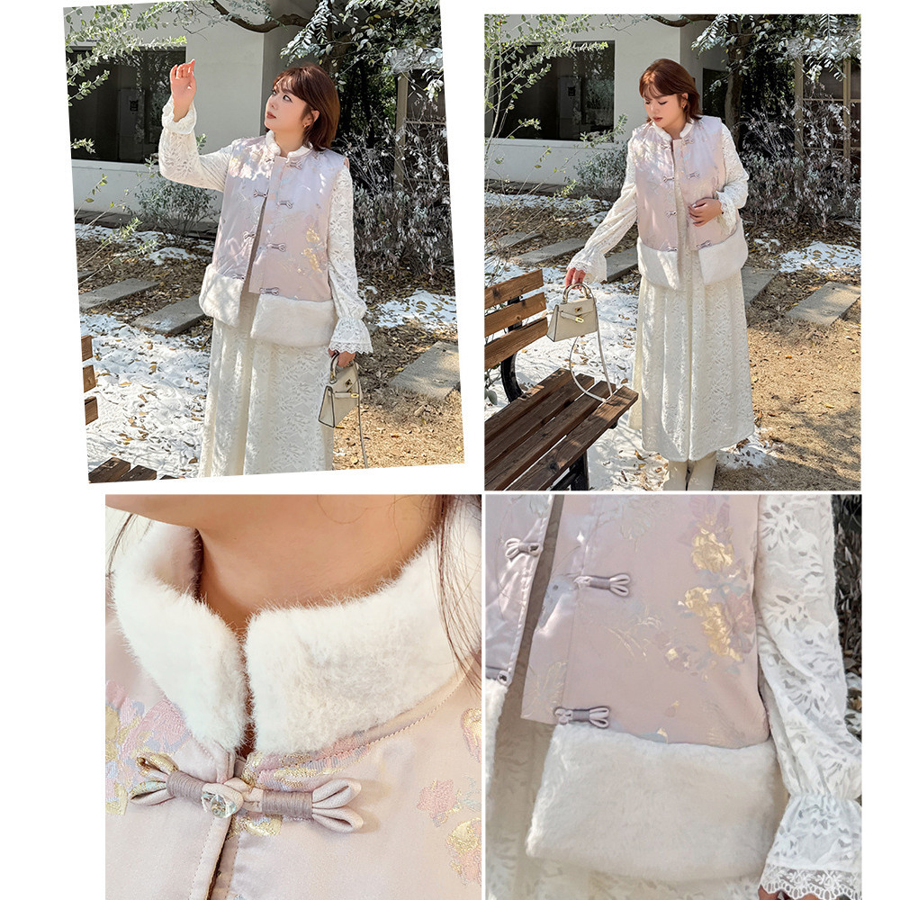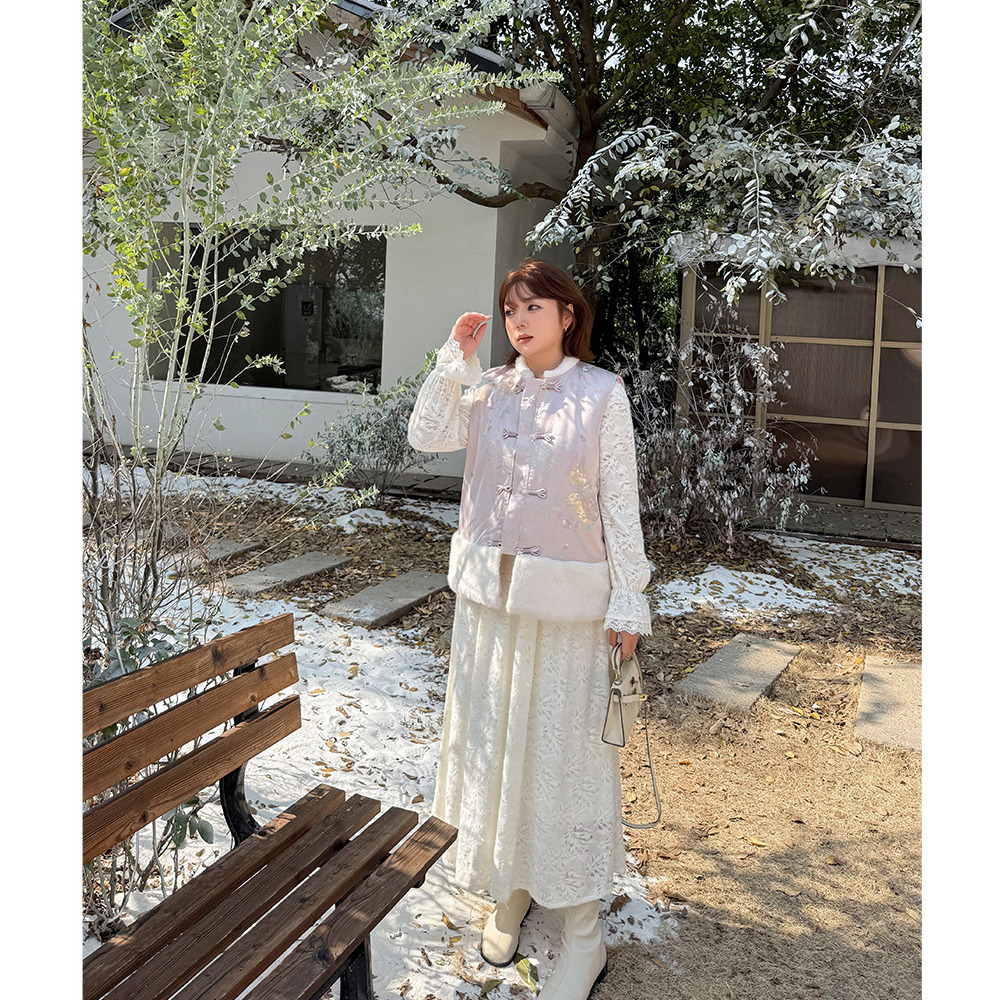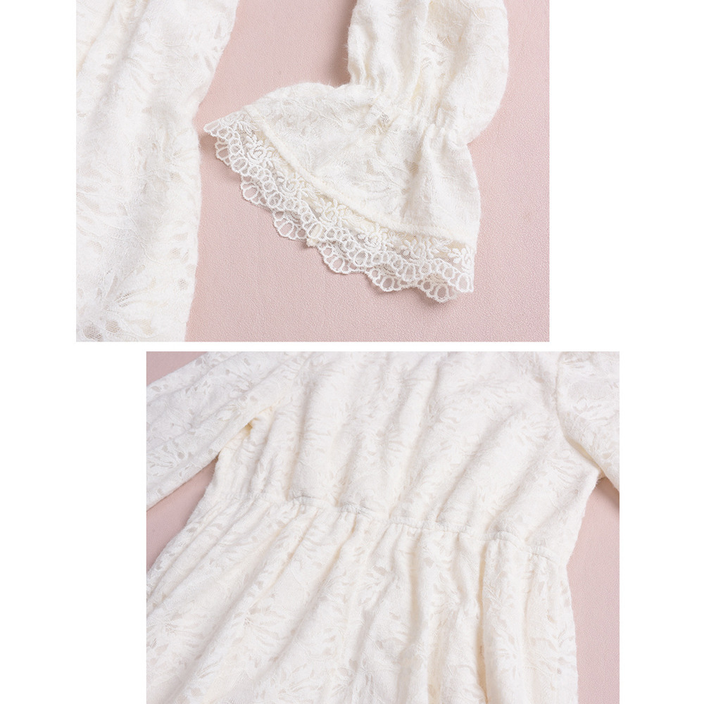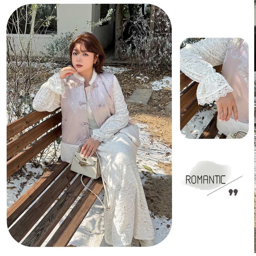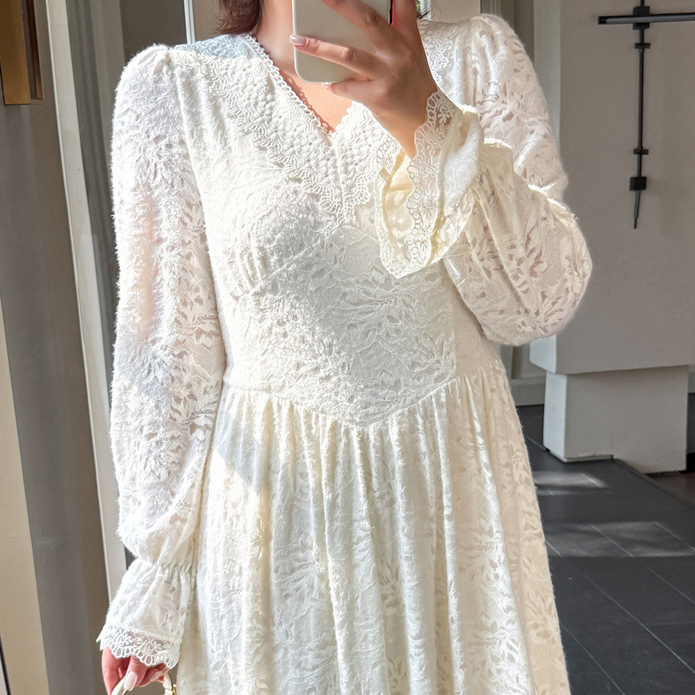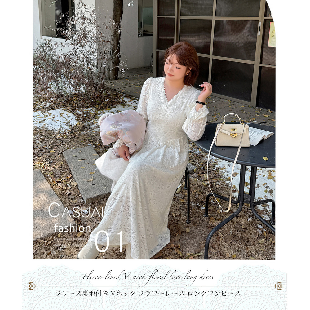 暖かなフリース裏地付きの花柄レースワンピース。