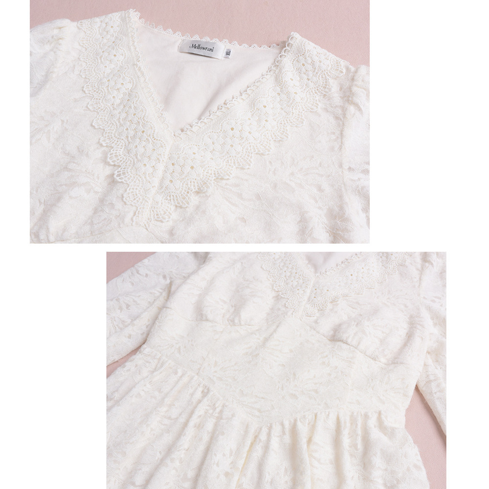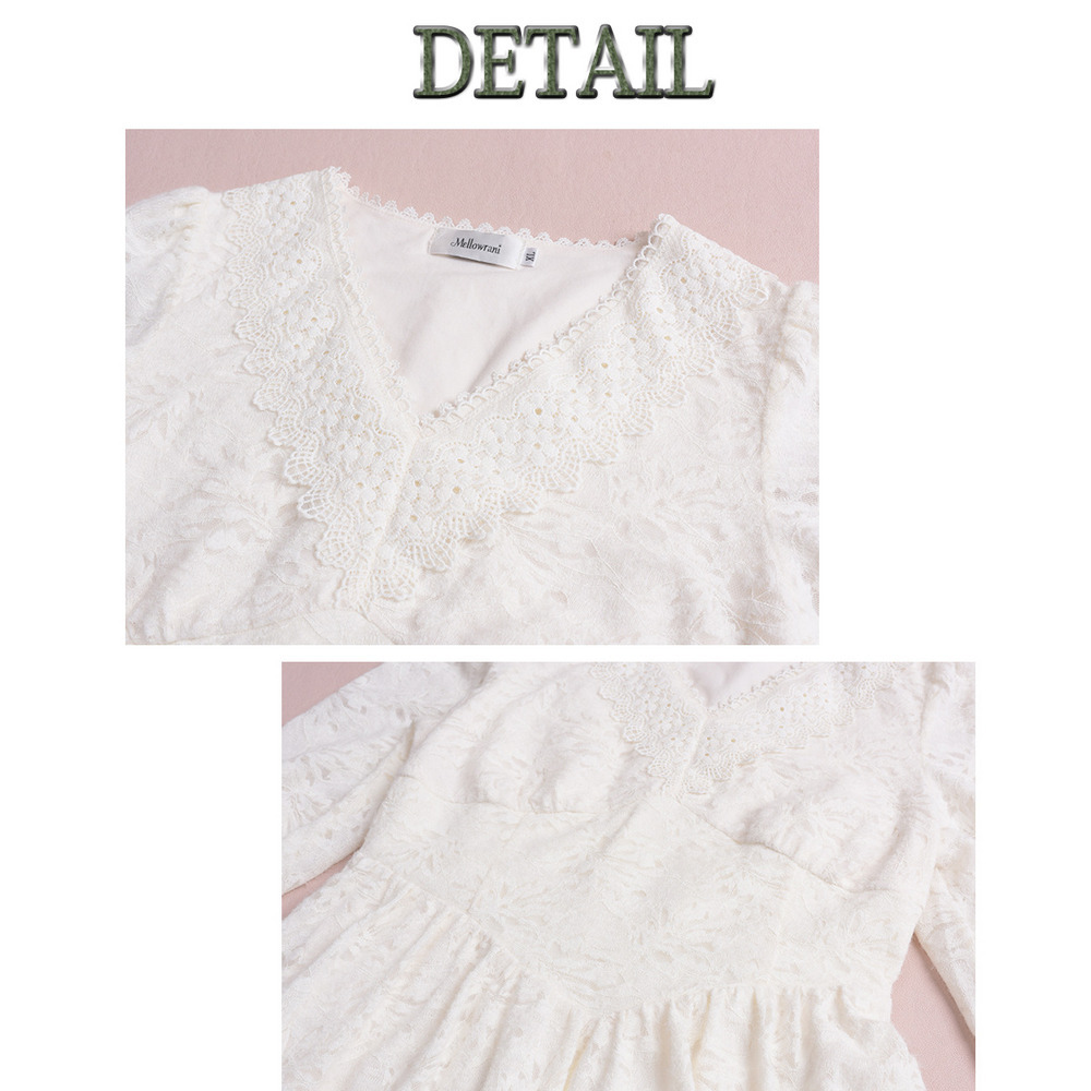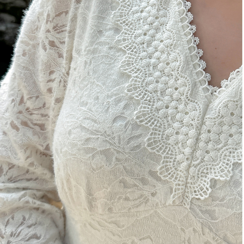 幅広のレースリボン縁取りのVネックもエレガント!