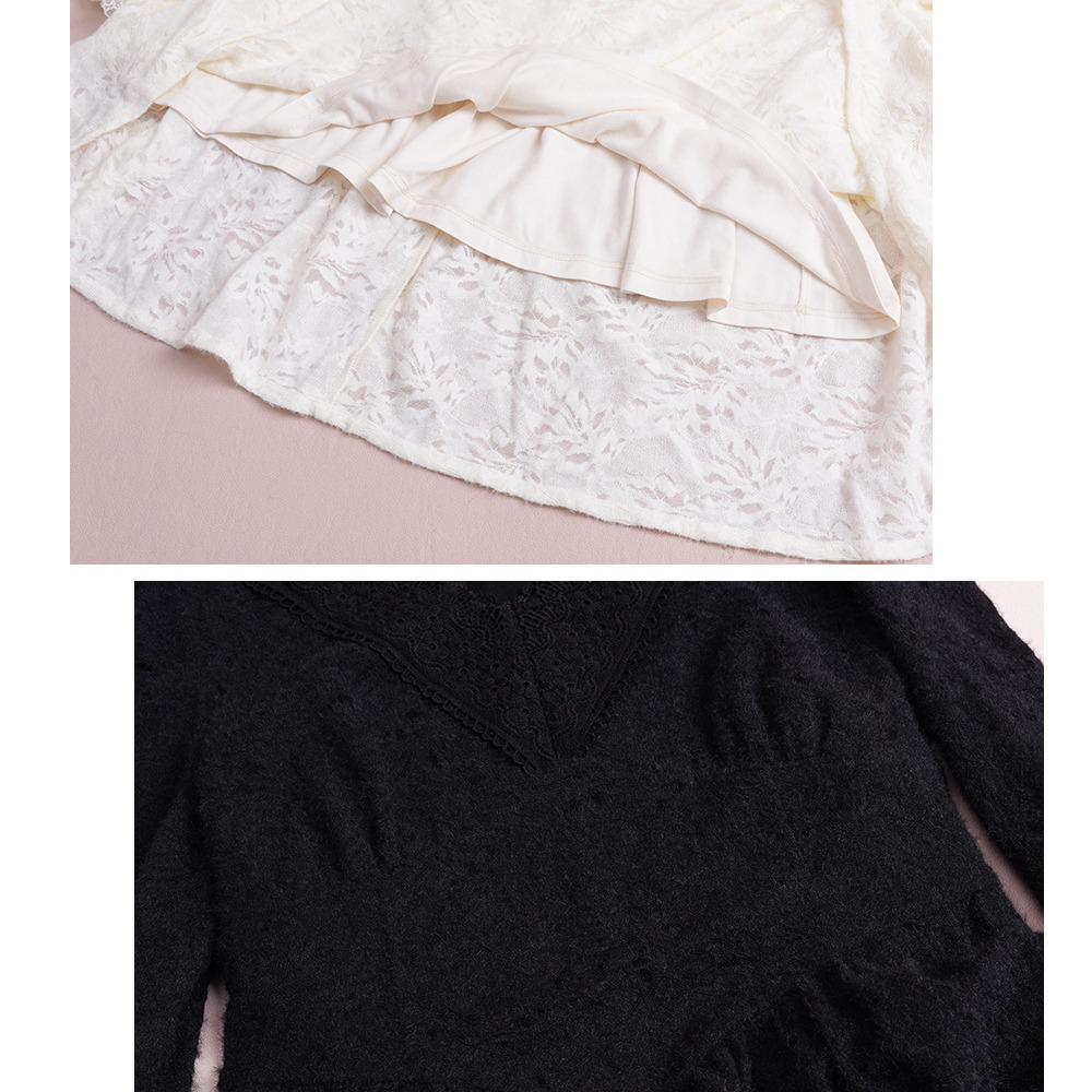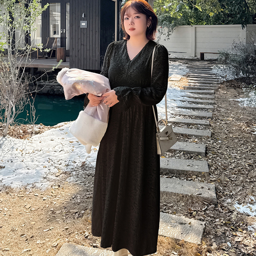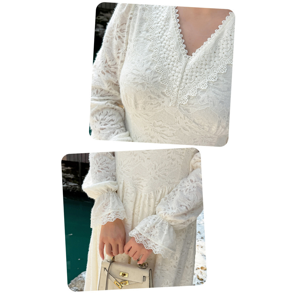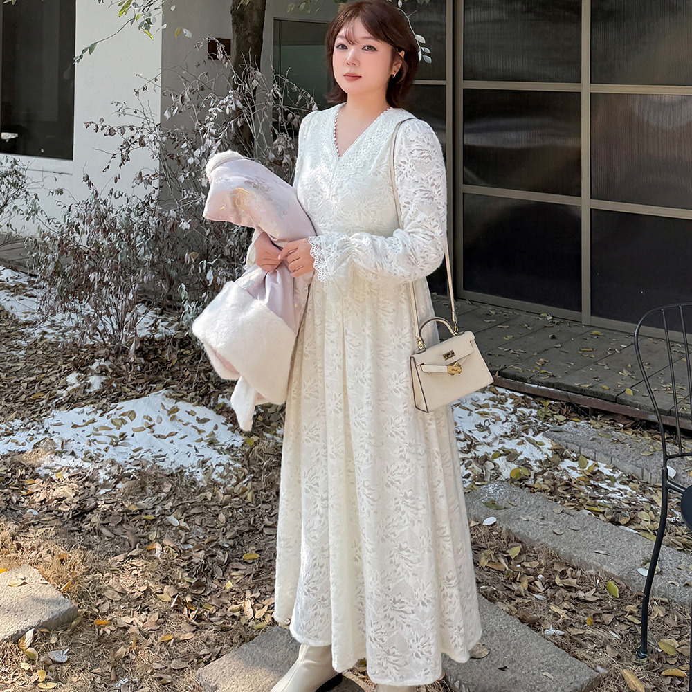 暖かなフリース裏地付き 花柄レースのエレガントなフレアワンピース