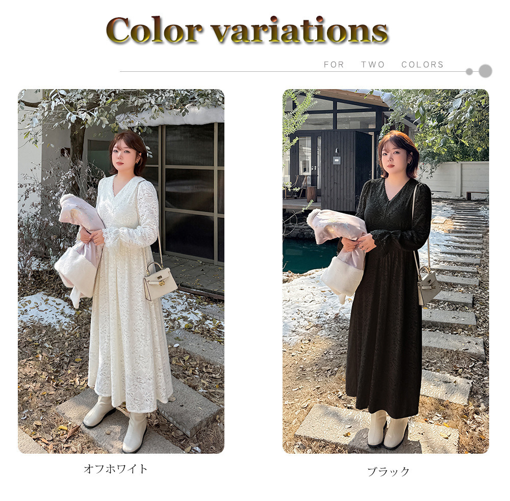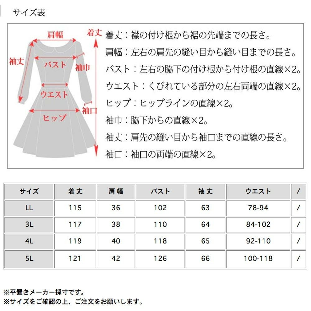 サイズ表記 LL 3L 4L 5L 着丈 115cm 117cm 119cm 121cm 肩幅 36cm 38cm 40cm 42cm バスト 102cm 110cm 118cm 126cm 袖丈 63cm 64cm 65cm 66cm ウエスト 78-94cm 84-102cm 92-110cm 100-118cm