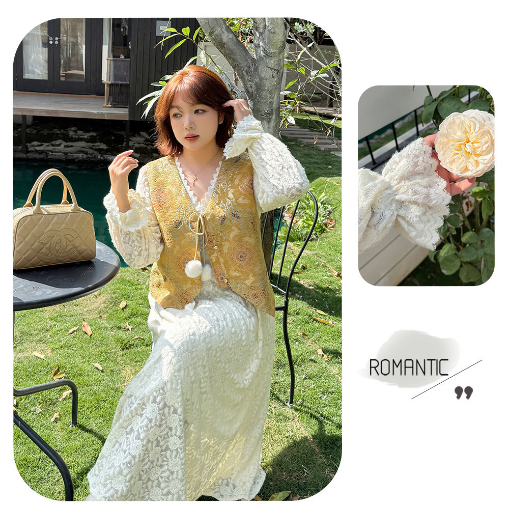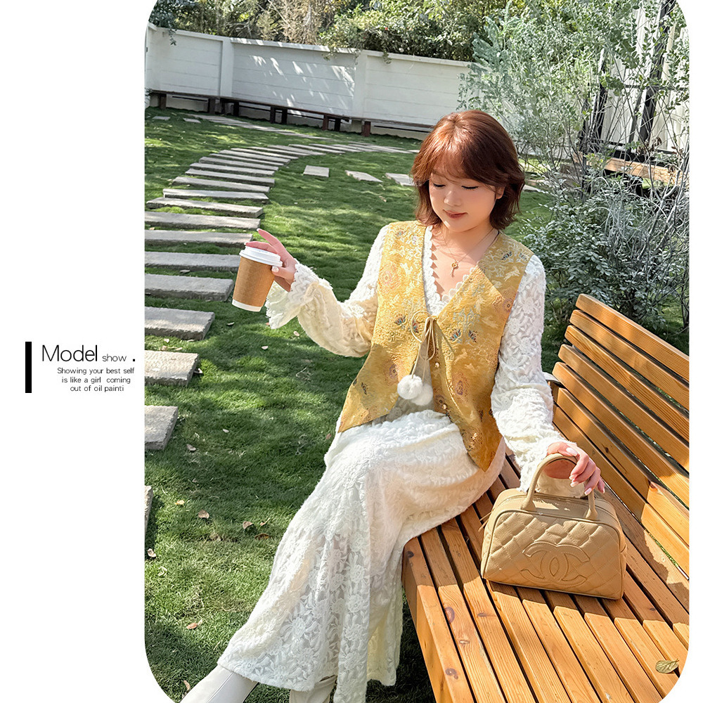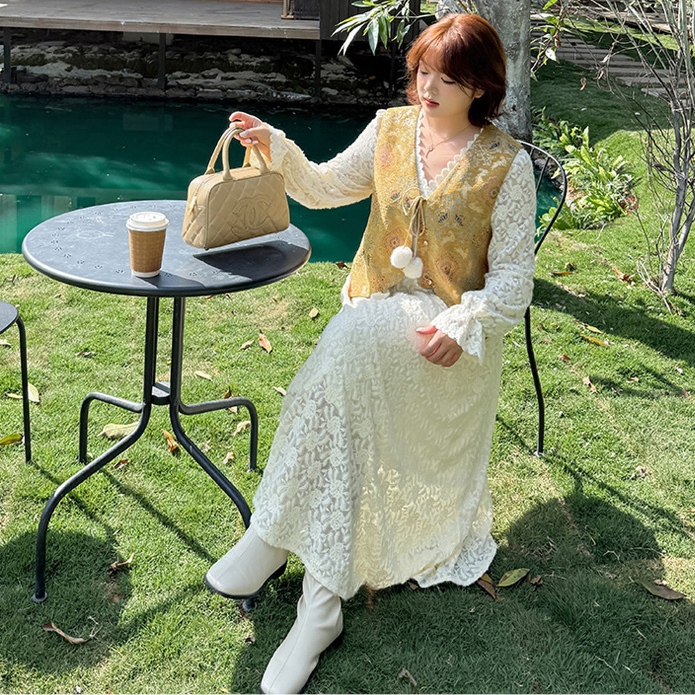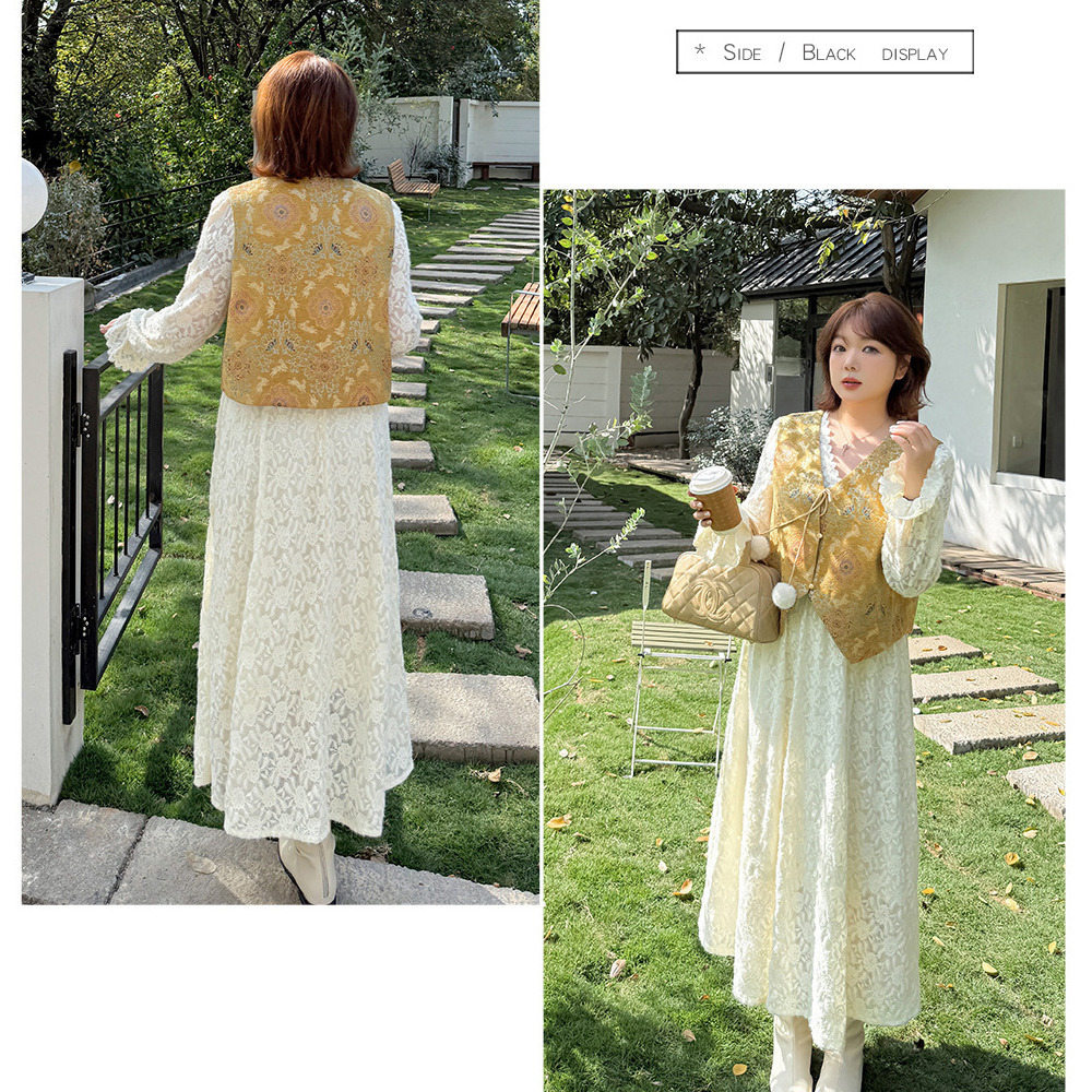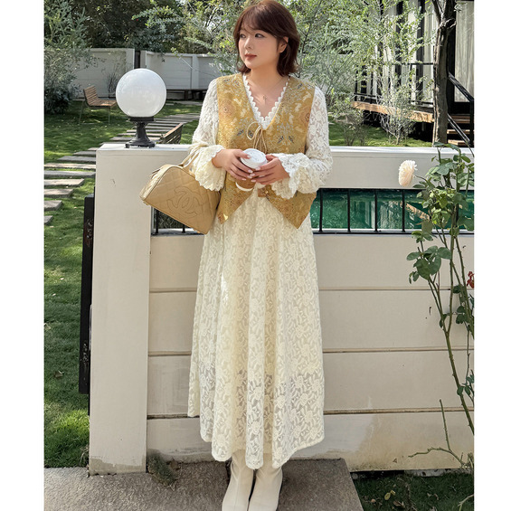 Vネックレースワンピースとジャガード織りベストのセットアップ。