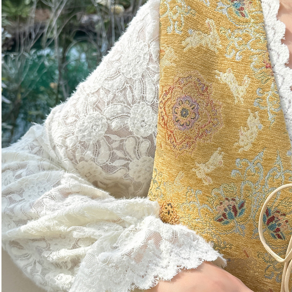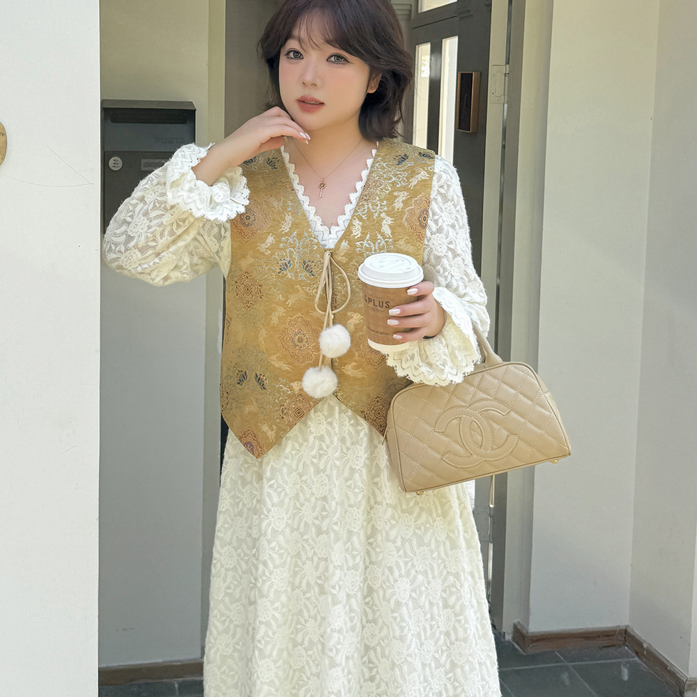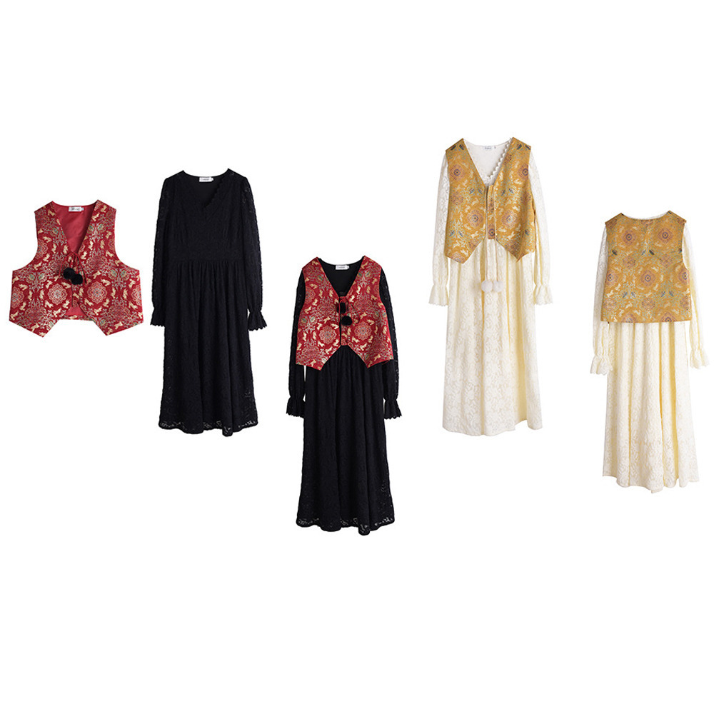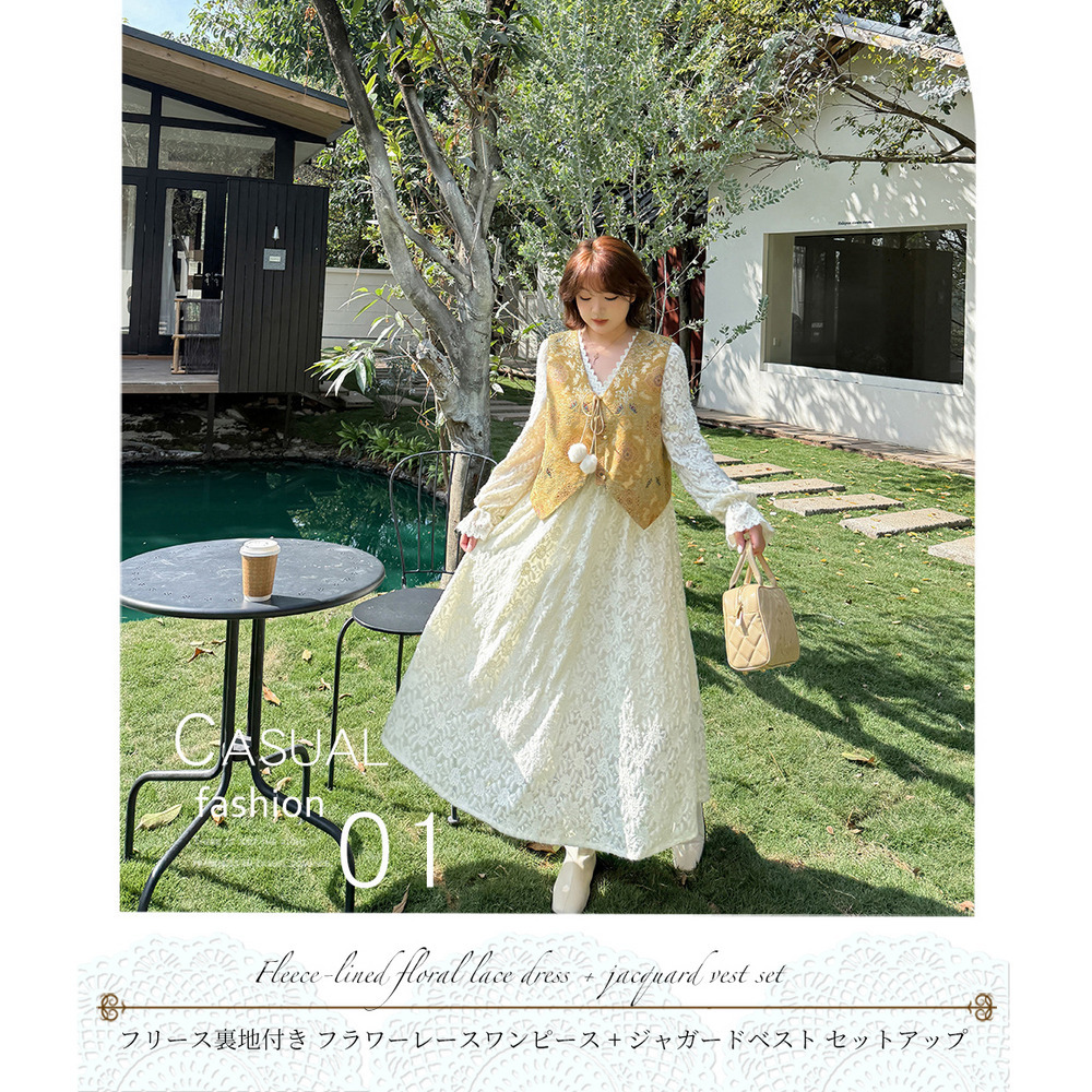 起毛レースワンピースと古典柄ジャガードベストのセットアップ