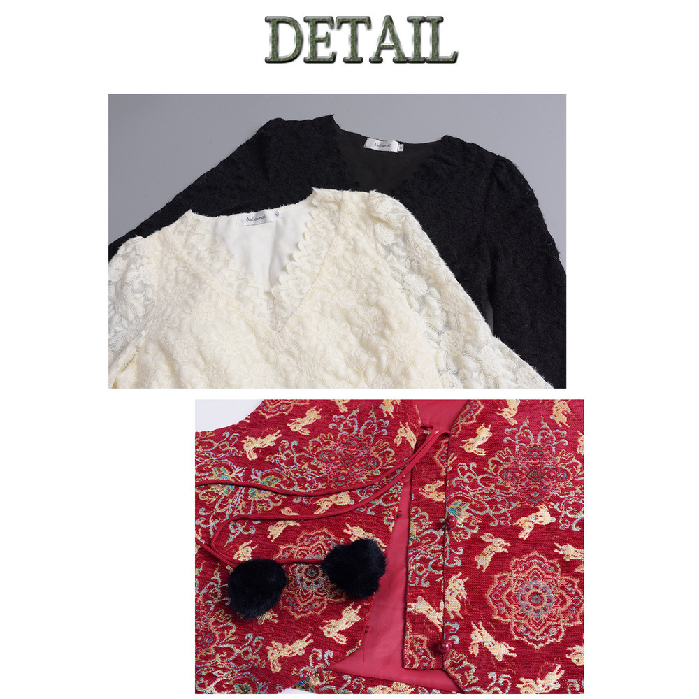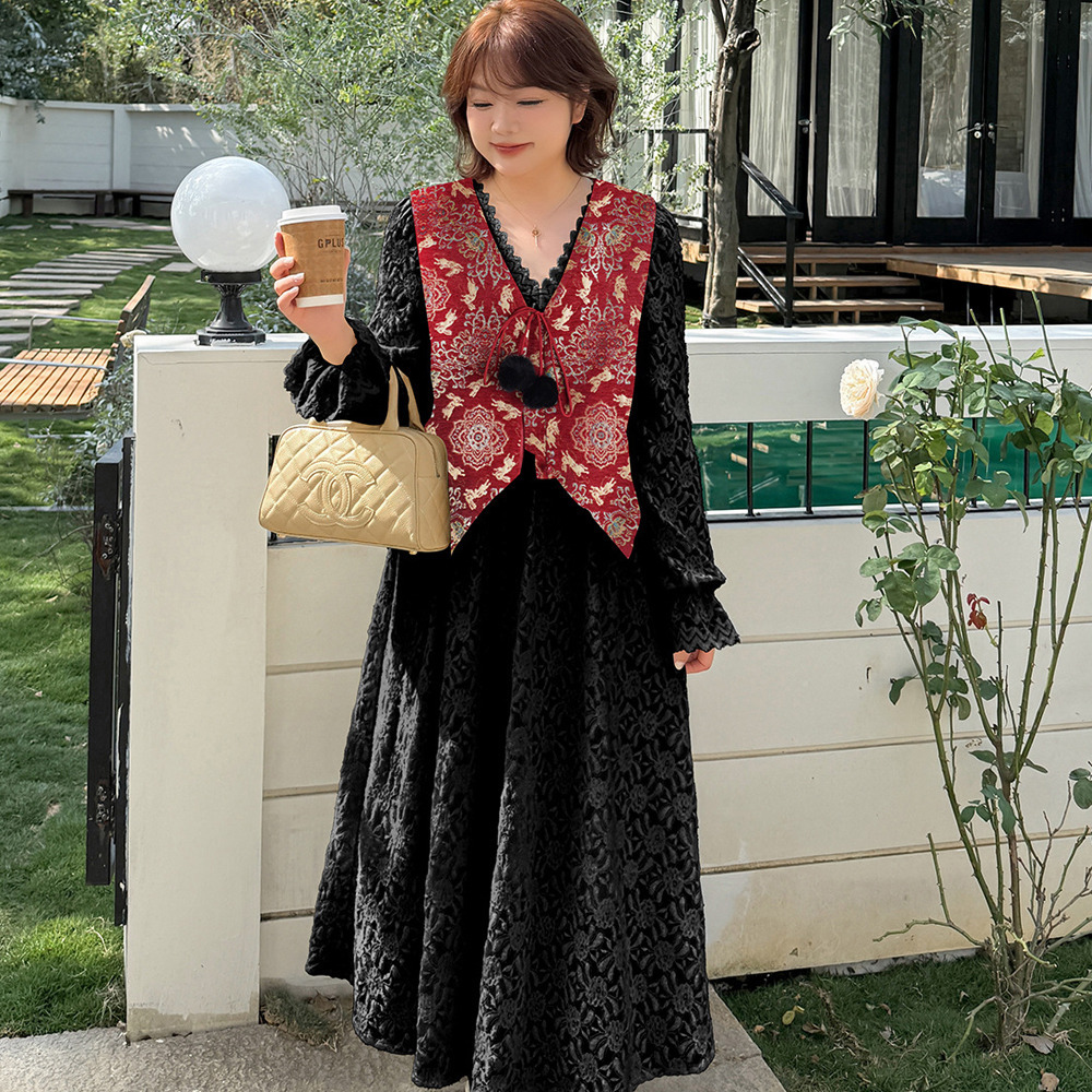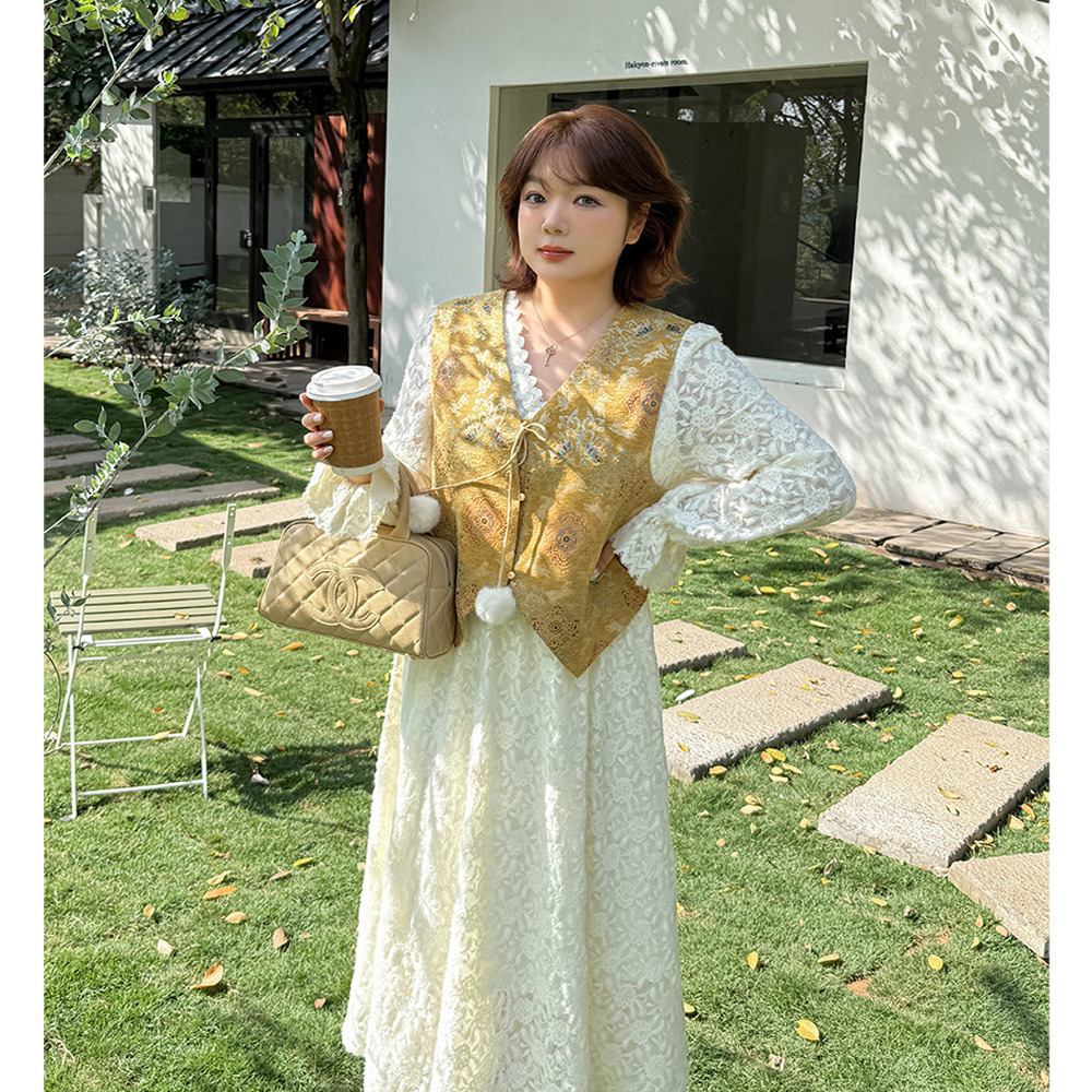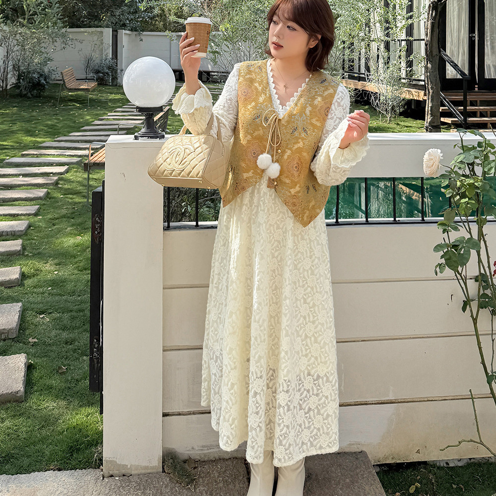 起毛レースワンピースと古典柄ジャガードベストのセットアップ