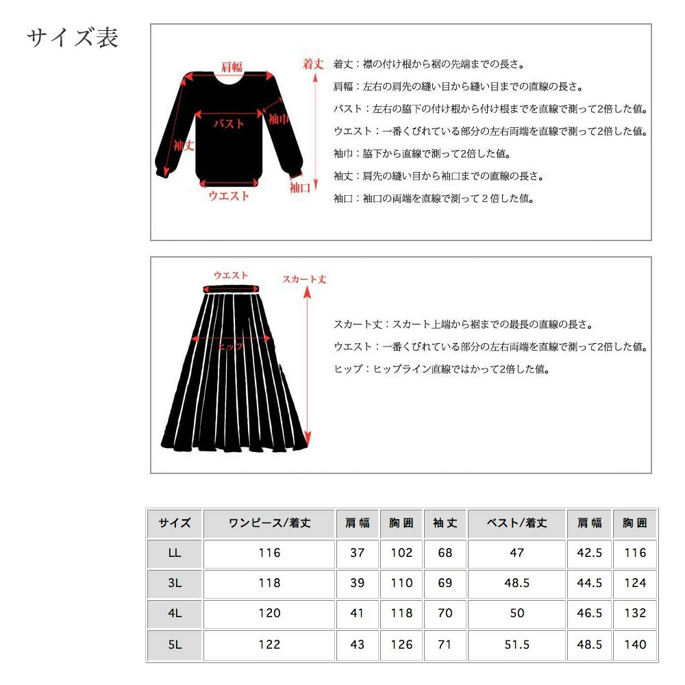 サイズ表記 LL 3L 4L 5L ワンピース着丈 116cm 118cm 120cm 122cm 肩幅 42.5cm 44.5cm 46.5cm 48.5cm 胸囲 116cm 124cm 132cm 140cm 袖丈 68cm 69cm 70cm 71cm ベスト着丈 47cm 48.5cm 50cm 51.5cm 肩幅 42.5cm 44.5cm 46.5cm 48.5cm 胸囲 116cm 124cm 132cm 140cm