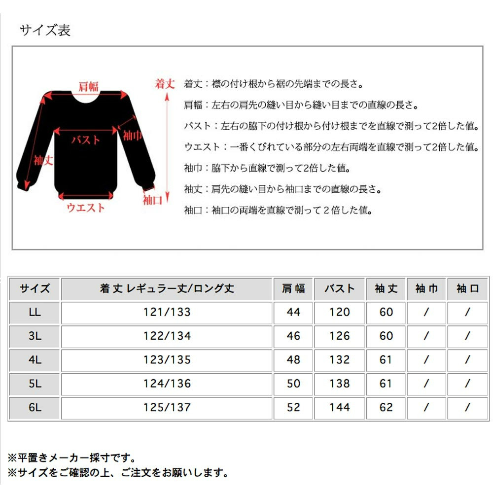 サイズ表記 LL 3L 4L 5L 6L 着丈レギュラー丈/ロング丈 121/133 122/134 123/135 124/136 125/137 肩幅 44 46 48 50 52 バスト 120 126 132 138 144 袖丈 60 60 61 61 62