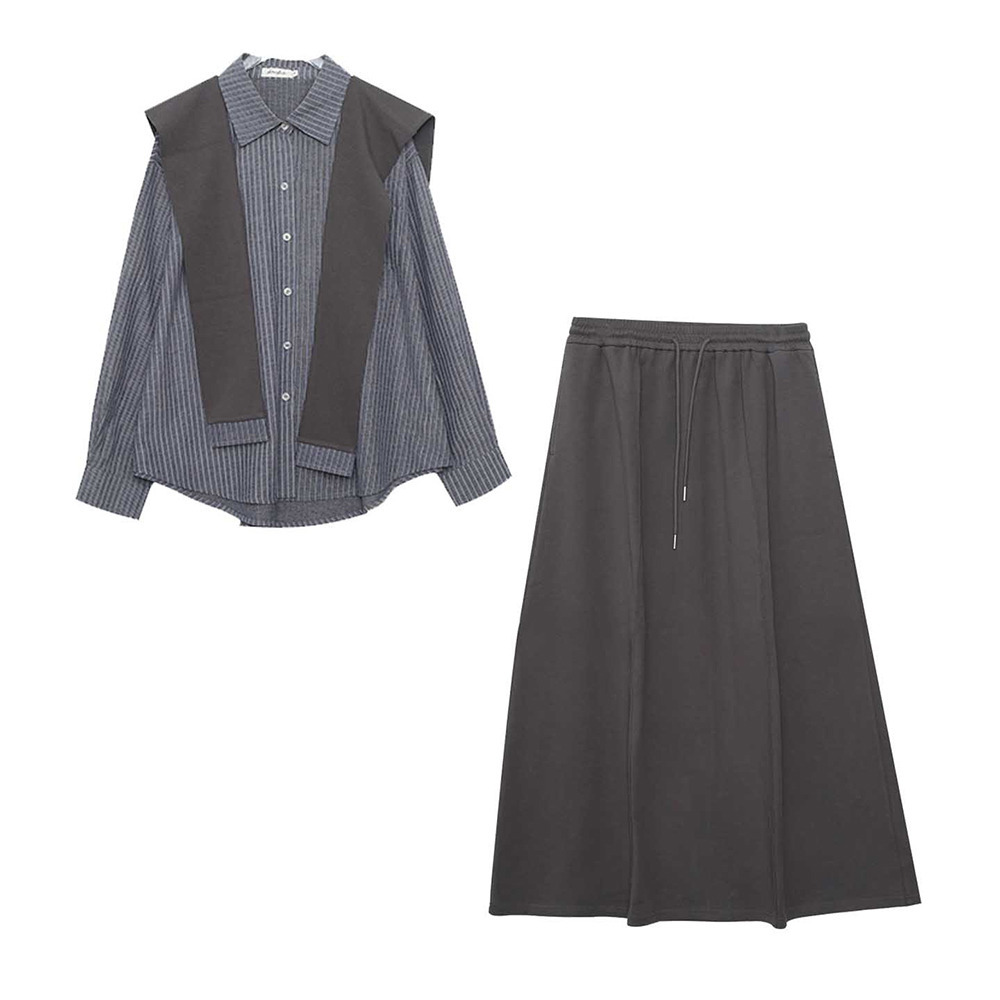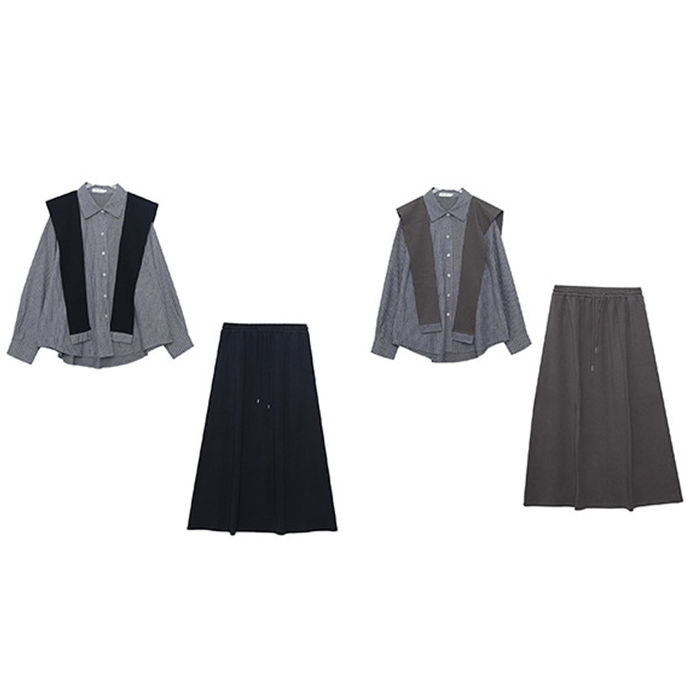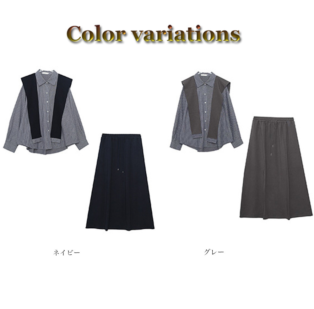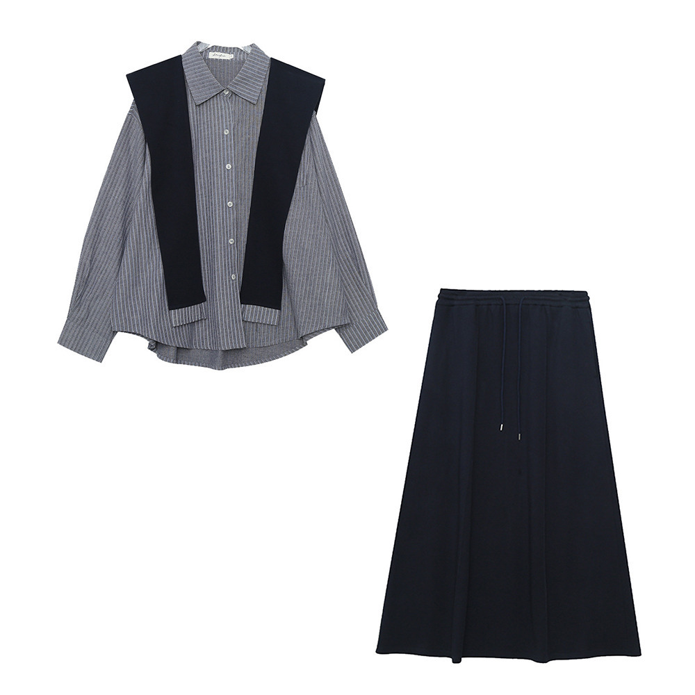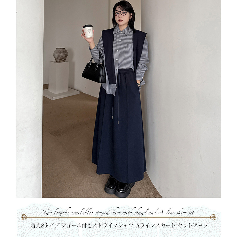 「ショール付きストライうシャツ+Aラインスカートセットアップ」