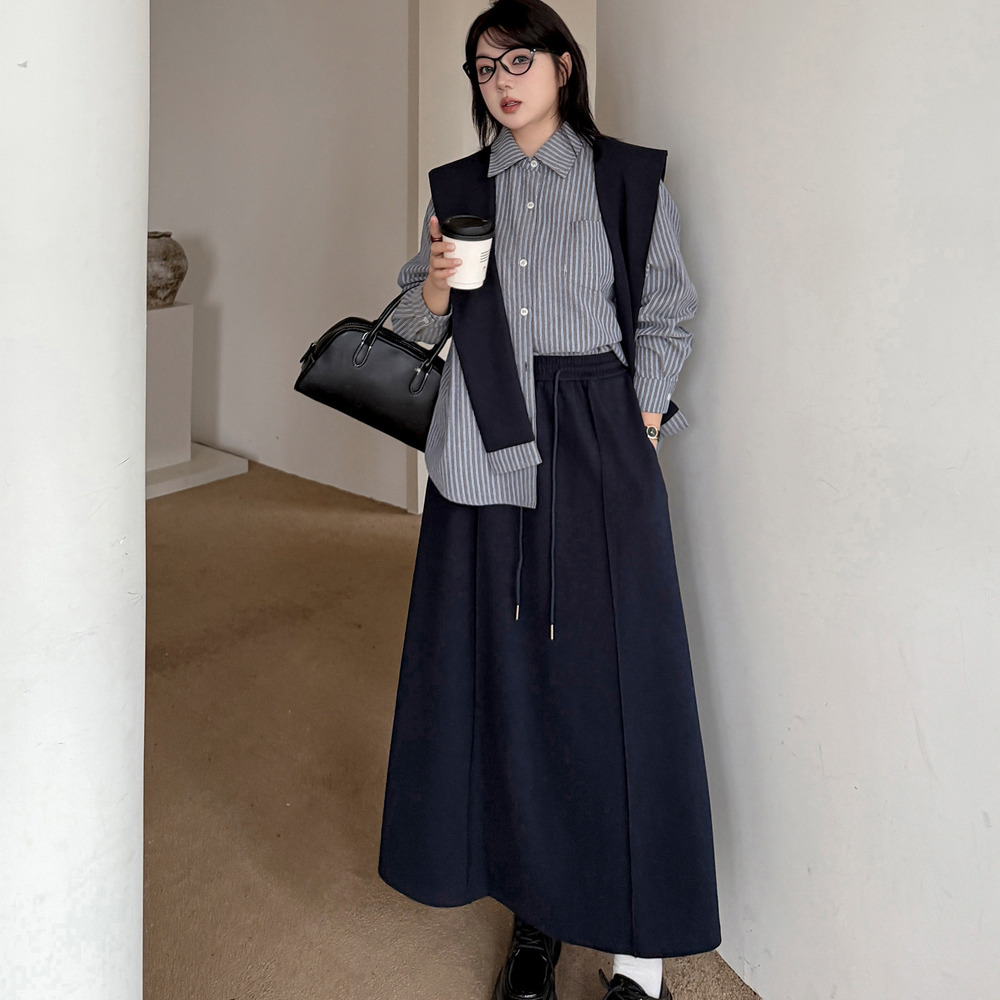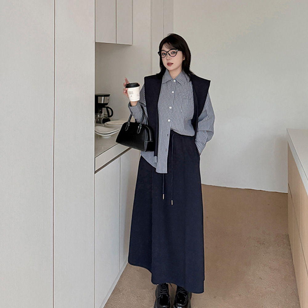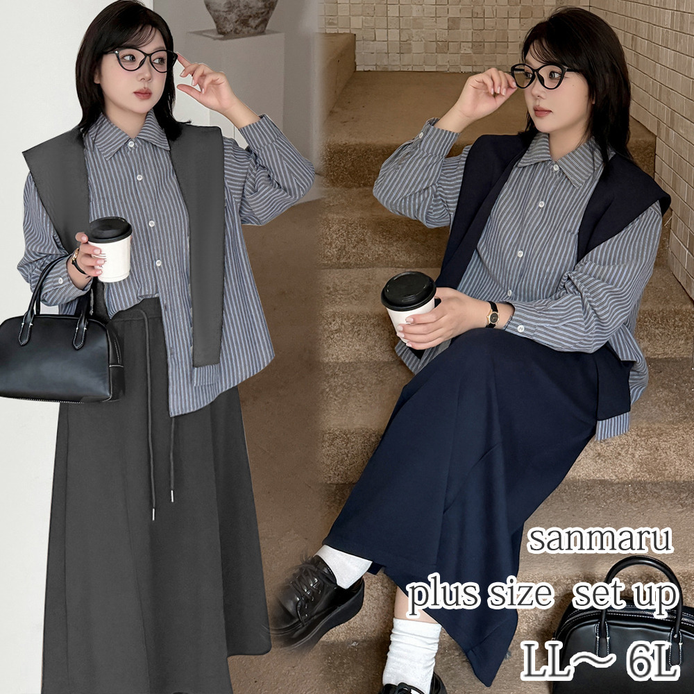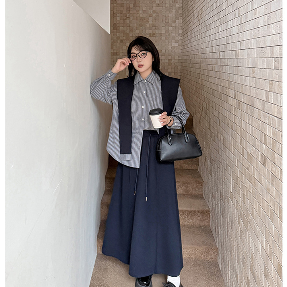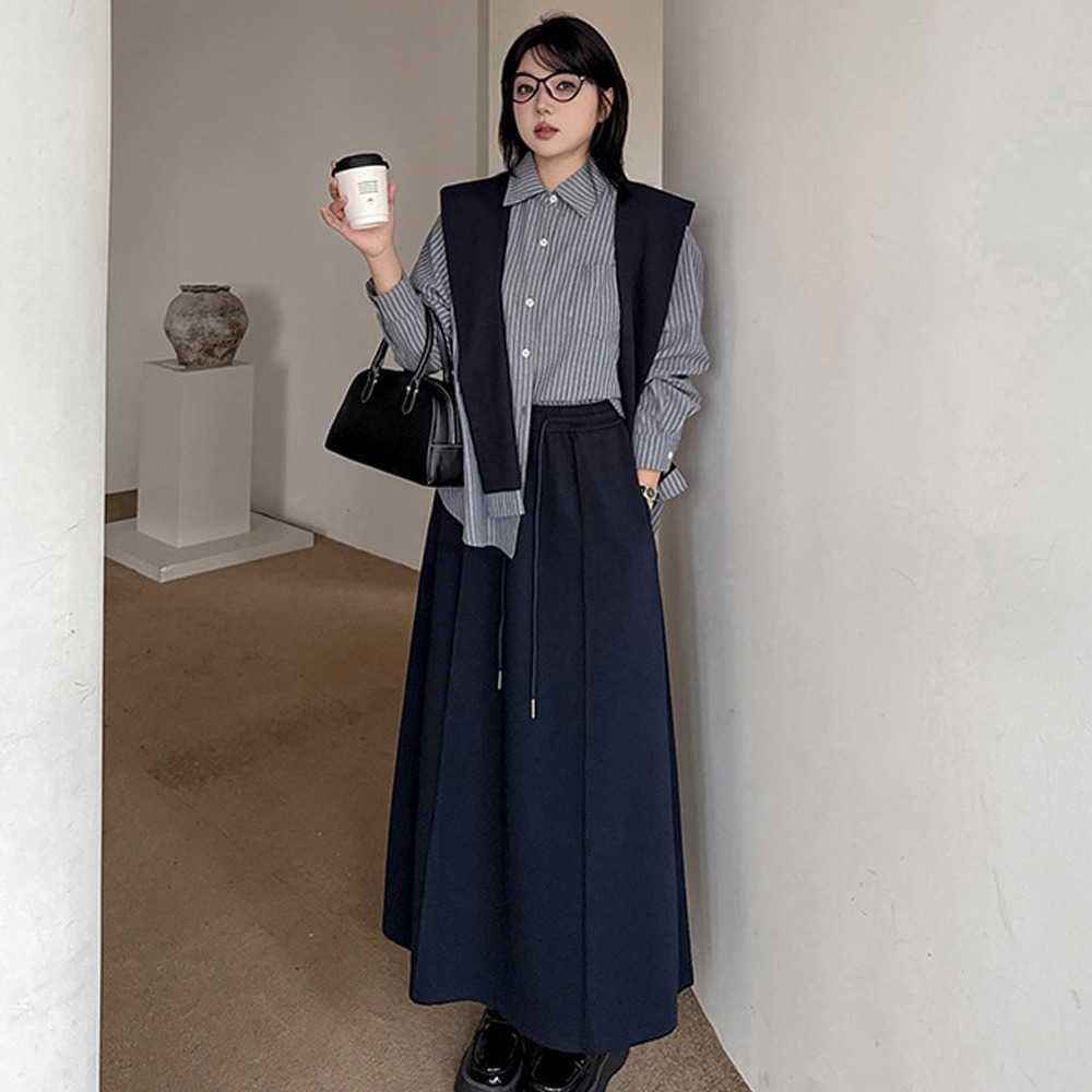 「ショール付きストライうシャツ+Aラインスカートセットアップ」