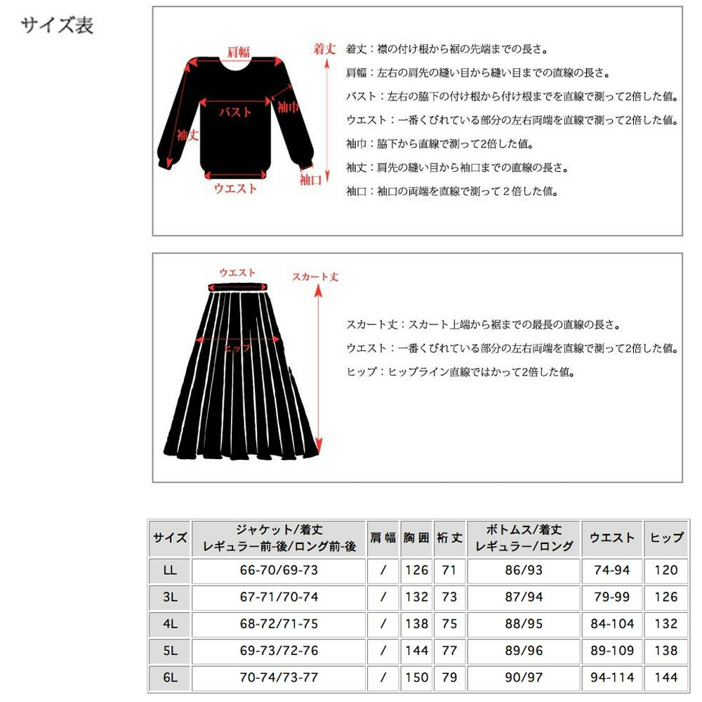 サイズ表記 LL 3L 4L 5L 6L 【ジャケット】着丈レギュラー前-後/ロング前-後 66-70/69-73 67-71/70-74 68-72/71-75 69-73/72-76 70-74/73-77 胸囲 126 132 138 144 150 裄丈 71 73 75 77 79 【ボトムス】/着丈レギュラー/ロング 86/93 87/94 88/95 89/96 90/97 ウエスト 74-94 79-99 84-104 89-109 94-114 ヒップ 120 126 132 138 144