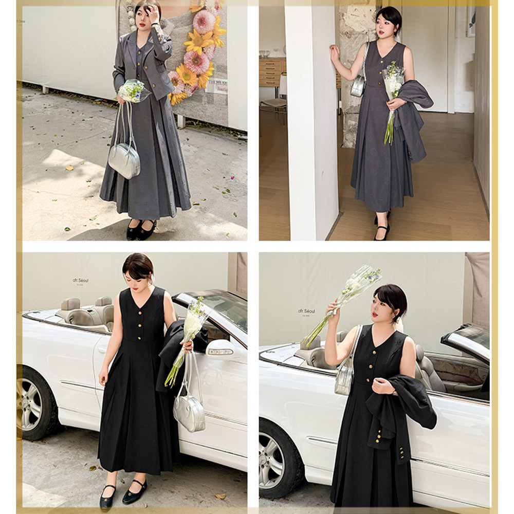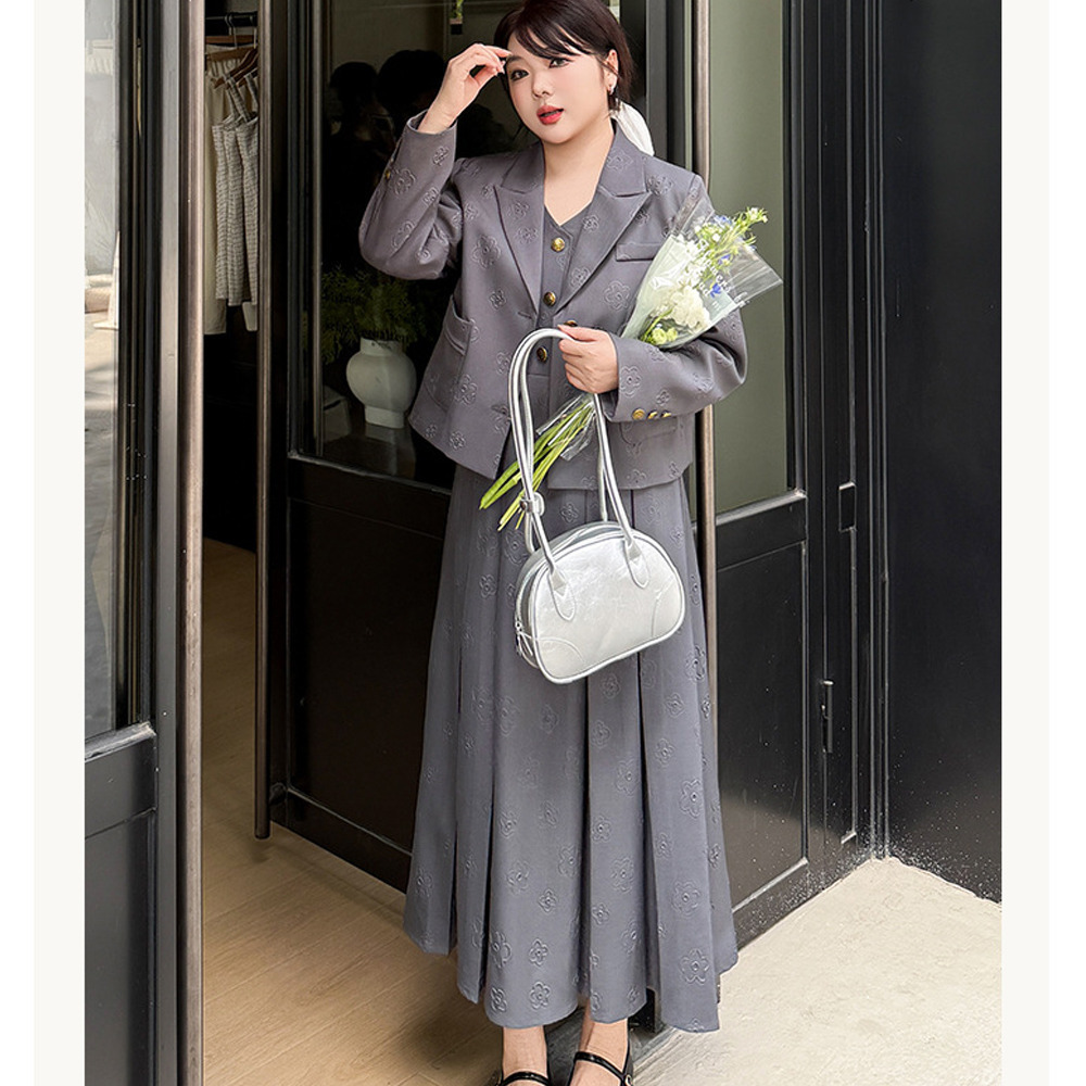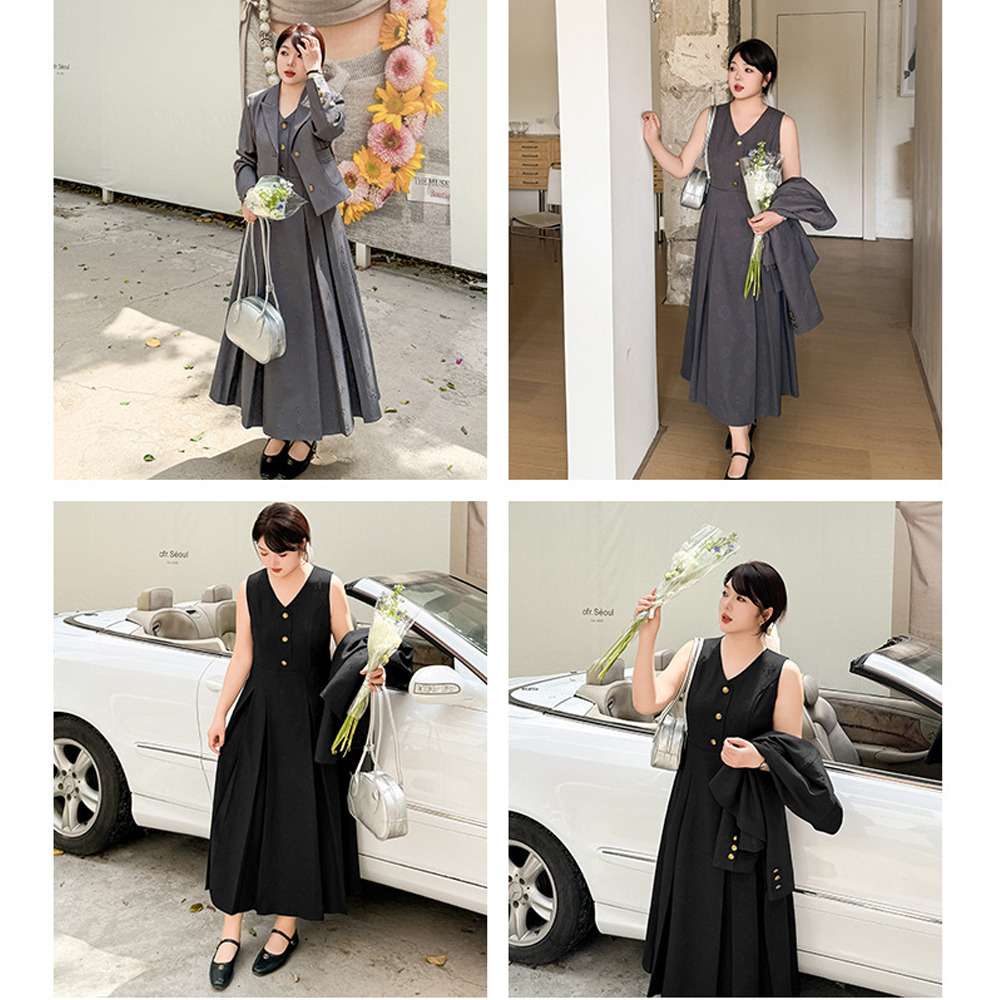 ショート丈のジャケットとハイウエスト切り替えのワンピースでスタイルアップデザイン。