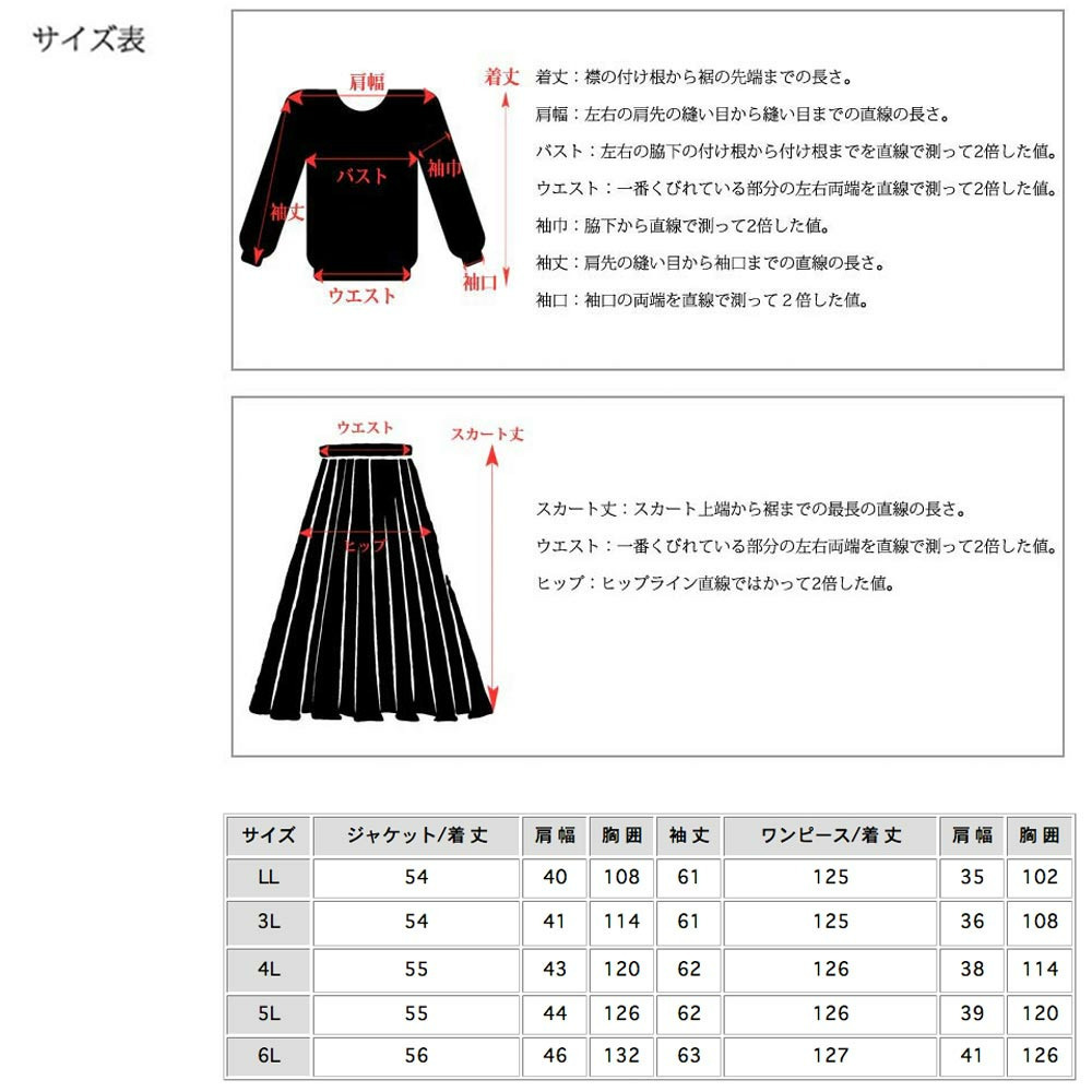 サイズ表記 LL 3L 4L 5L 6L 【ジャケット】着丈 54 54 55 55 56 肩幅 35 36 38 39 41 胸囲 102 108 114 120 126 袖丈 61 61 62 62 63 【ワンピース】着丈 125 125 126 126 127 肩幅 35 36 38 39 41 胸囲 102 108 114 120 126