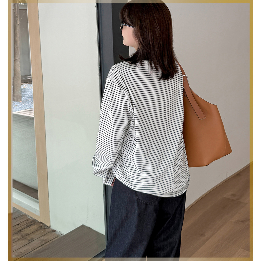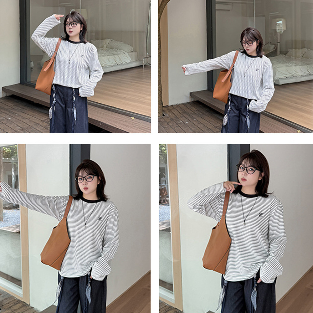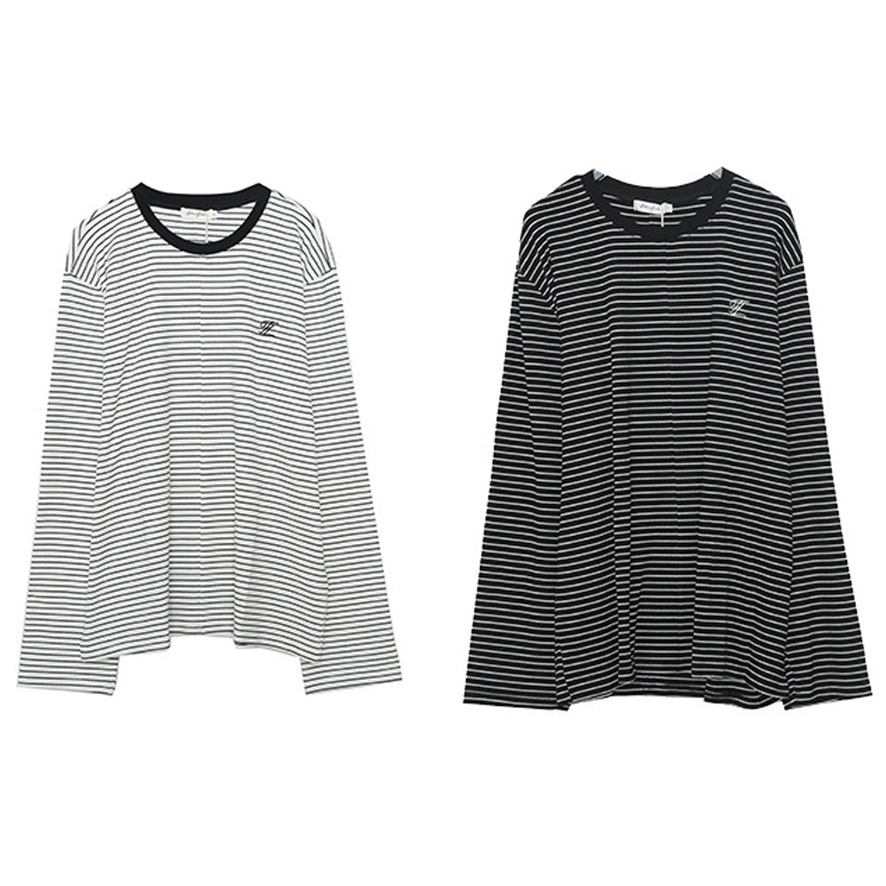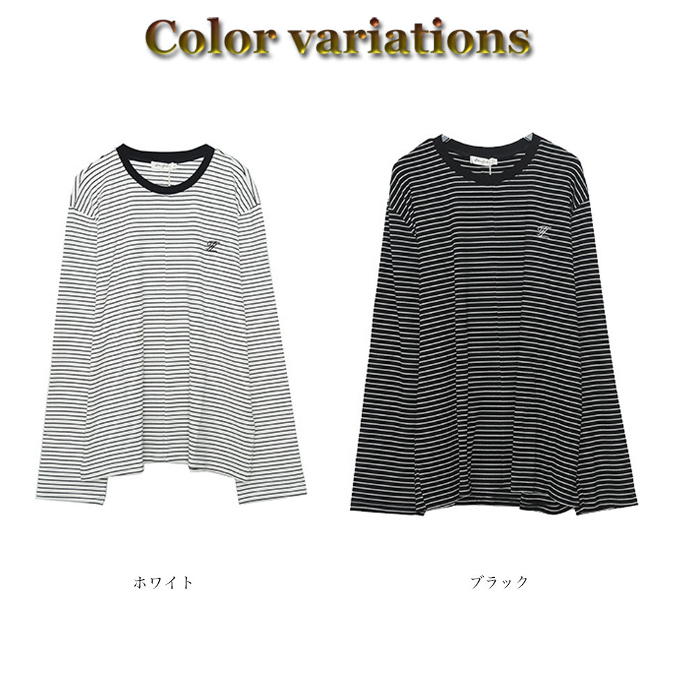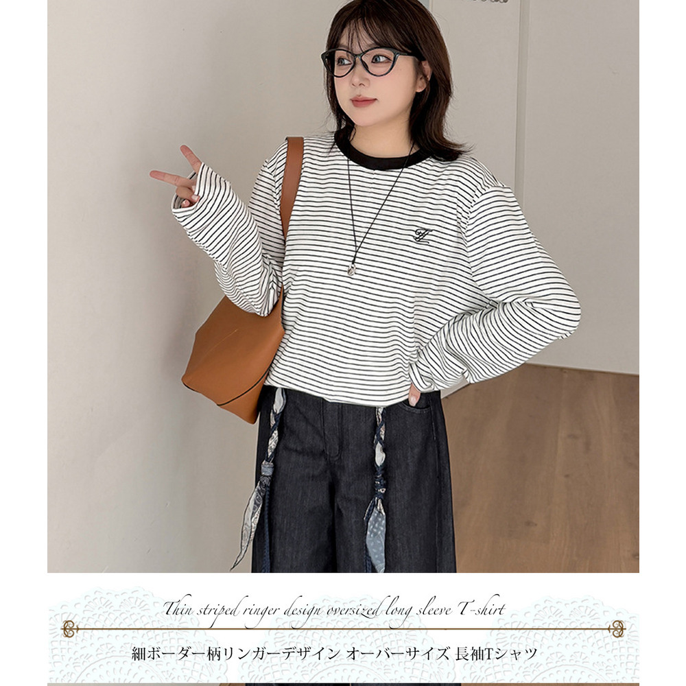 細ボーダー柄で胸英字刺繍入りのオーバーサイズ 長袖Tシャツ