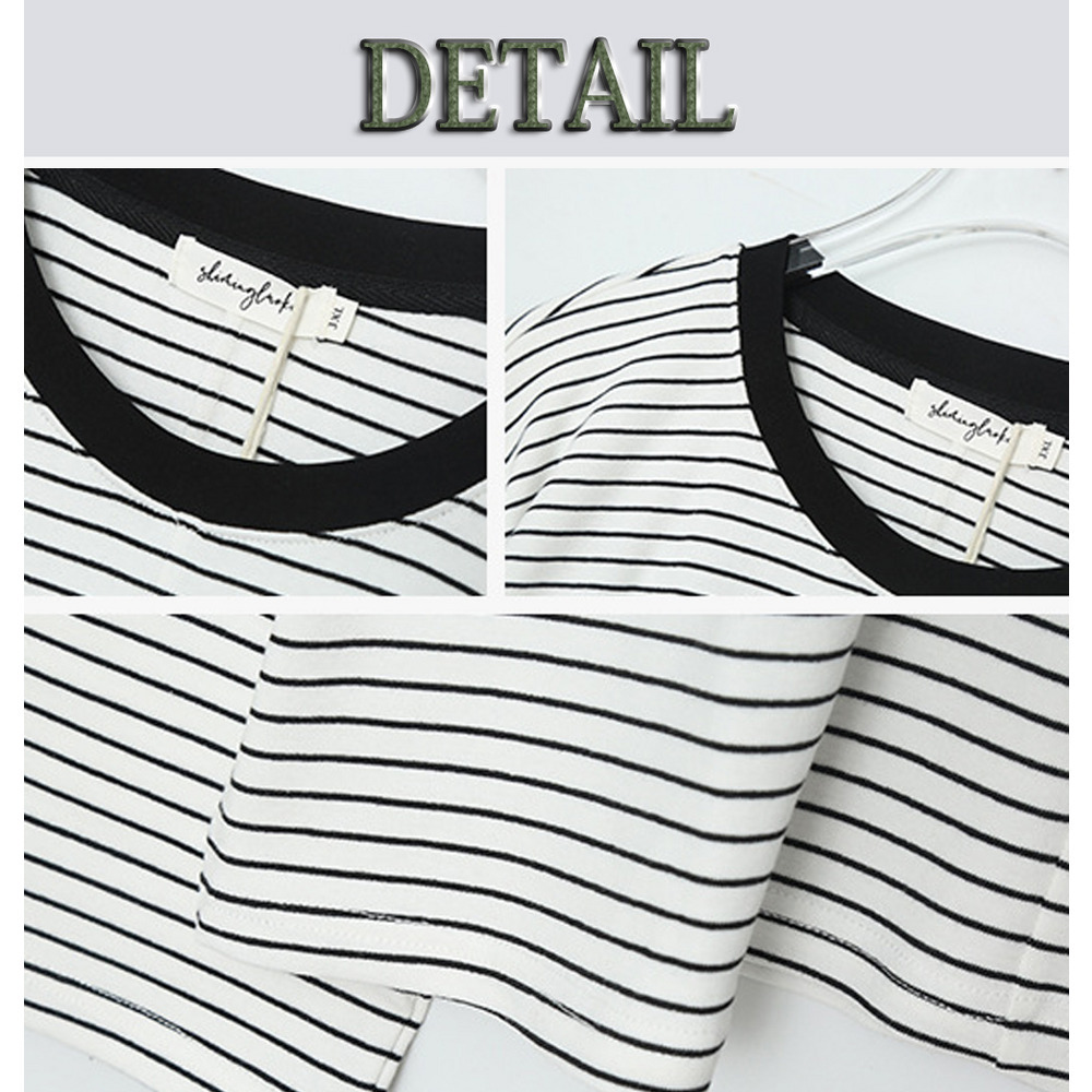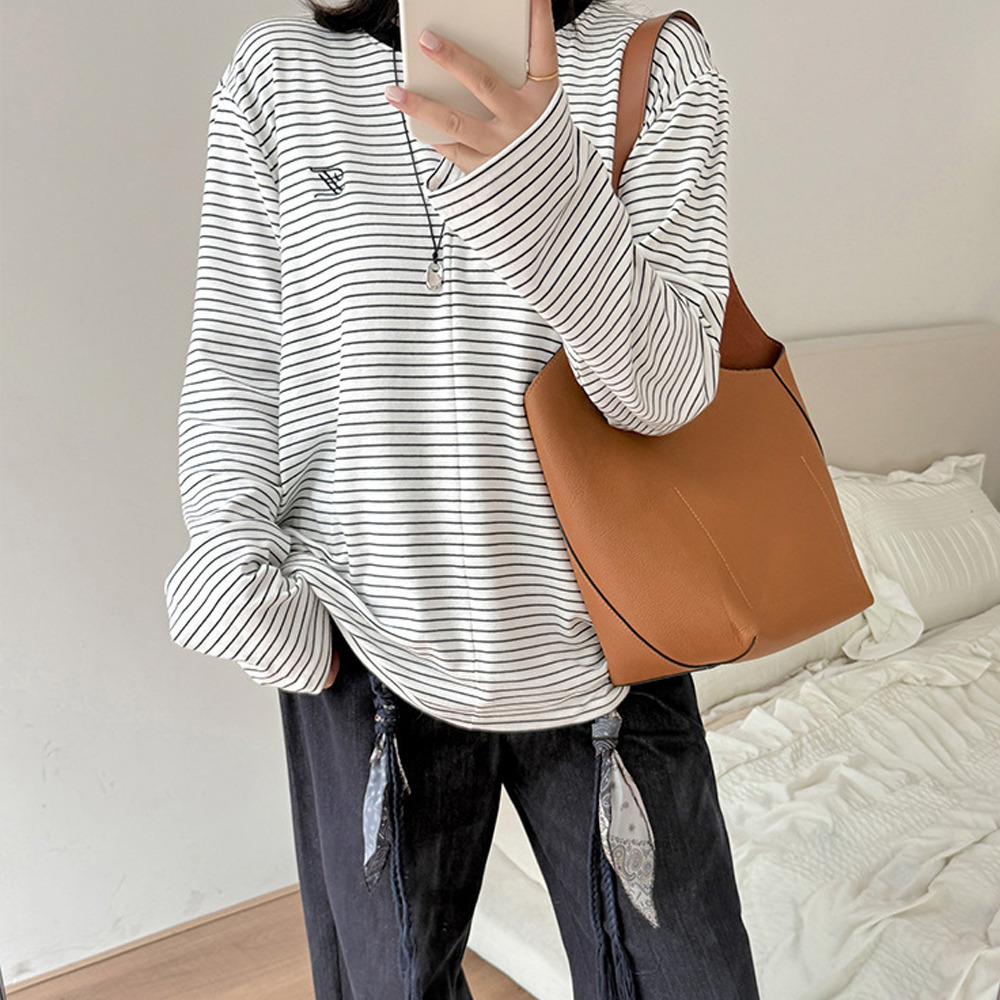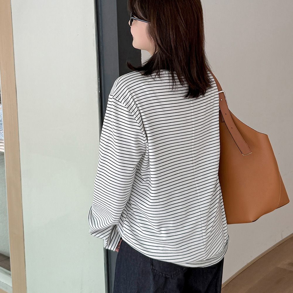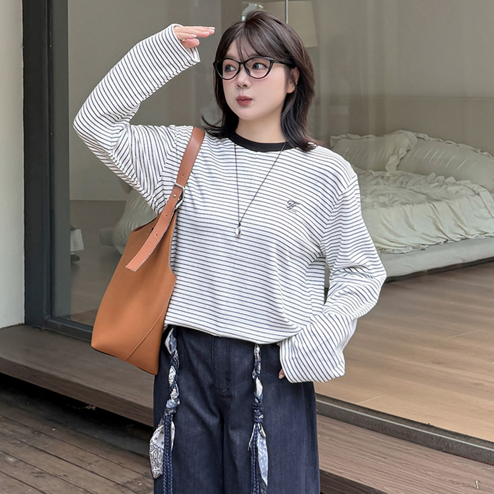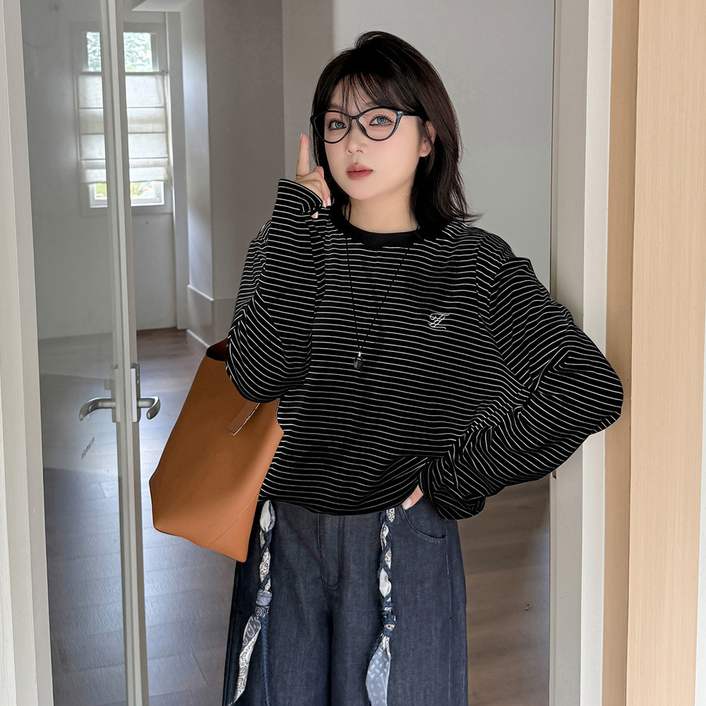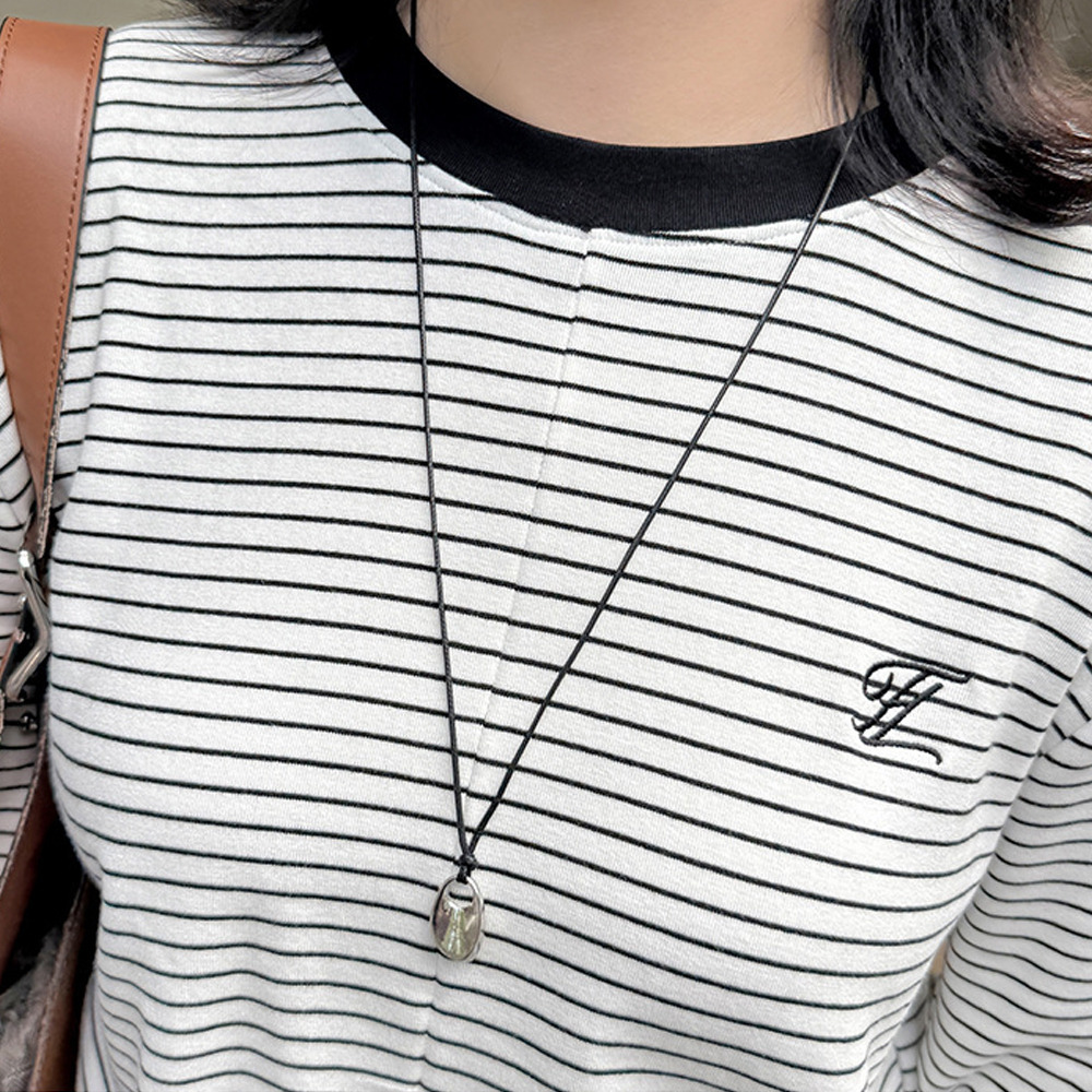 細ボーダー柄で胸英字刺繍入りのオーバーサイズ 長袖Tシャツ