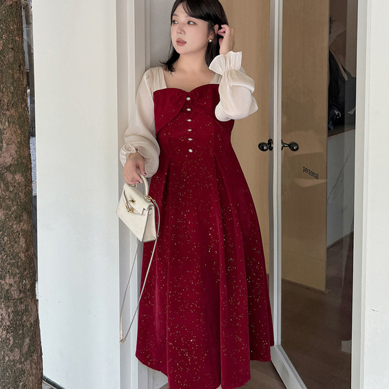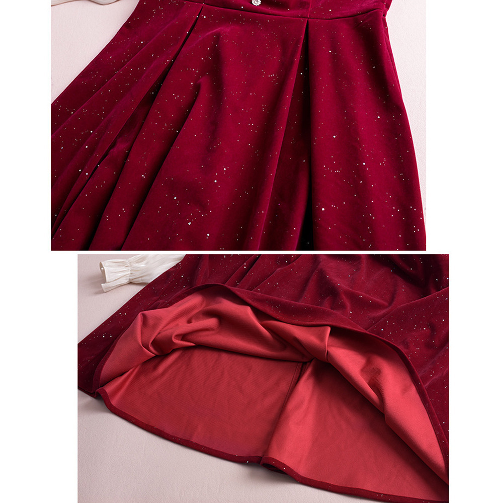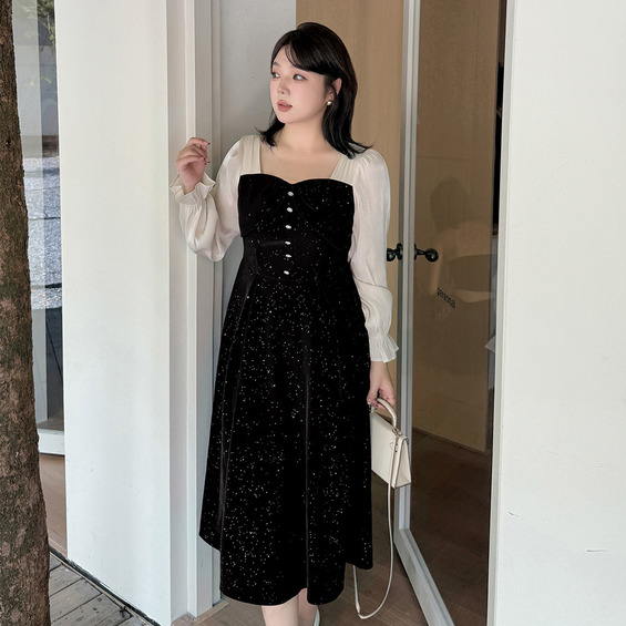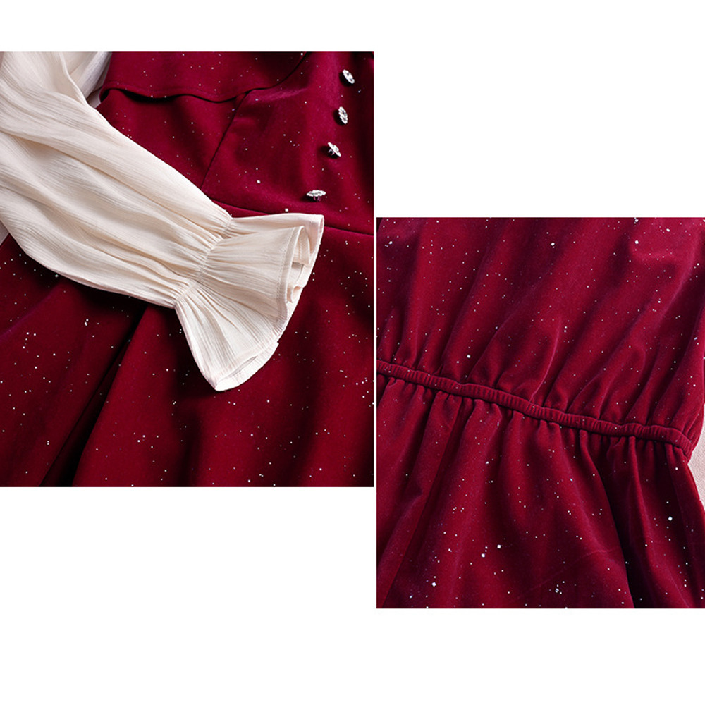 ブラウス重ね着風のシルバーラメを散りばめたベルベットフレアワンピース。