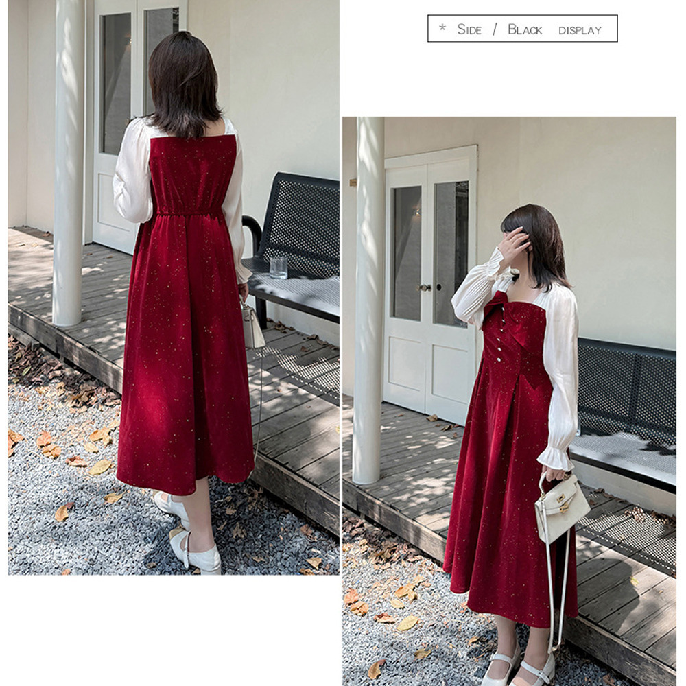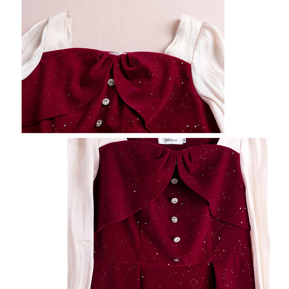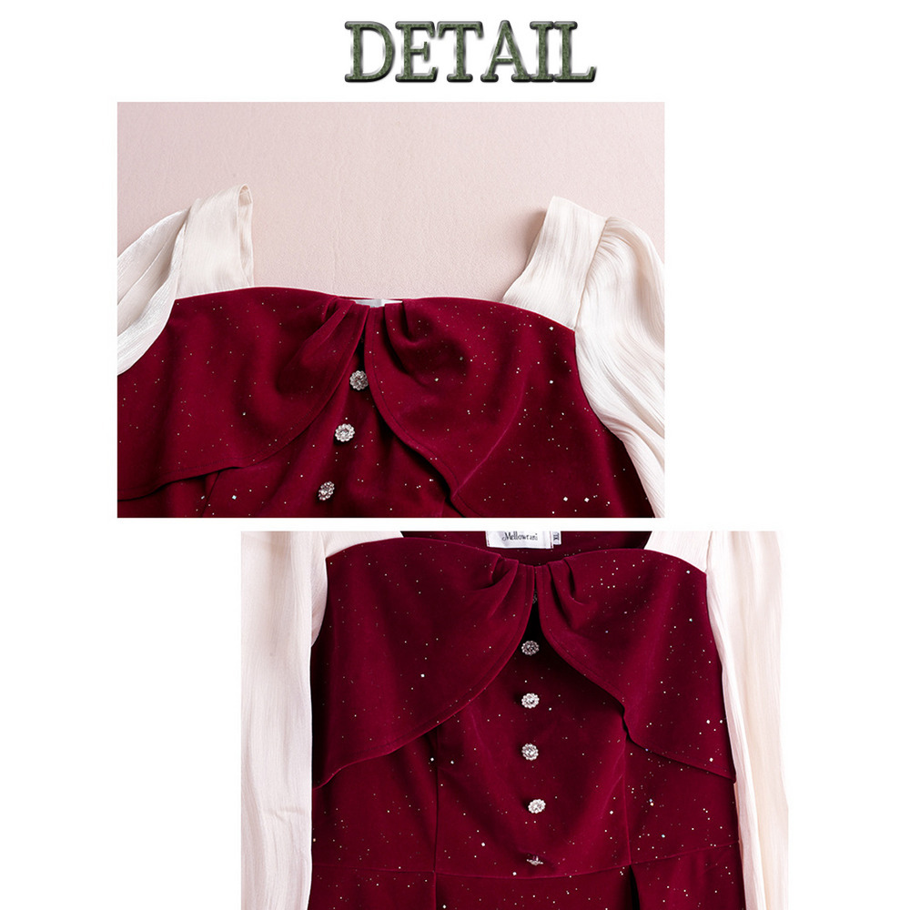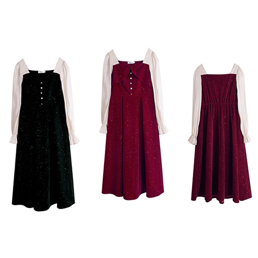 「3Dリボン付きスクエアネック 重ね着風ベルベットワンピース」