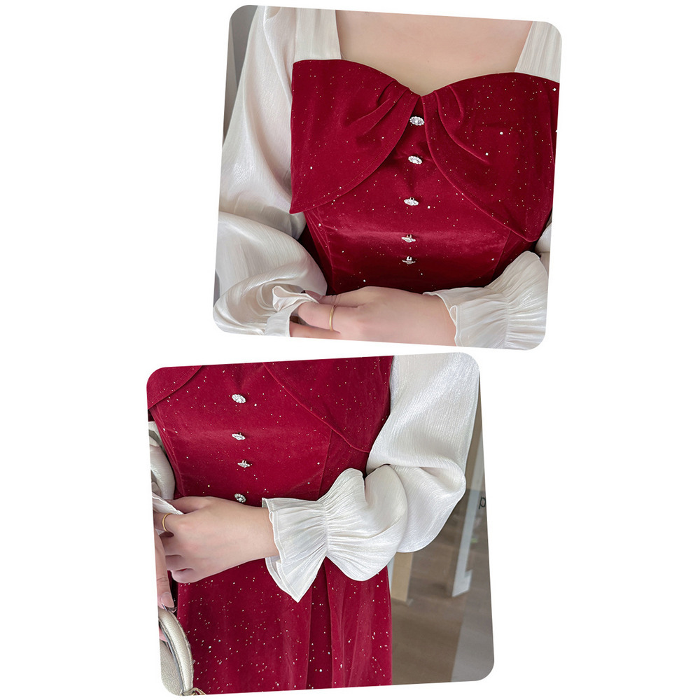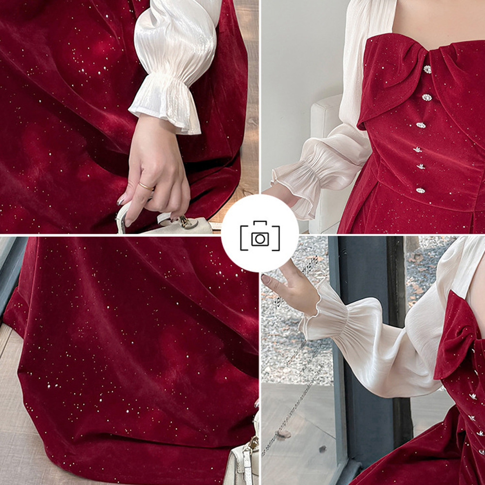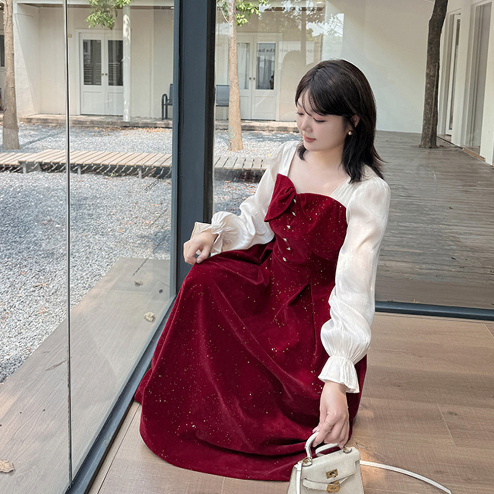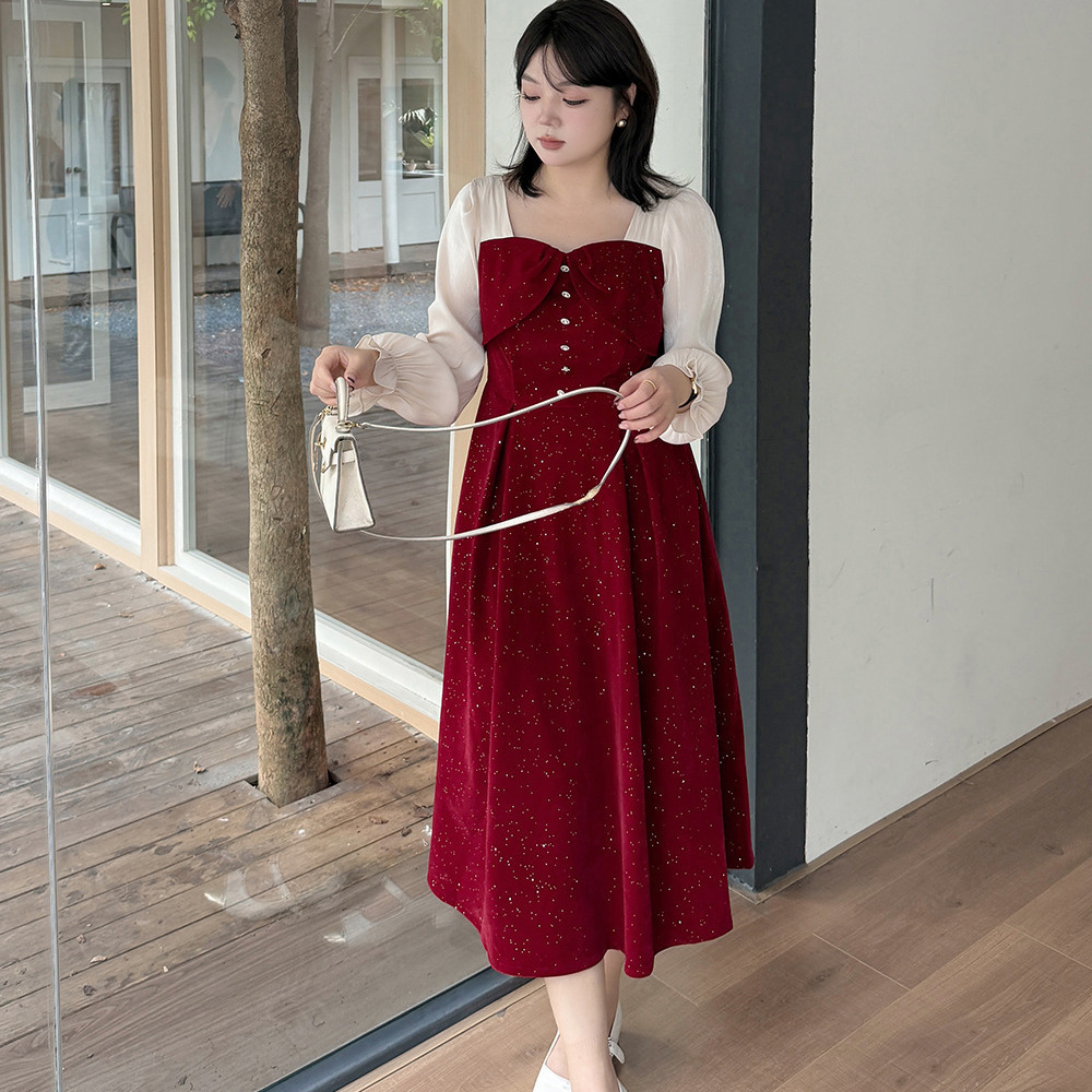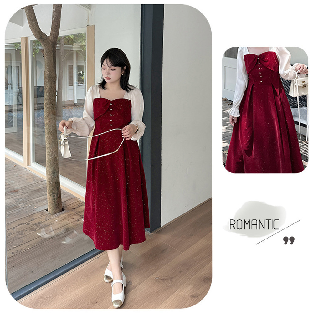 「3Dリボン付きスクエアネック 重ね着風ベルベットワンピース」