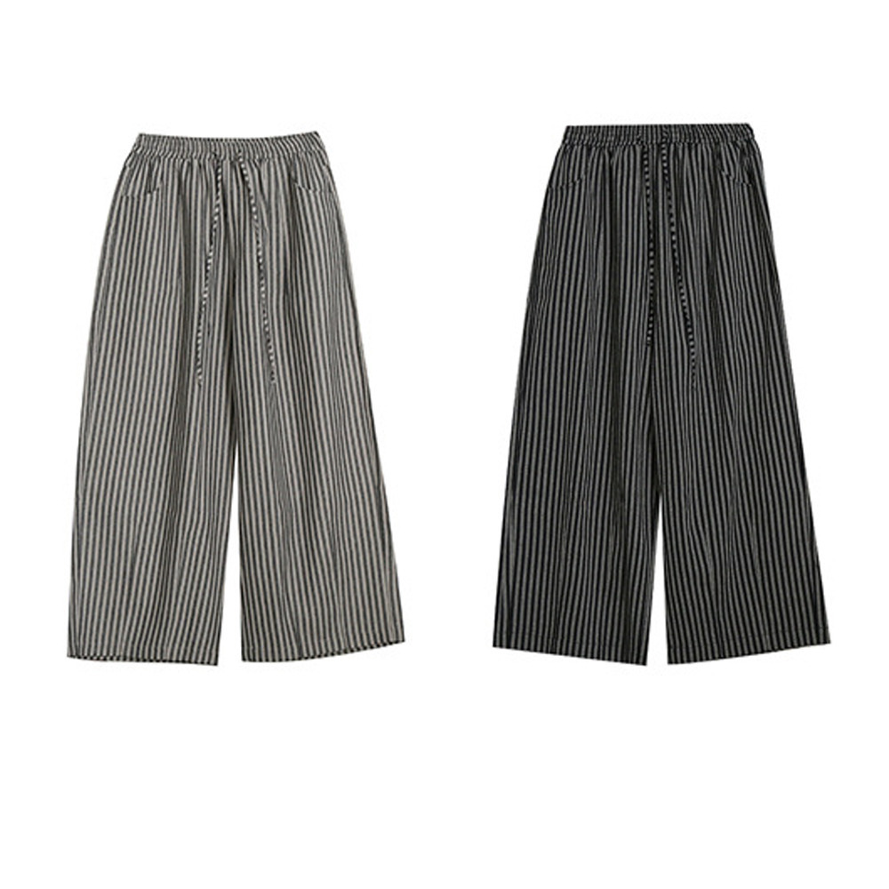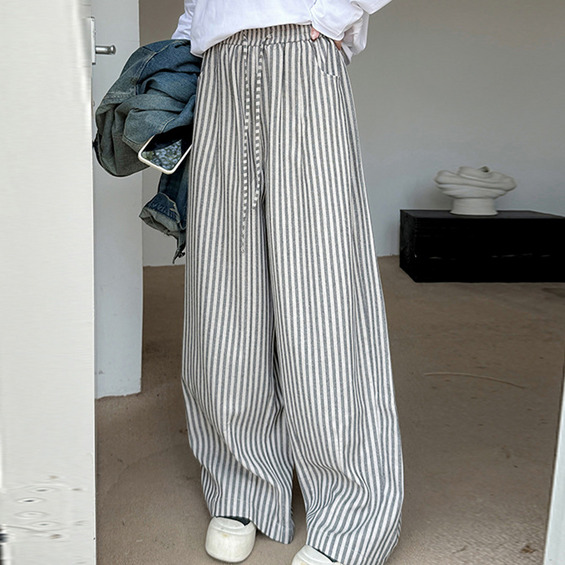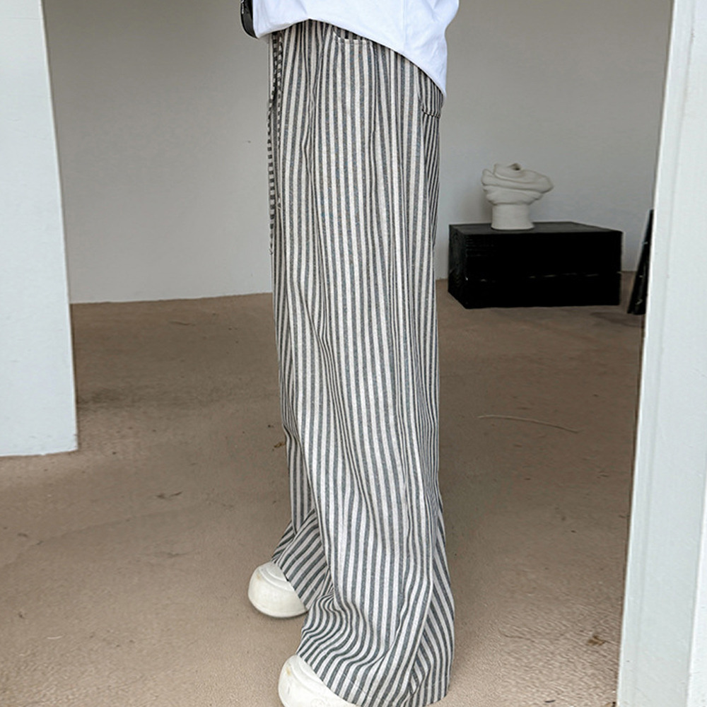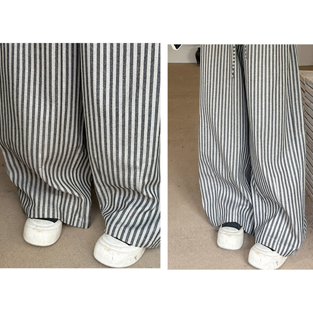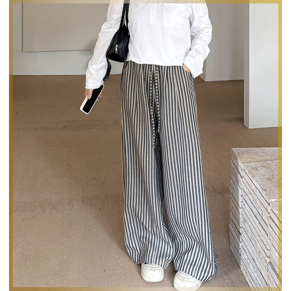 スッキリ魅せる縦ストライプ柄ウエストゴム ワイドストレートパンツ