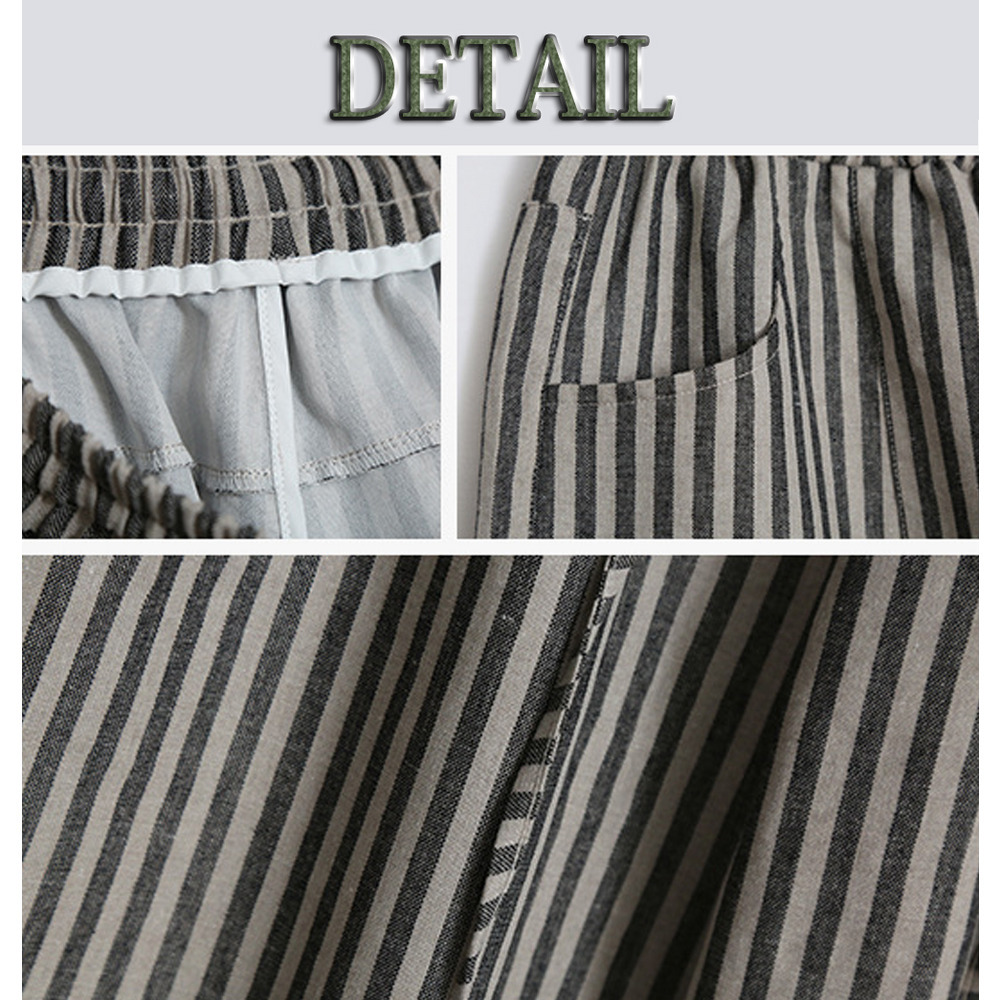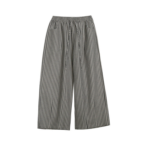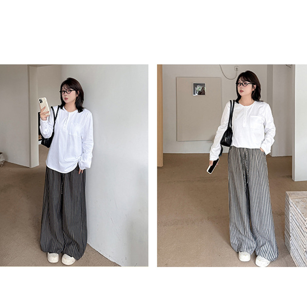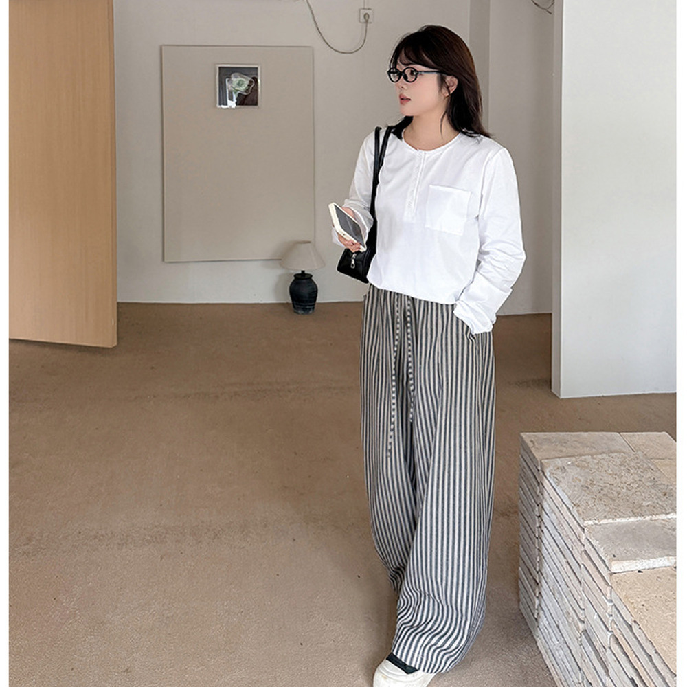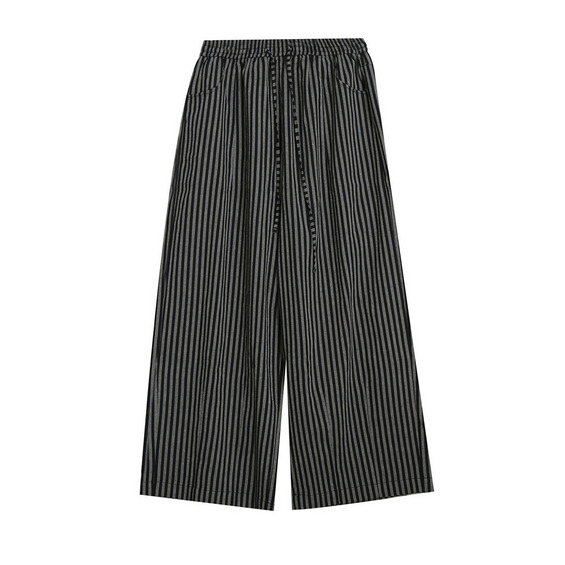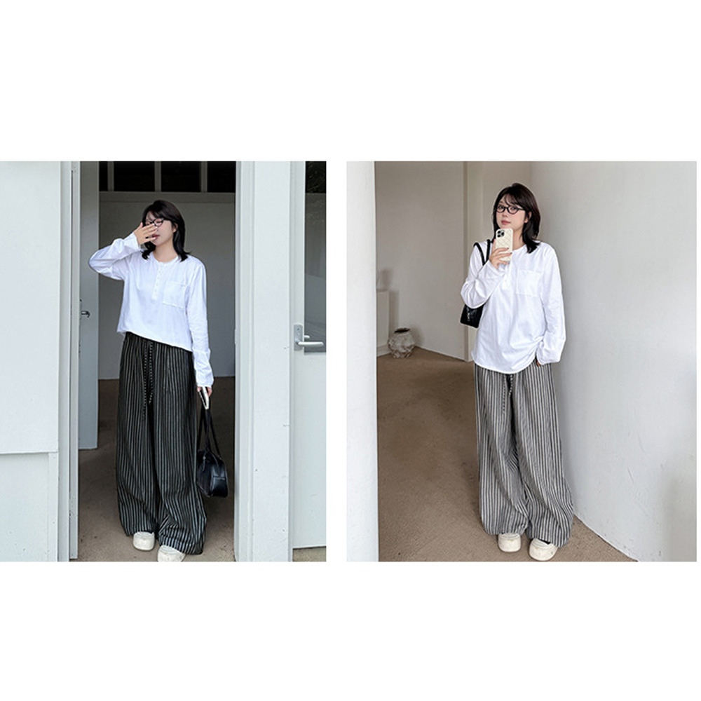 スッキリ魅せる縦ストライプ柄ウエストゴム ワイドストレートパンツ