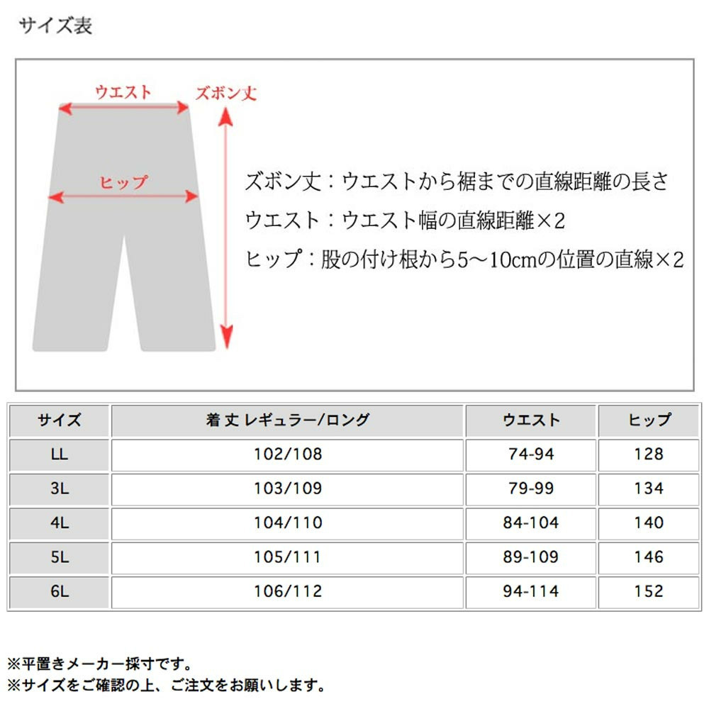 サイズ表記 LL 3L 4L 5L 6L 着丈 102cm 103cm 104cm 105cm 106cm ウエスト 74-94cm 79-99cm 84-104cm 89-109cm 94-114cm ヒップ 128cm 134cm 140cm 146cm 152cm