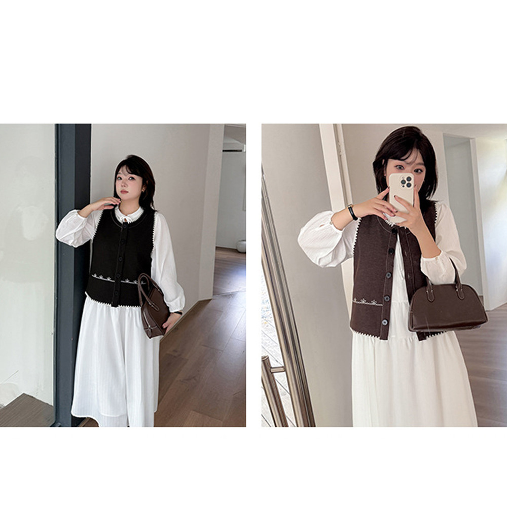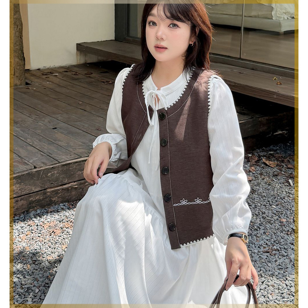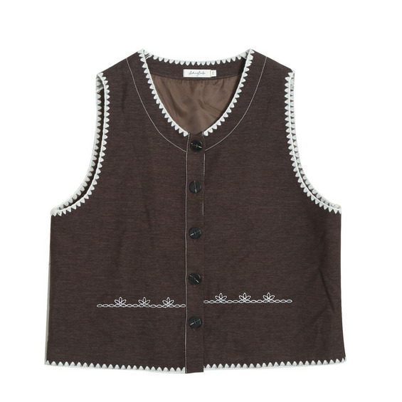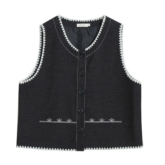 ベストはラウンドカラーでエッジとフロント下部にホワイトの刺繍入り。