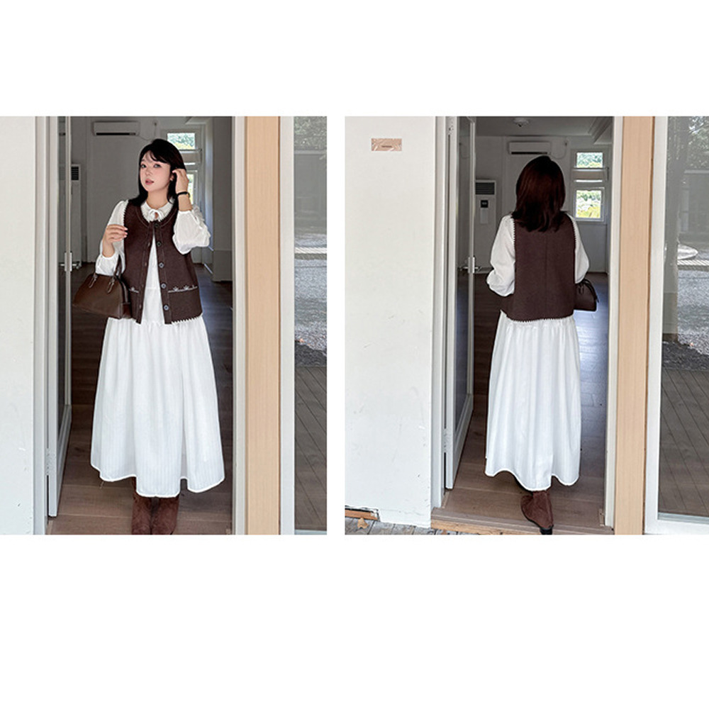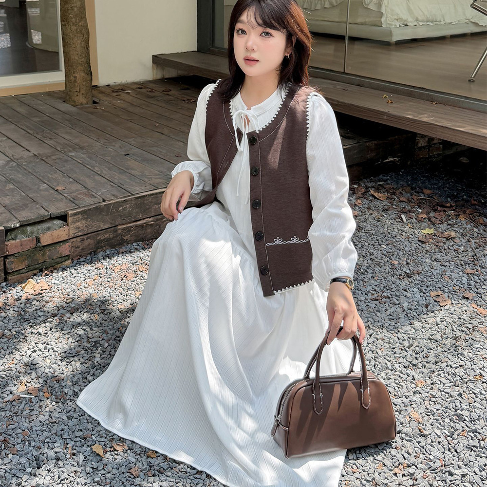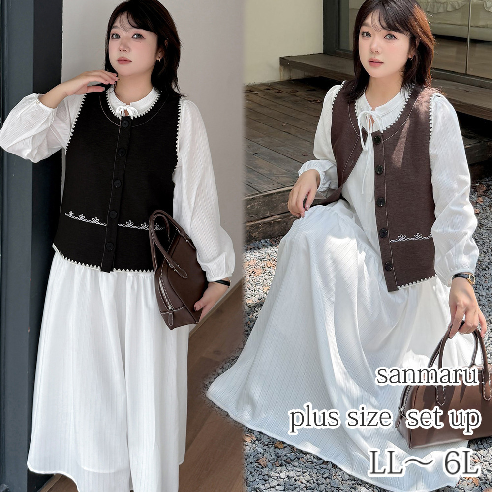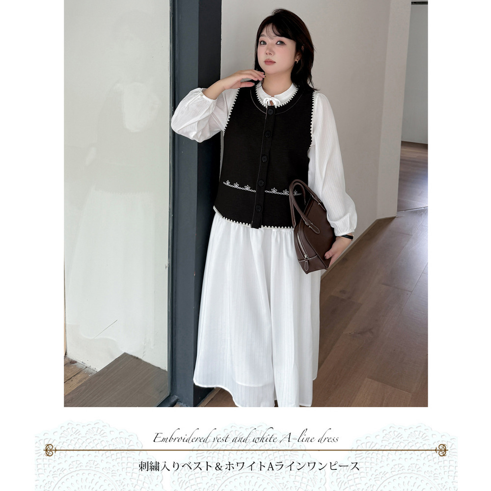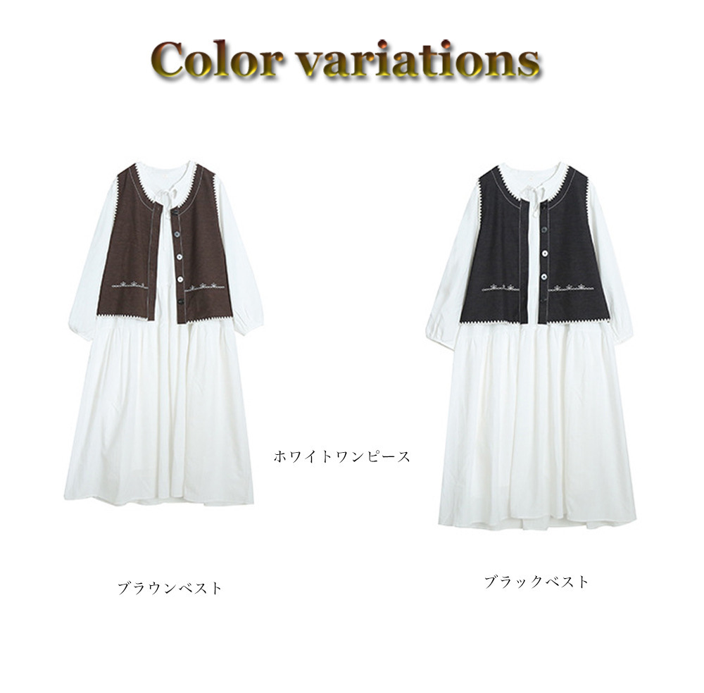 ホワイトワンピースにベスト2色バリエーションのセットアップ。