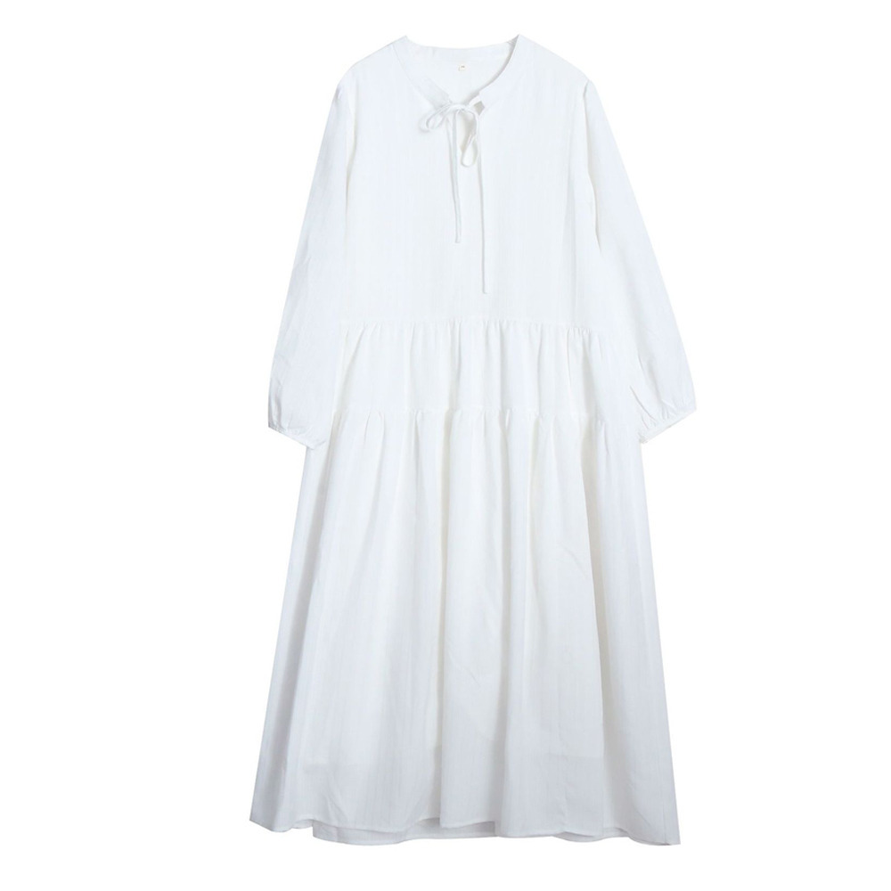 ワンピースはネックリボン付きのAラインティアードデザイン。